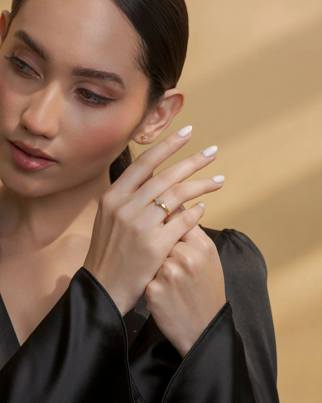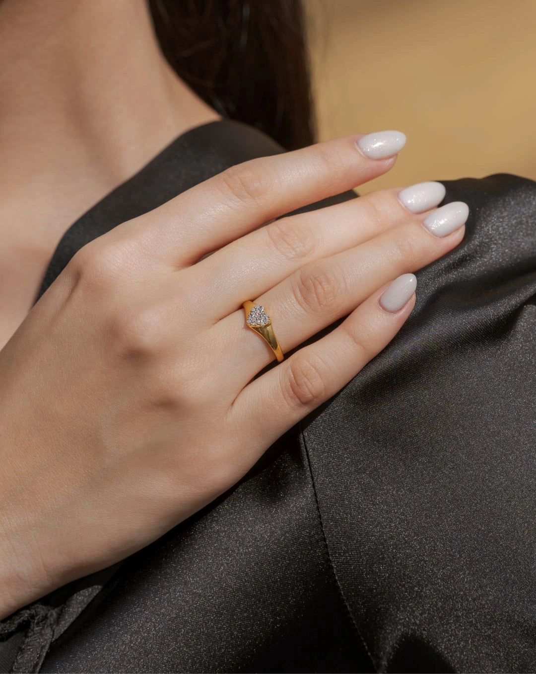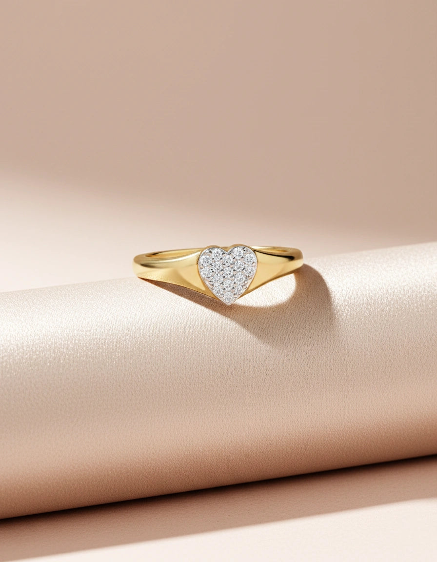 A delicate heart-shaped centerpiece set with sparkling stones for a romantic everyday look. Sleek and minimal band perfect for stacking or styling solo