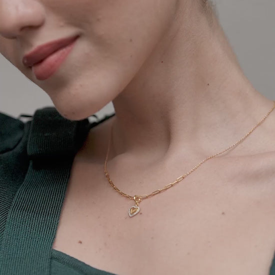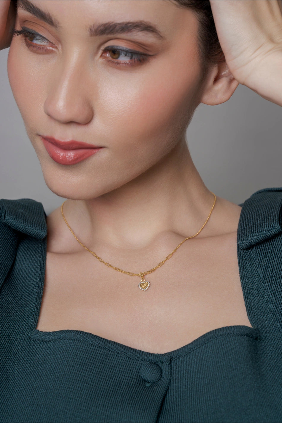A polished heart-shaped pendant engraved with the word 'love' and framed in a delicate row of shimmering stones.