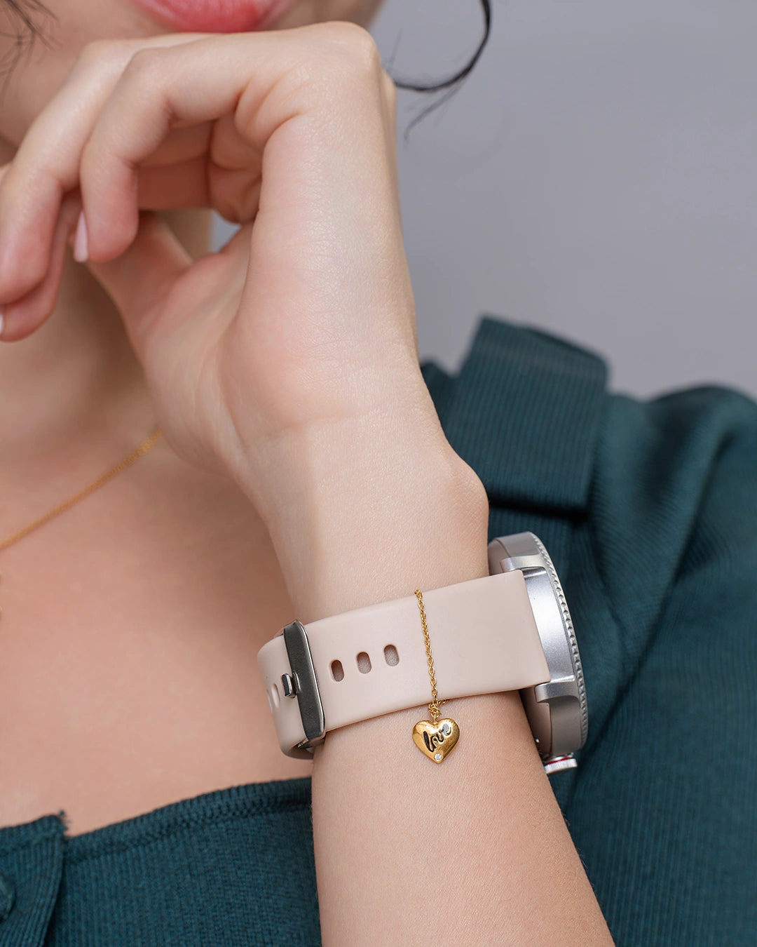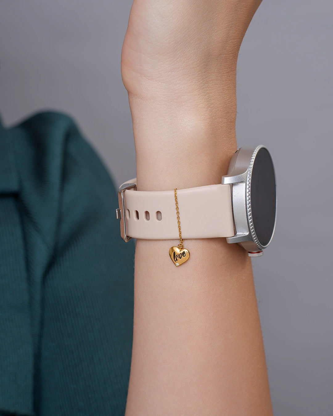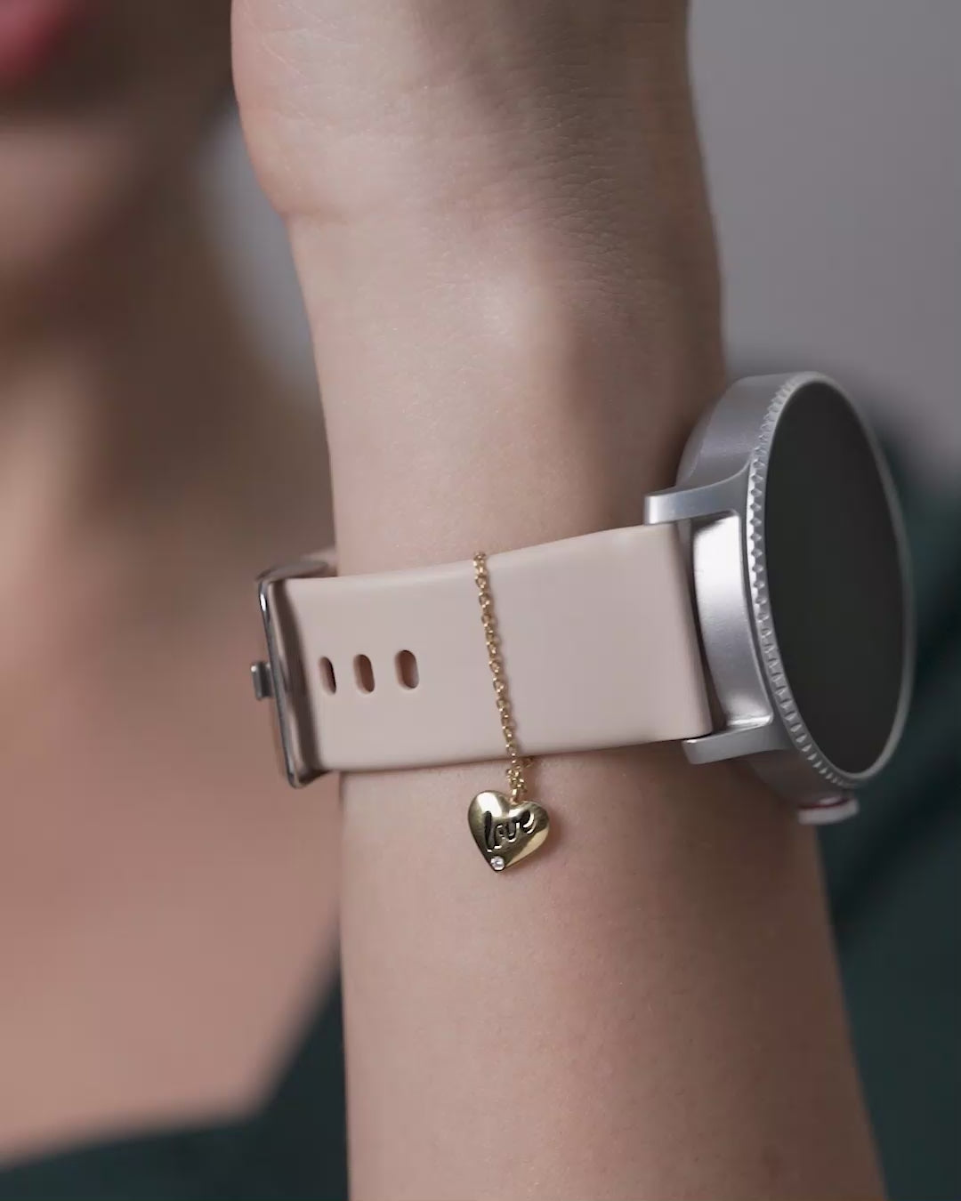 A puffy heart-shaped watch charm with the word 'love' engraved across its surface. The single moissanite accent below adds just the right amount of sparkle, making it romantic and fashionable.