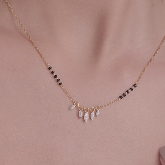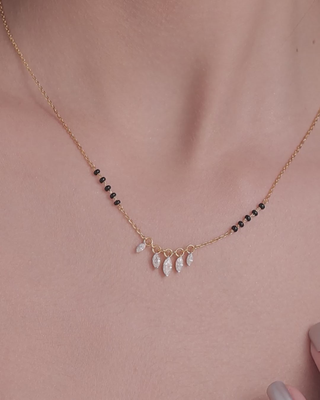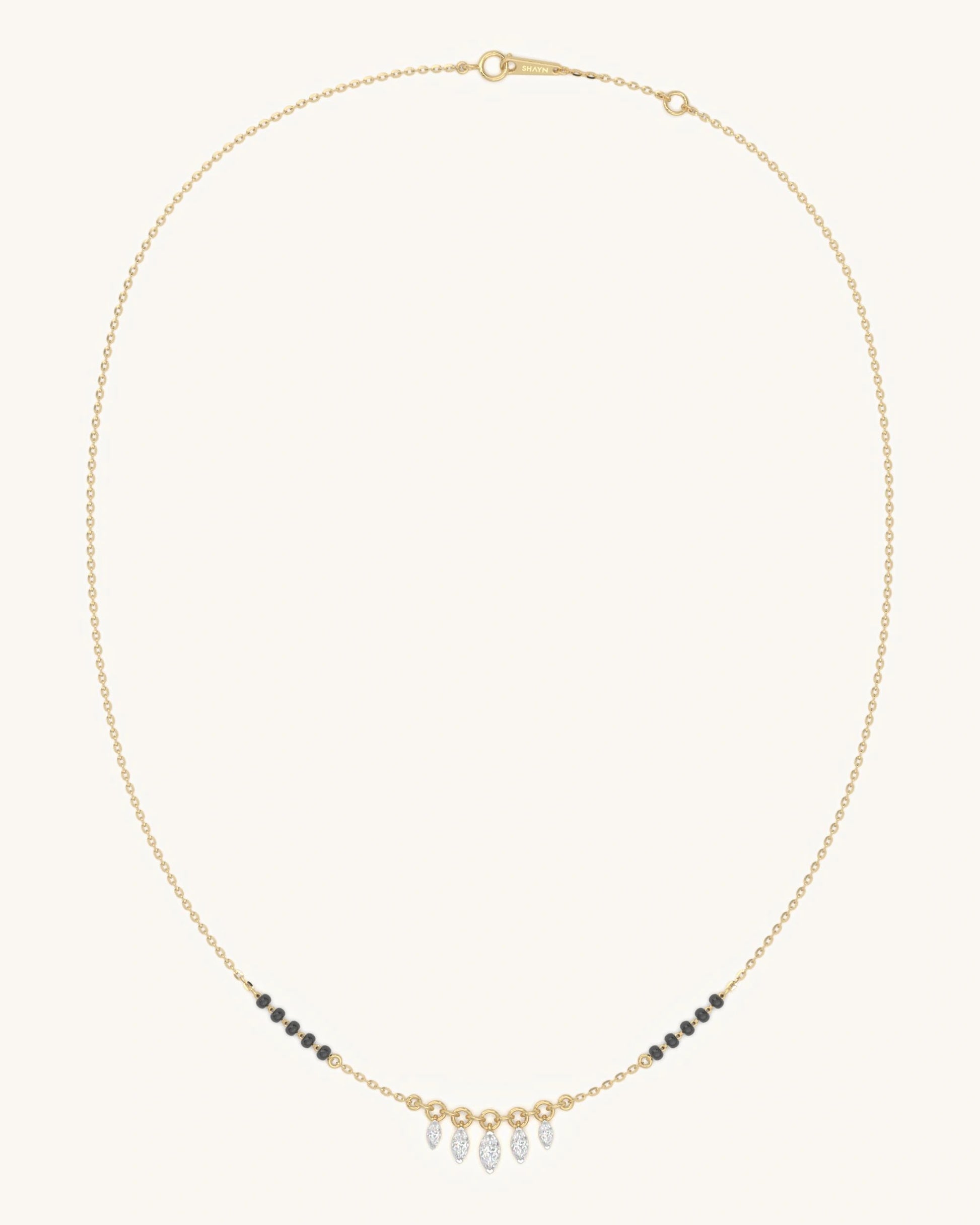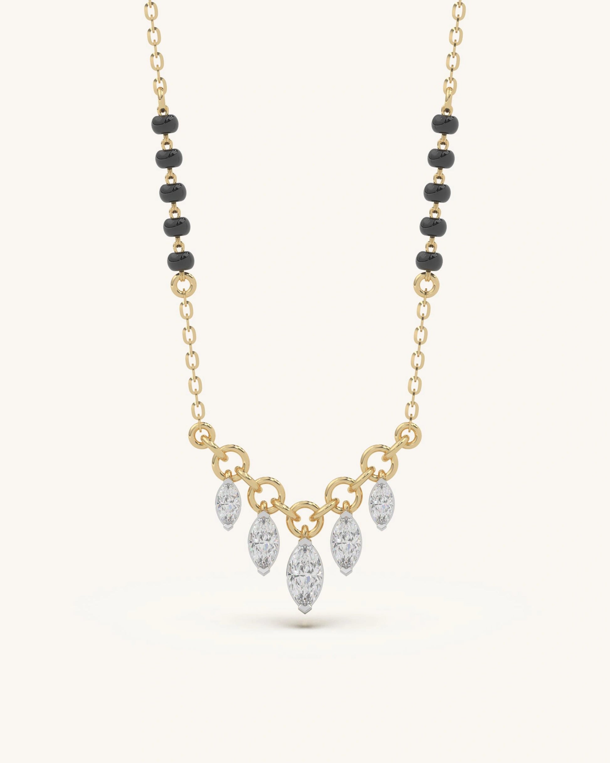 mangalsutra showcases a graceful fBande of five dangling marquise-cut Moissanites. The interlocking gold links and traditional black bead chain complete the elegant, movement-filled design.
