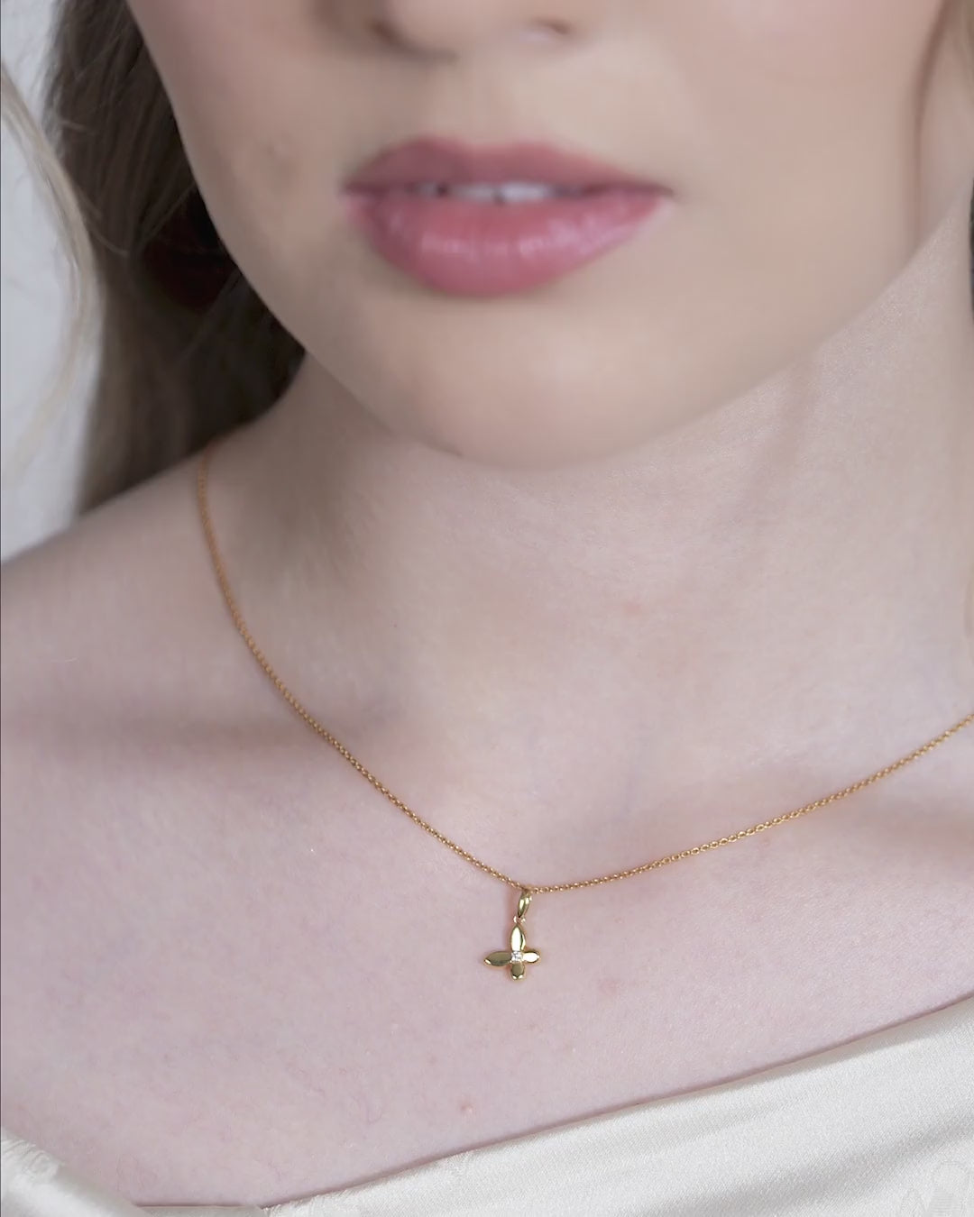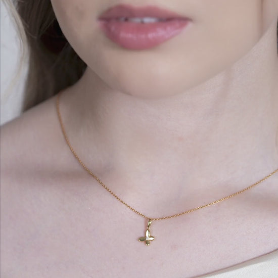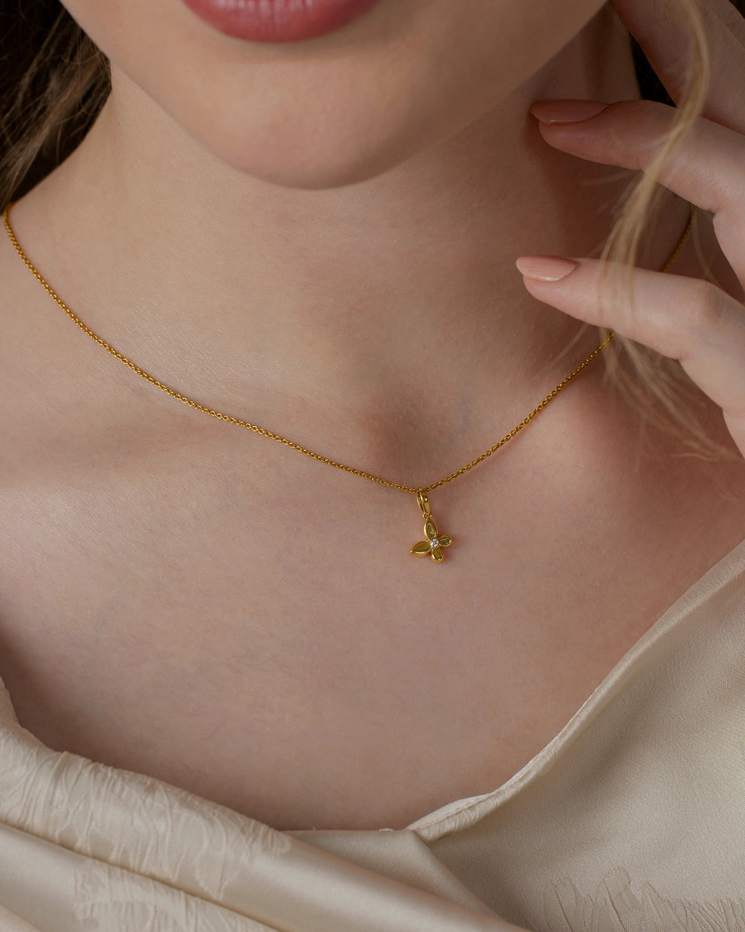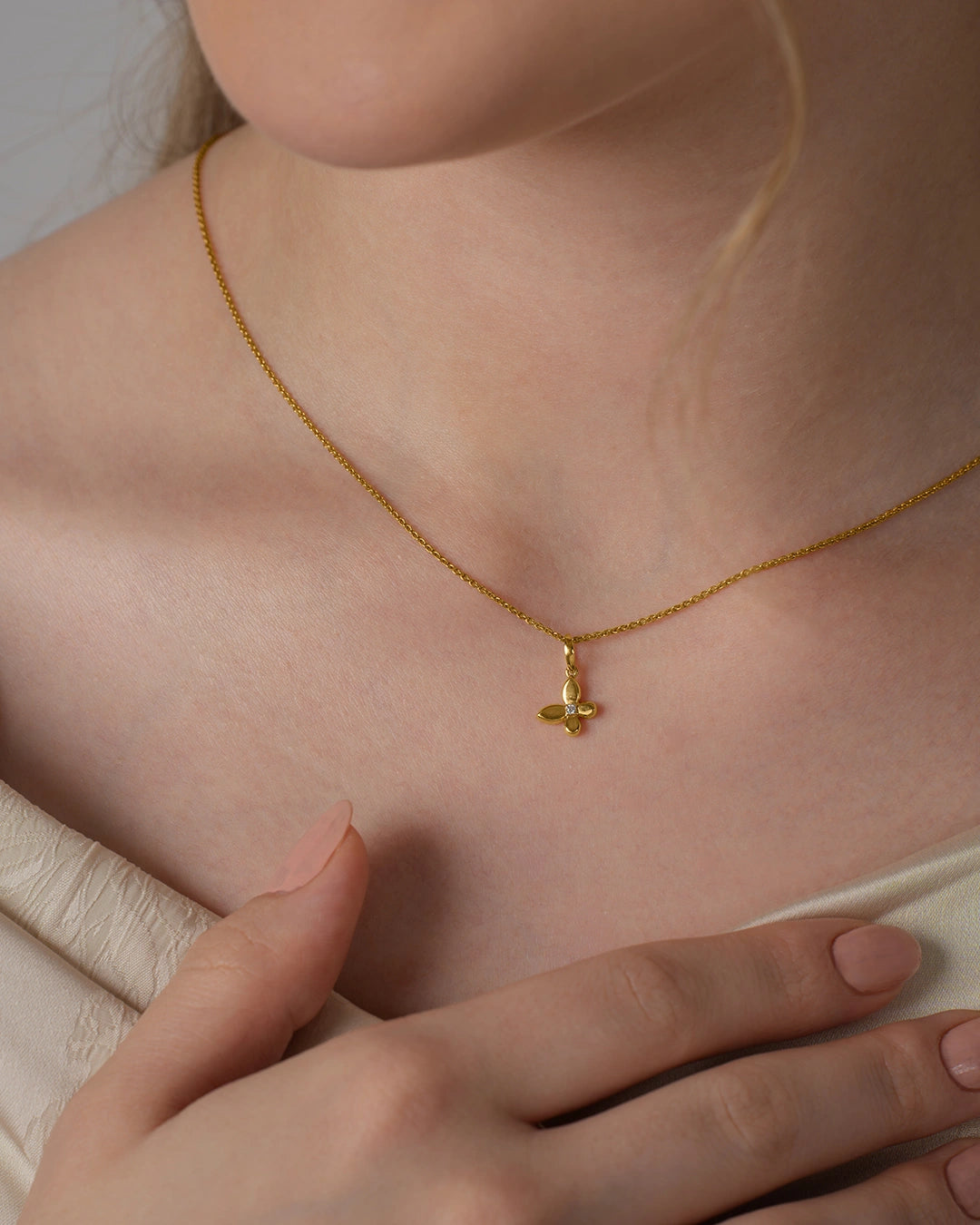 A modern butterfly form composed of four pointed gold petals surrounds a single shimmering diamond for a clean and minimal statement.