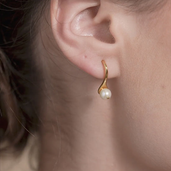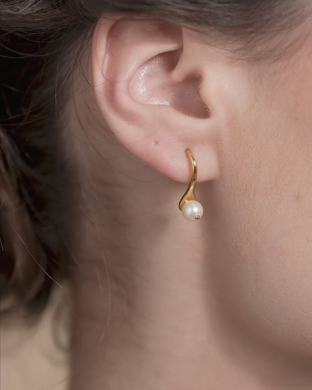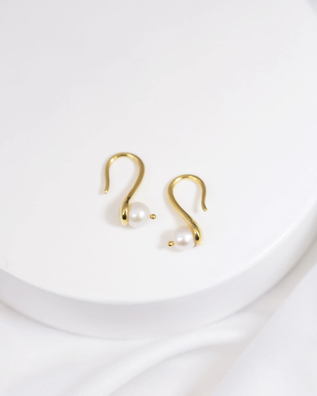 Designed with a long golden hook and a single round pearl at the base, these earrings bring a soft yet striking touch. The elegant curve adds motion and flow while remaining simple and tasteful.