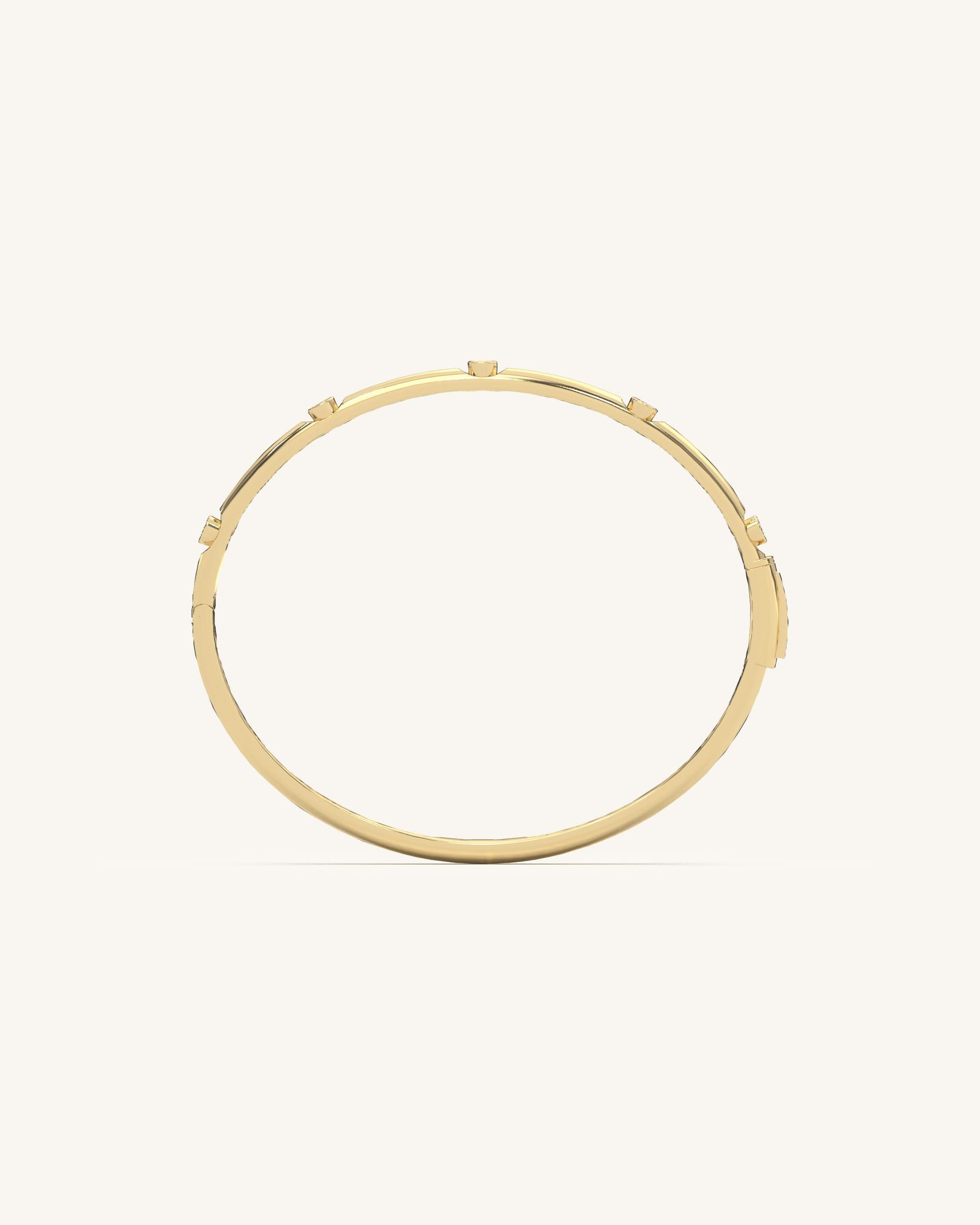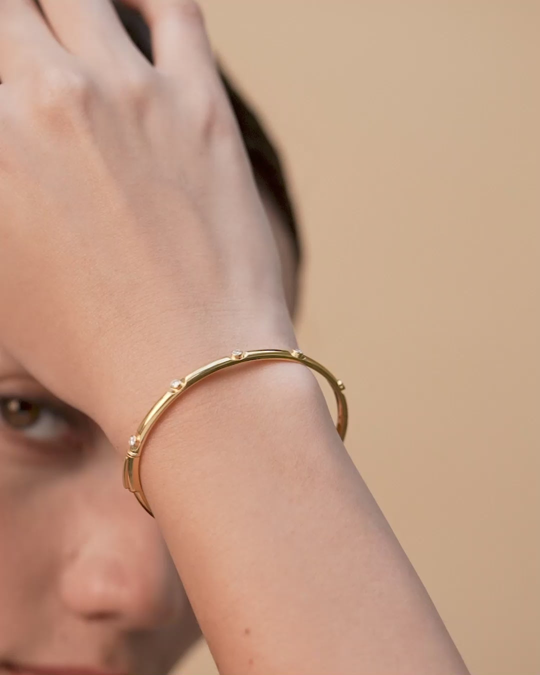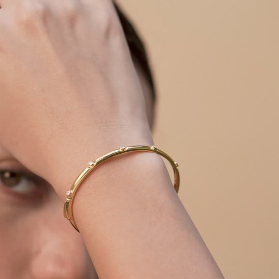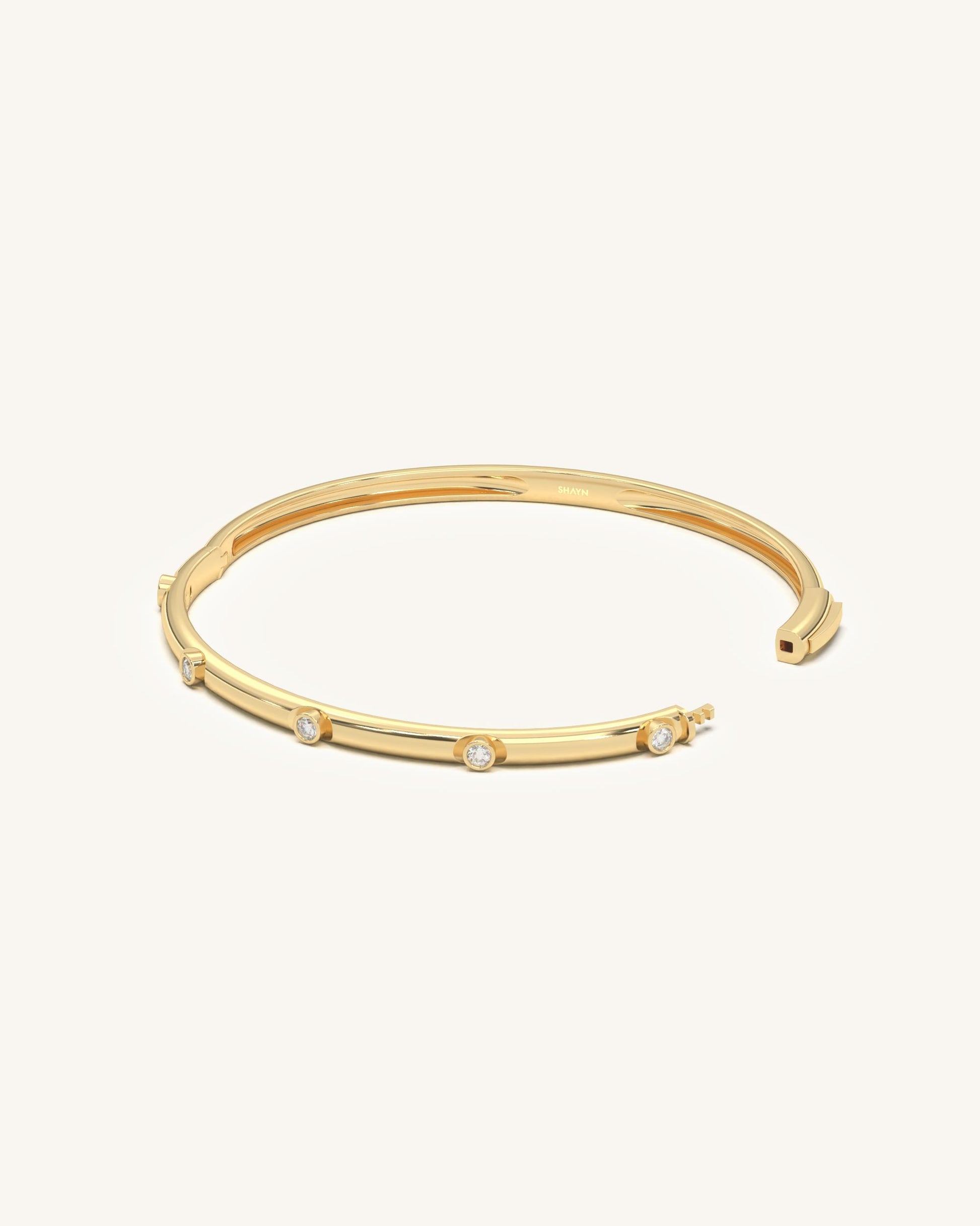 A sleek open bangle bracelet with evenly spaced round moissanite diamonds bezel-set along a smooth gold band, offering a minimalist yet elegant appeal.