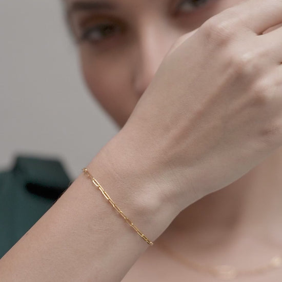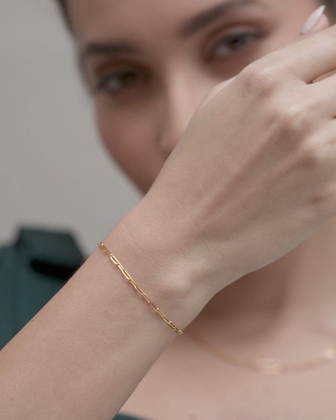 This bracelet features a sleek pattern of elongated rectangular links that add a linear and stylish rhythm to the wrist. Lightweight and refined for daily wear.