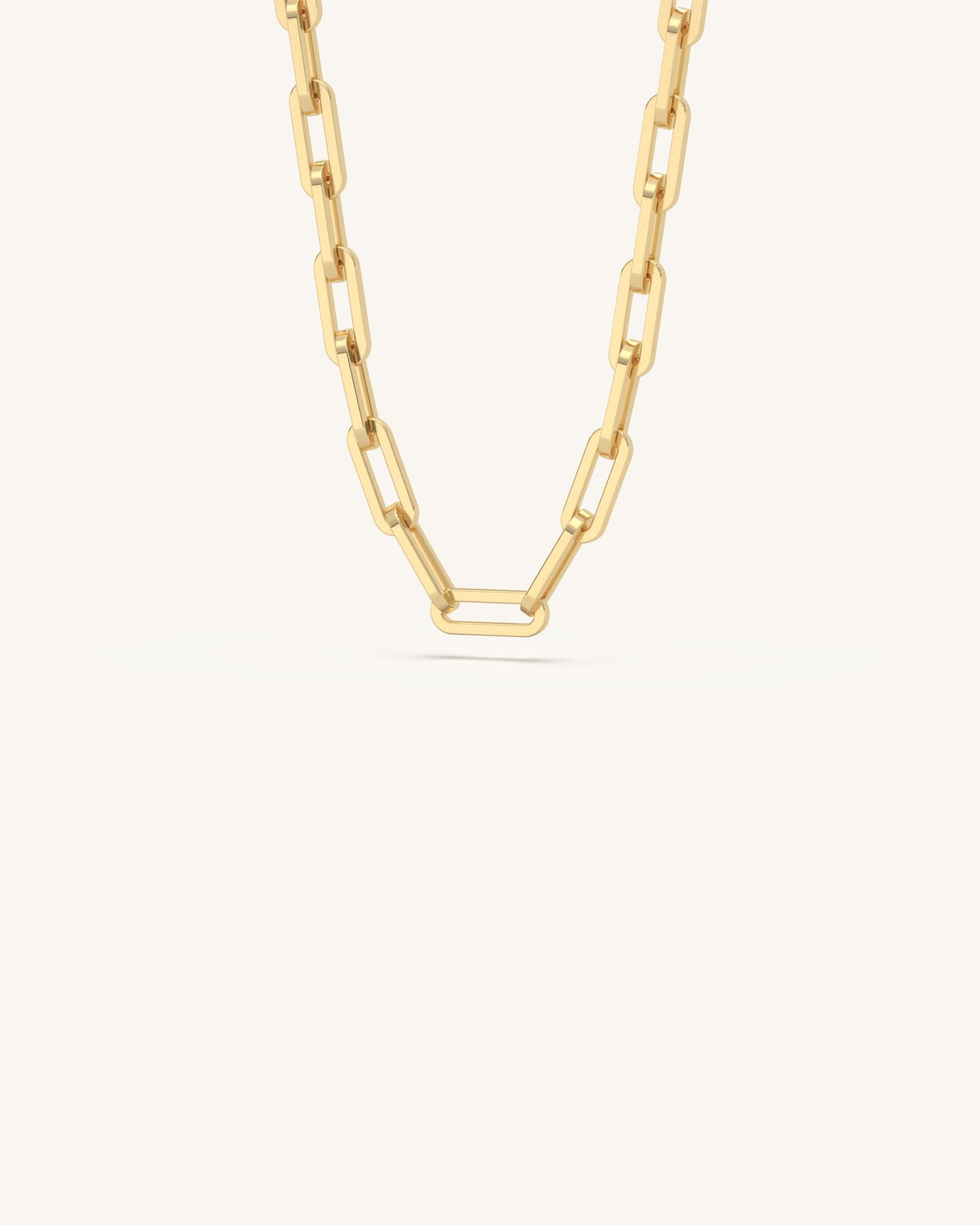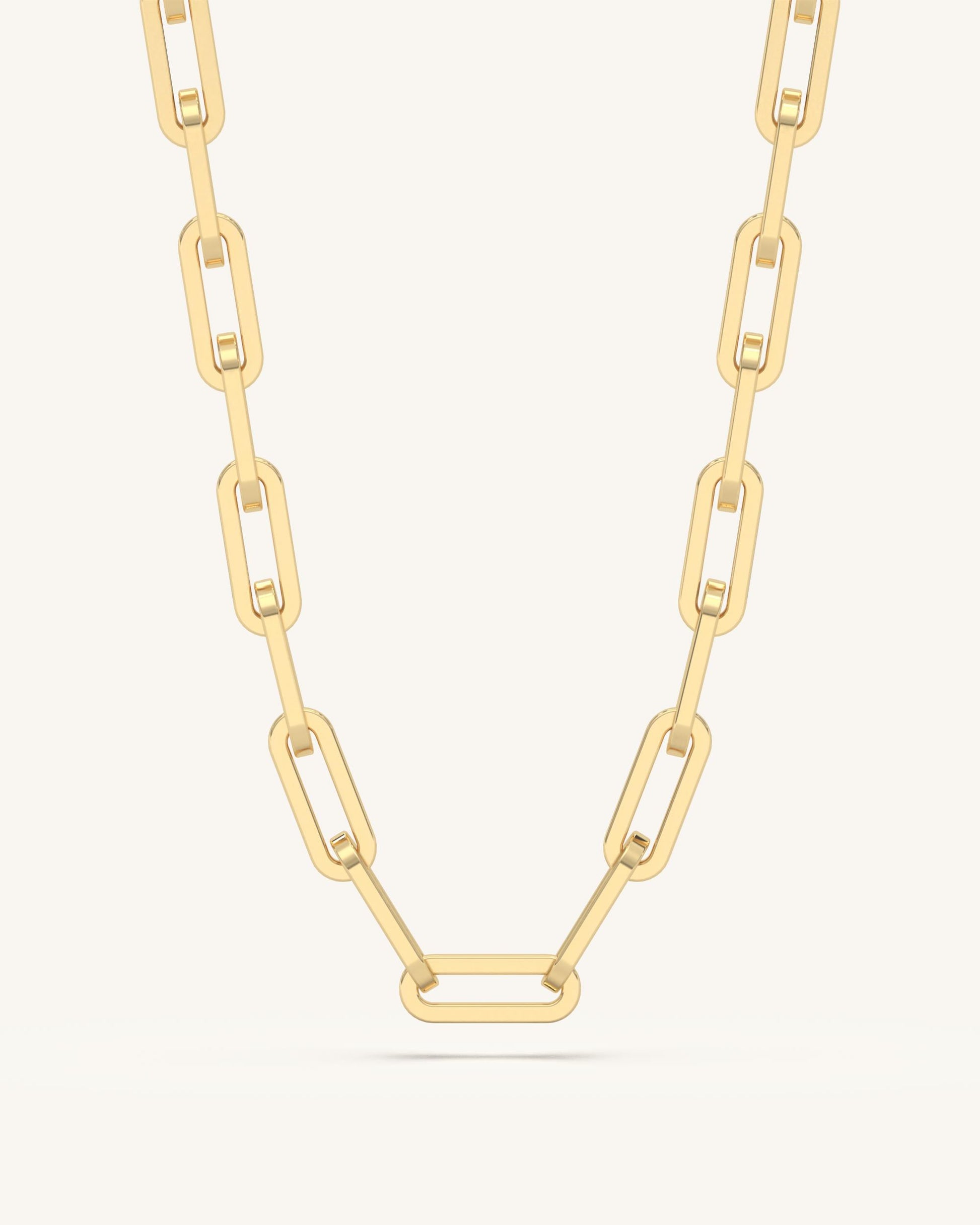 Chunky gold necklace with large rectangular links for a bold, statement finish.