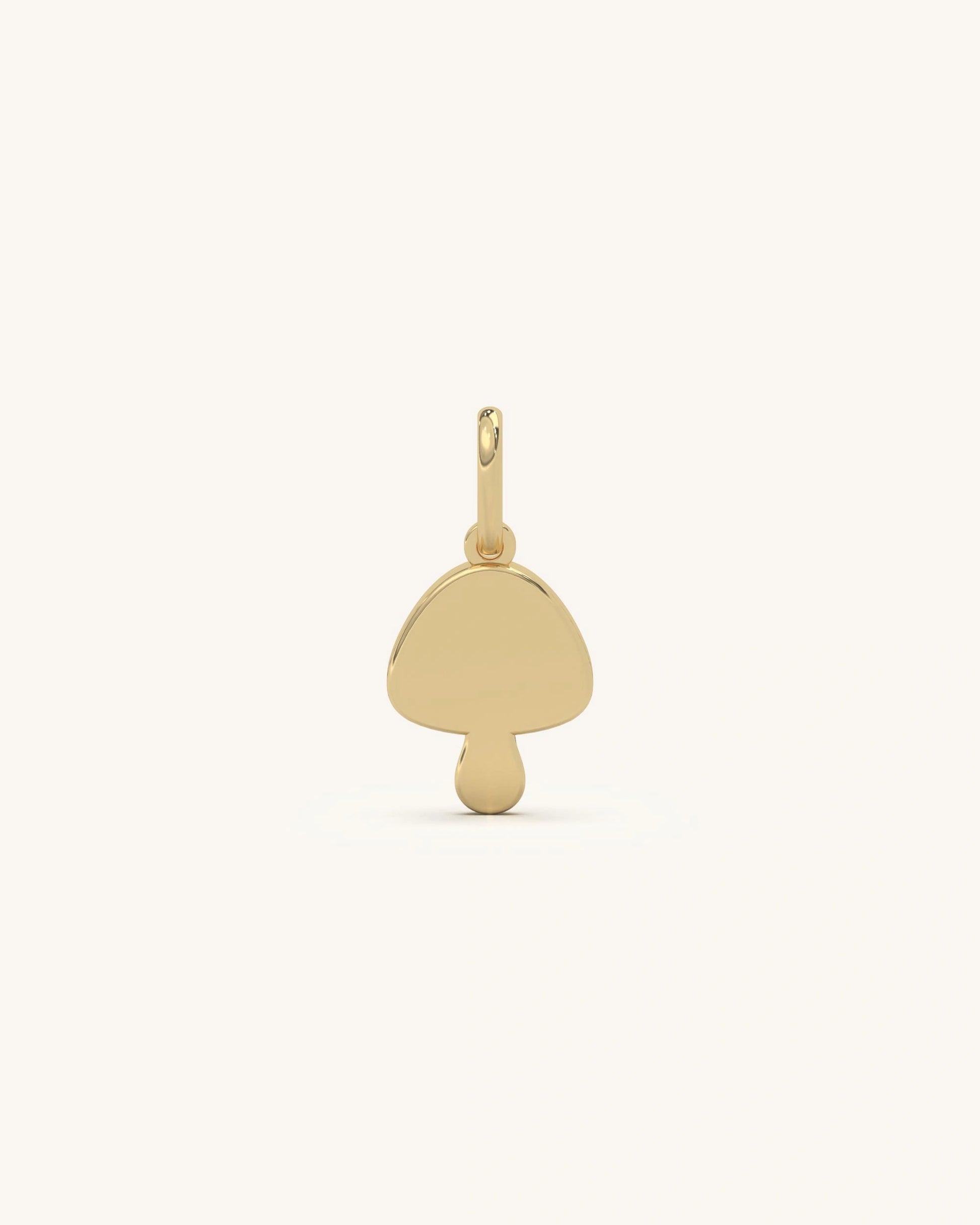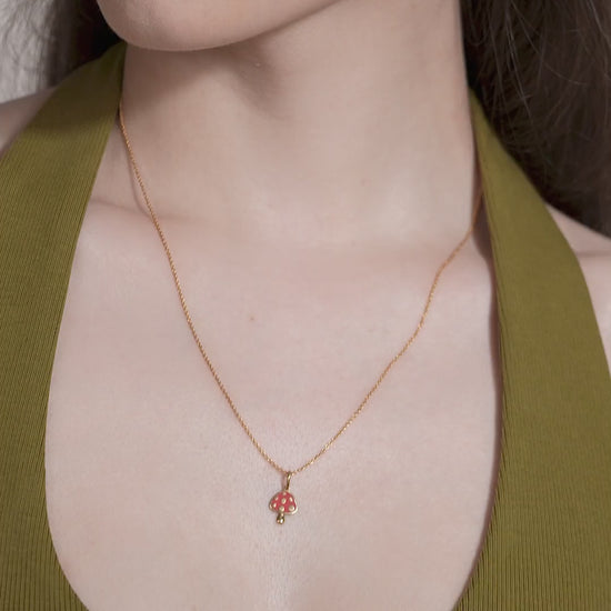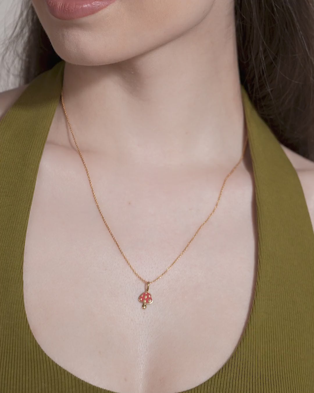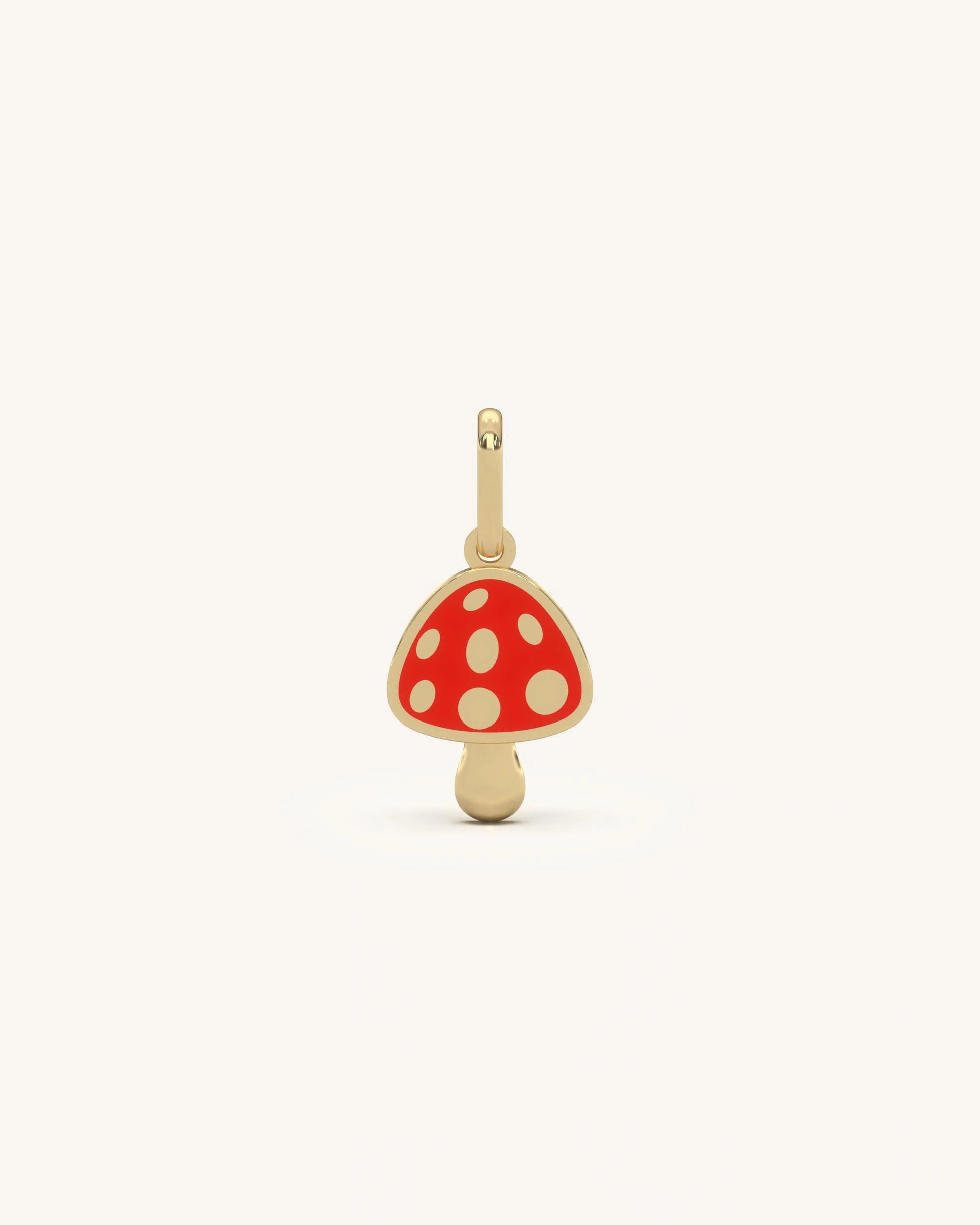A charming mushroom-shaped pendant in bright red enamel with white spots. Its playful and rounded design adds a fun, storybook-like charm to casual or quirky outfits.