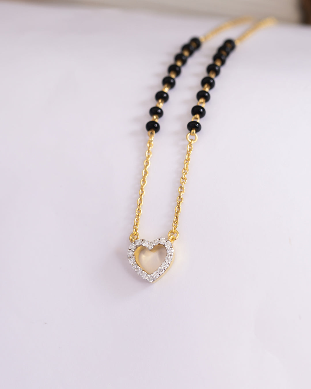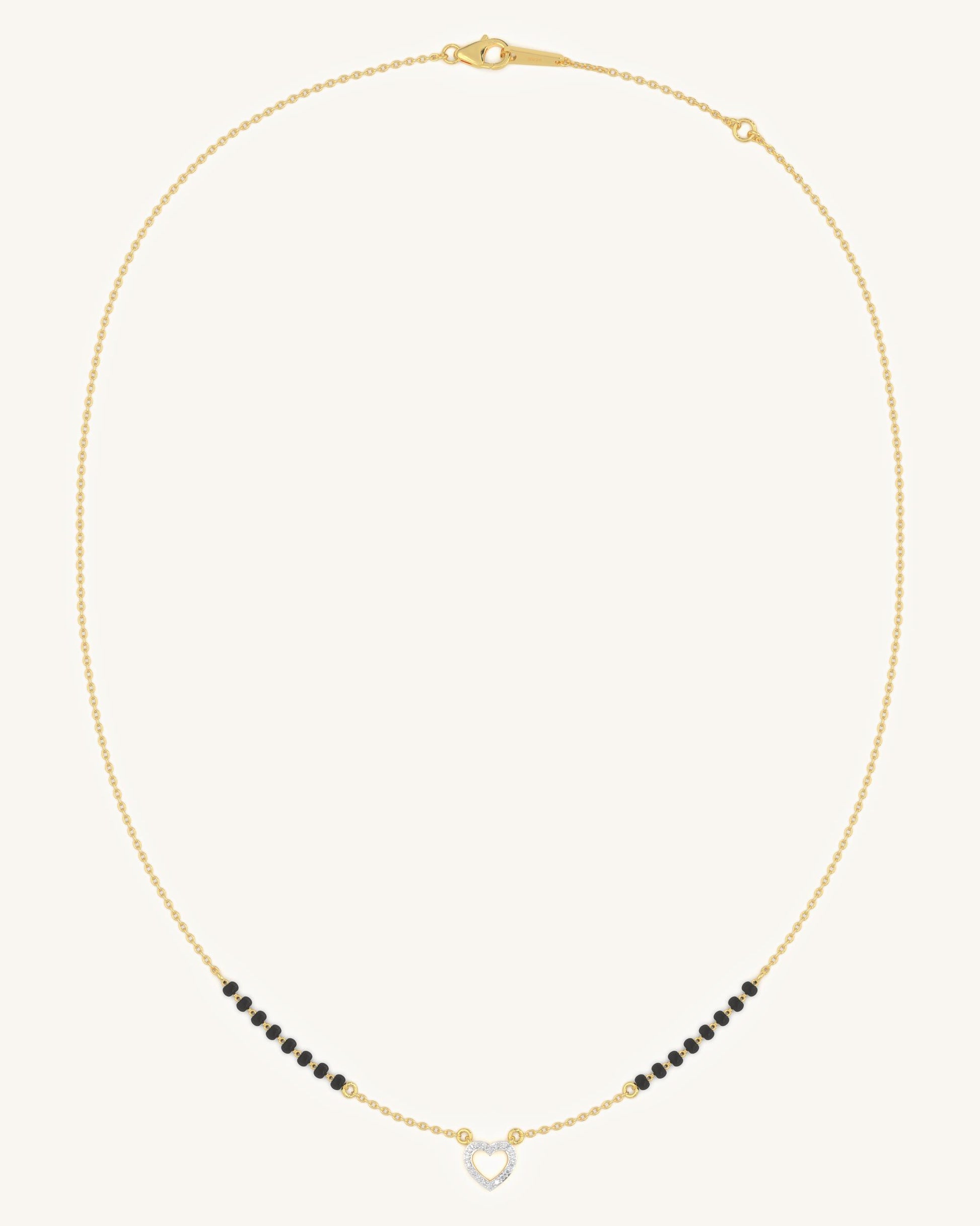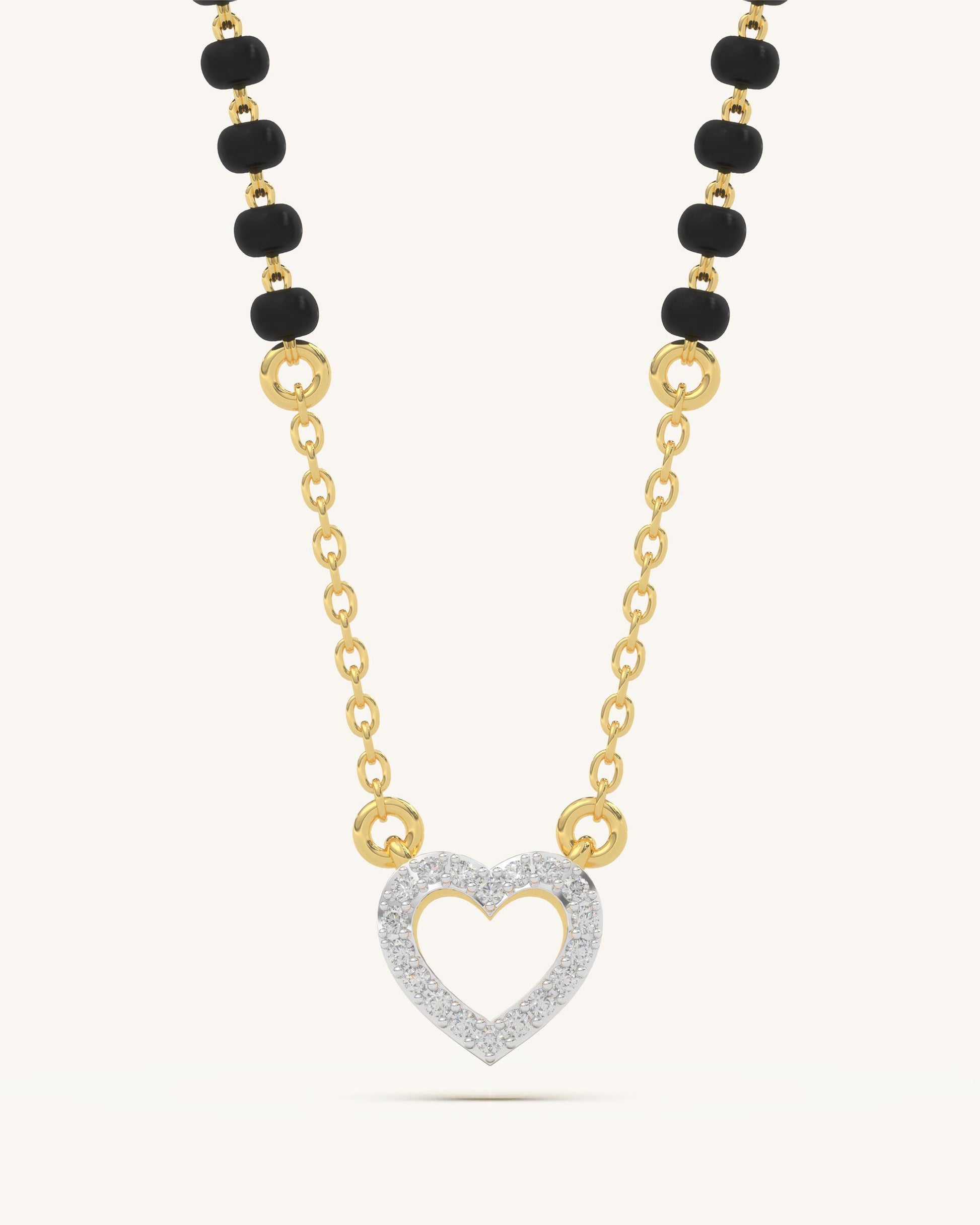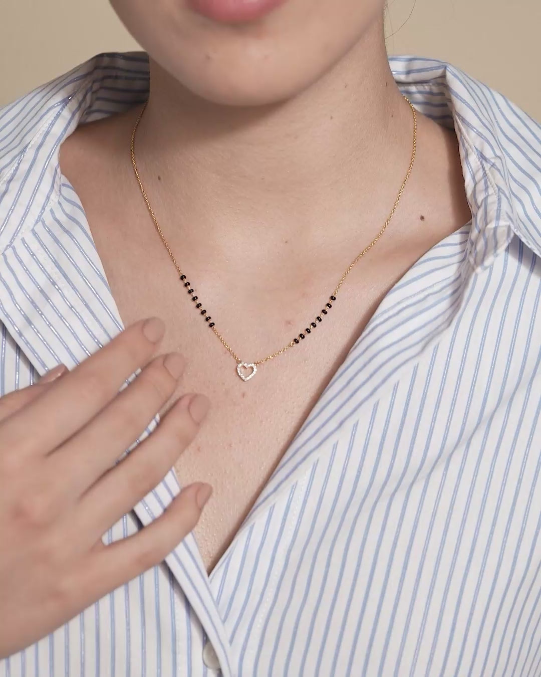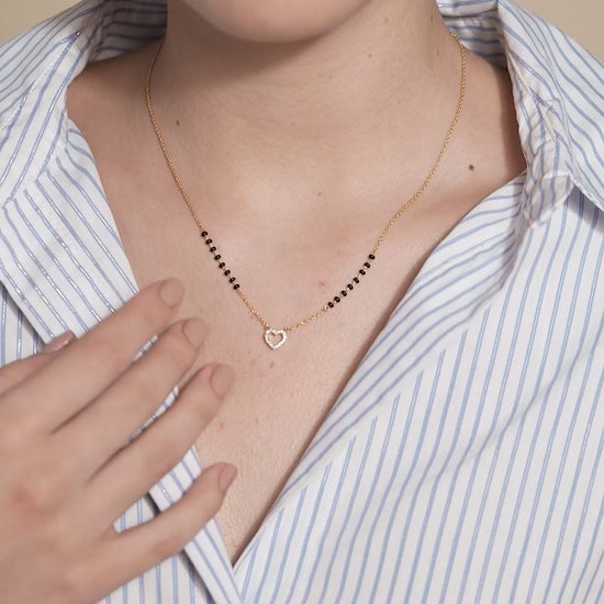 A delicate mangalsutra with black beads and a diamond lined open heart center pendant for a soft romantic feel.