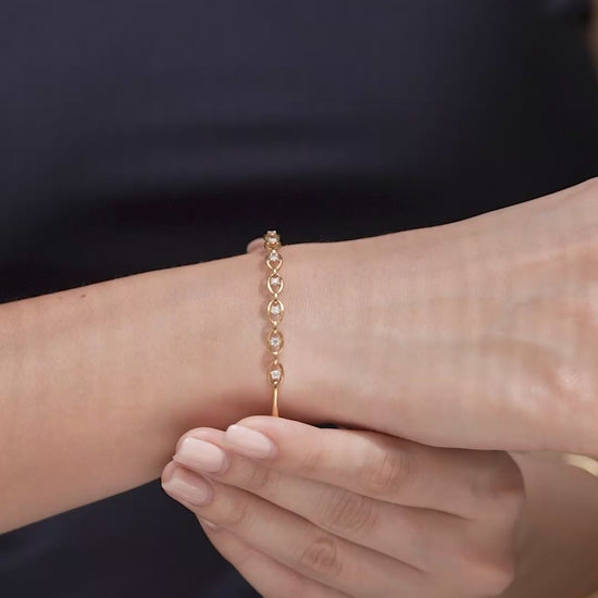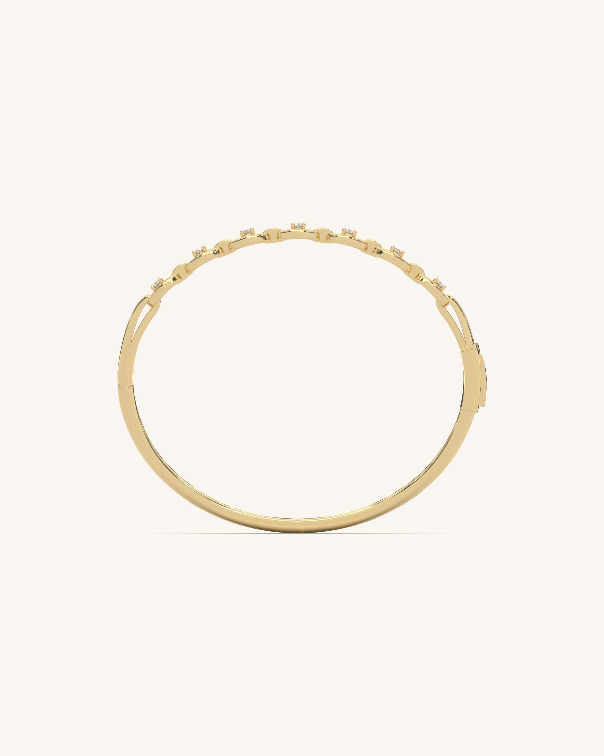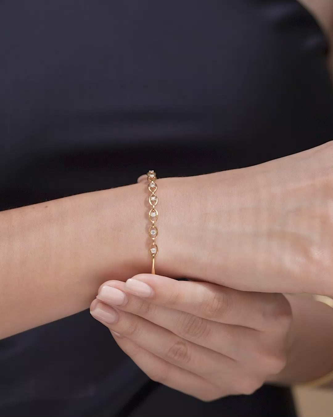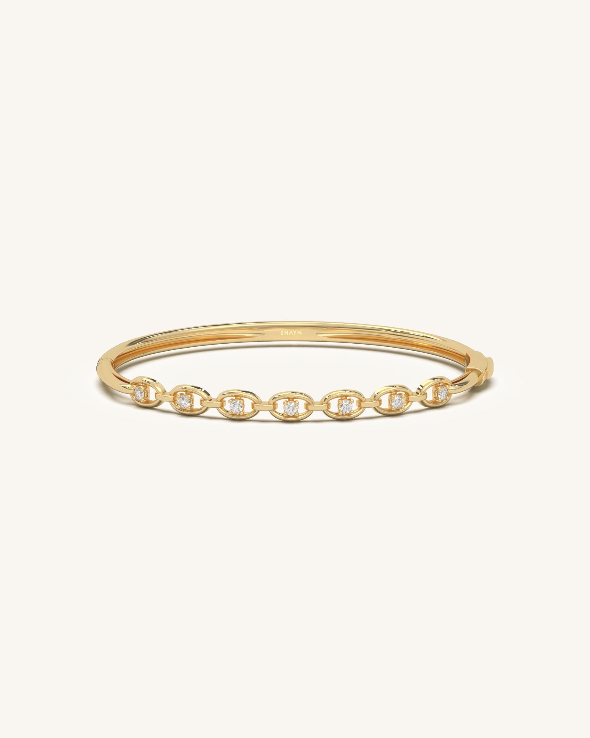 A contemporary twist on the chain bracelet, this open bangle showcases gold oval links set with brilliant moissanite diamonds, merging structured design with sparkle.