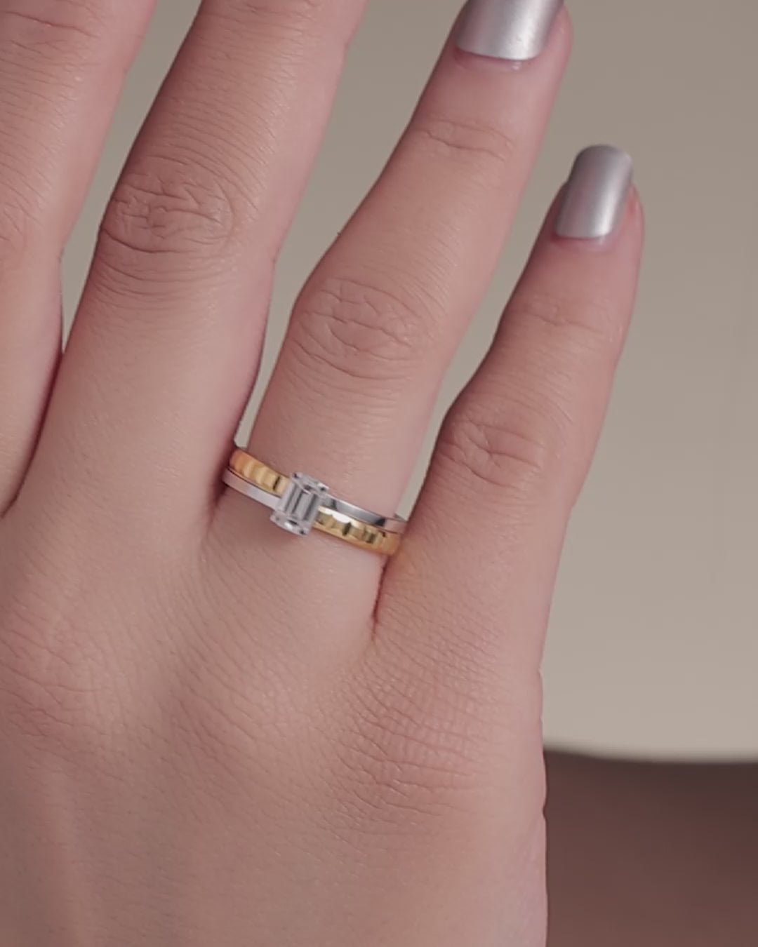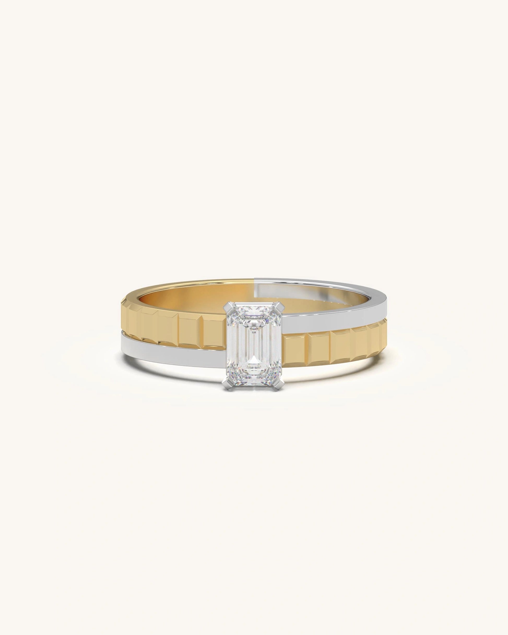 A graceful pear-cut solitaire set on a ribbed gold stripe band framed with polished silver edges. Elegant and timeless.