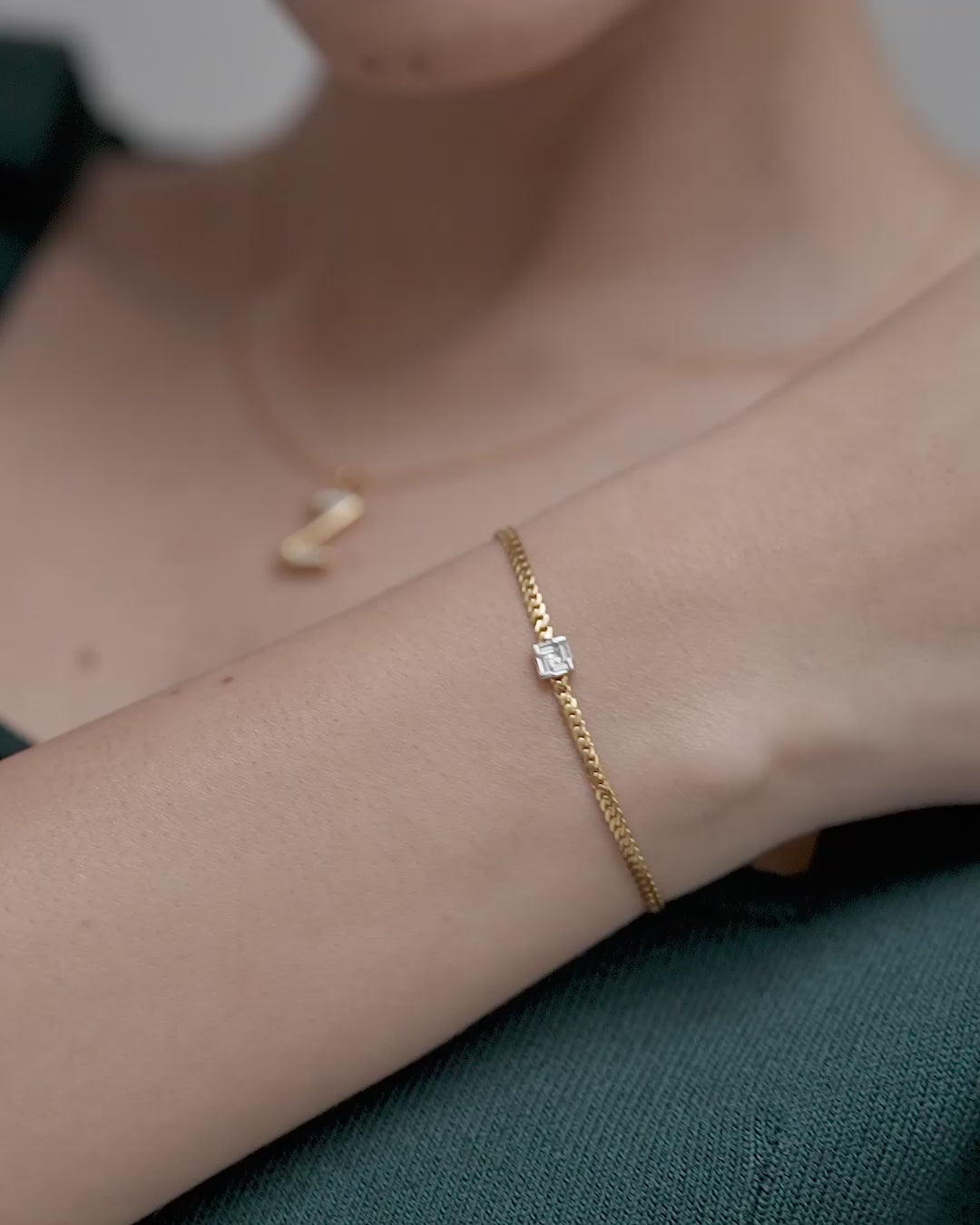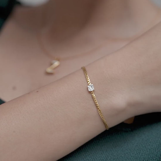 Minimal elegance defined by a single square-cut diamond set at the center of a rose gold bracelet.