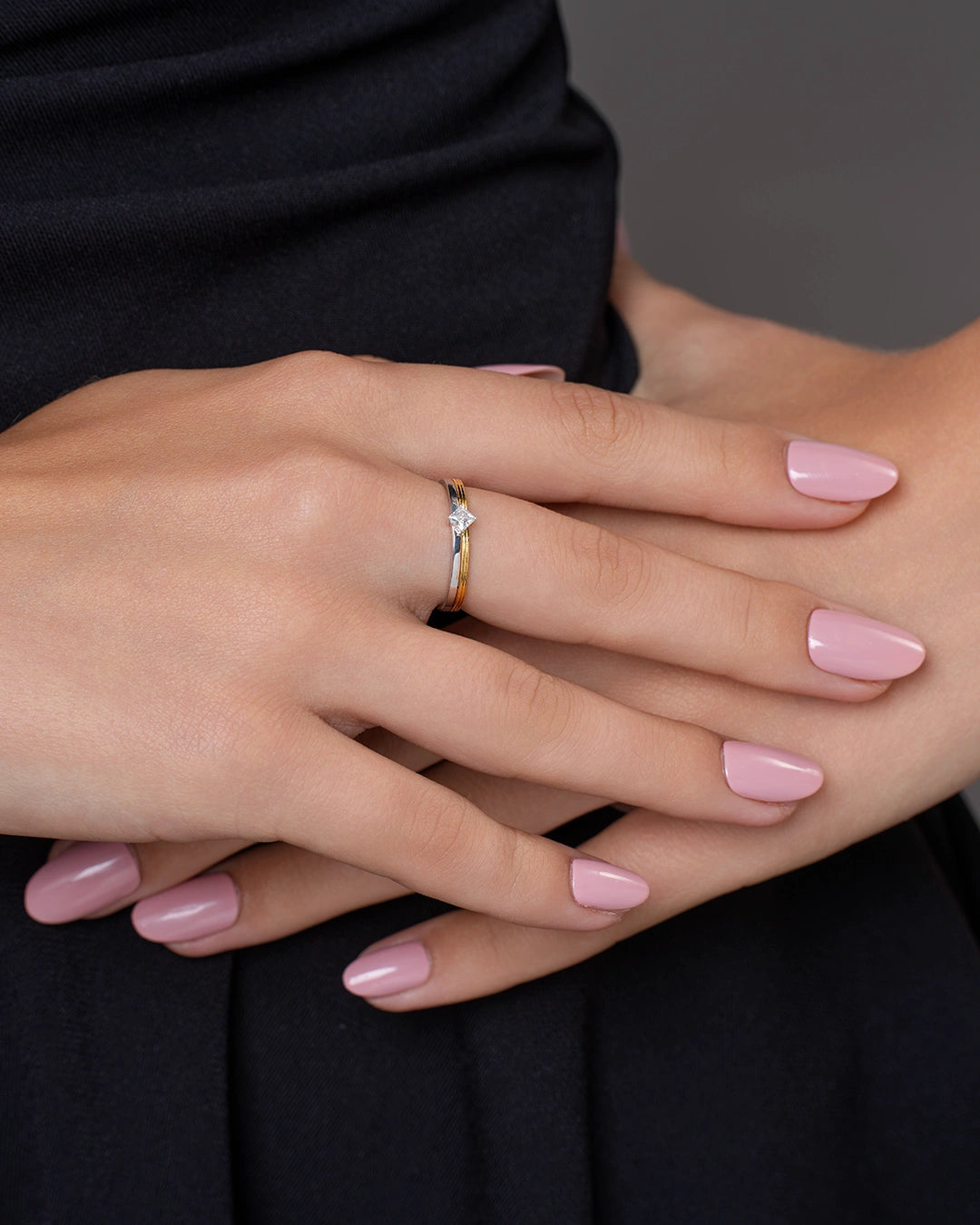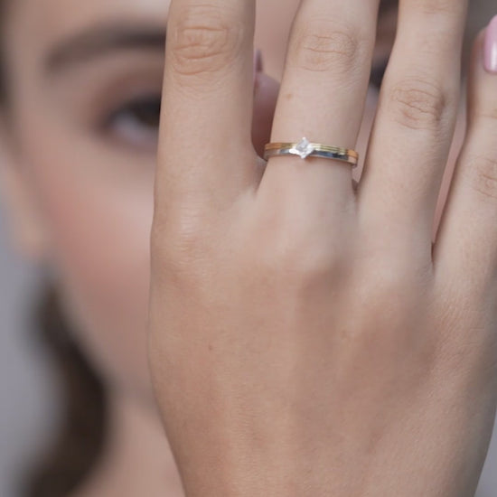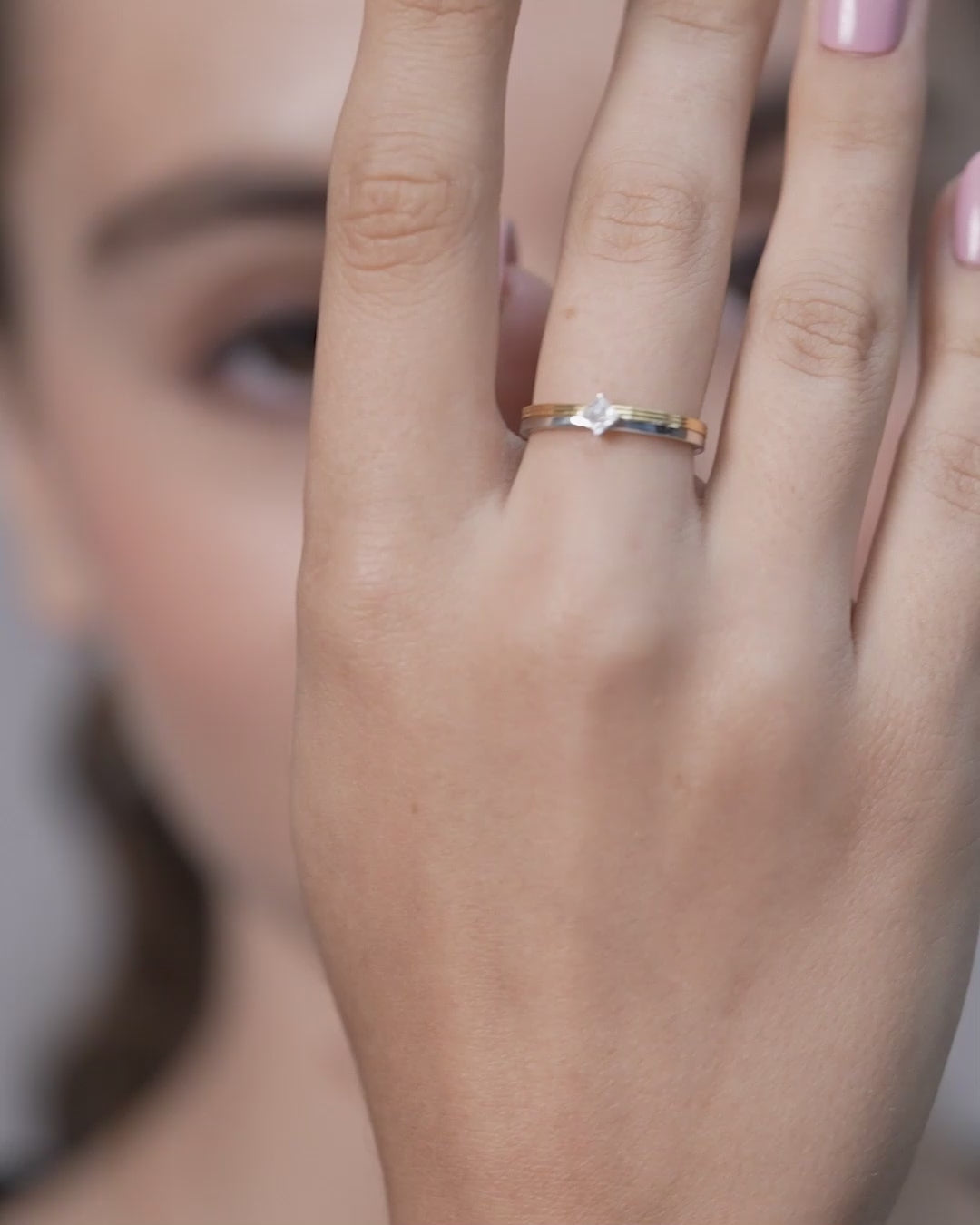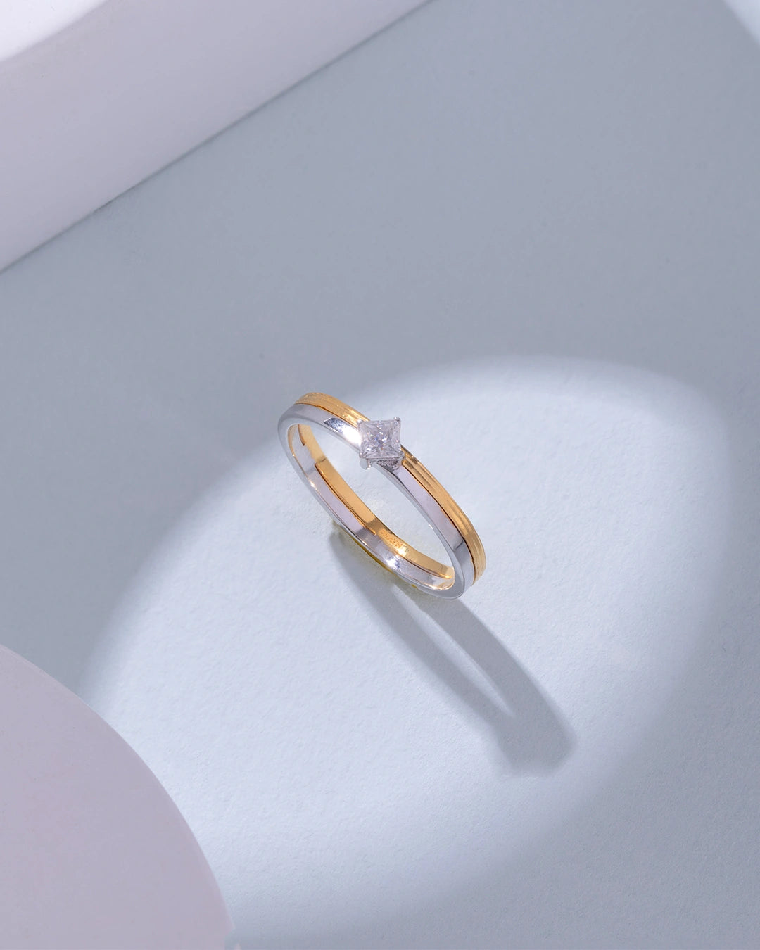 A minimal yet impactful band that features a square-cut solitaire diamond. The dual-tone design is enhanced by a fine grooved texture on the rose-toned half, exuding timeless charm.