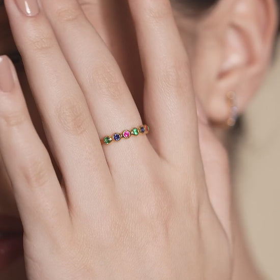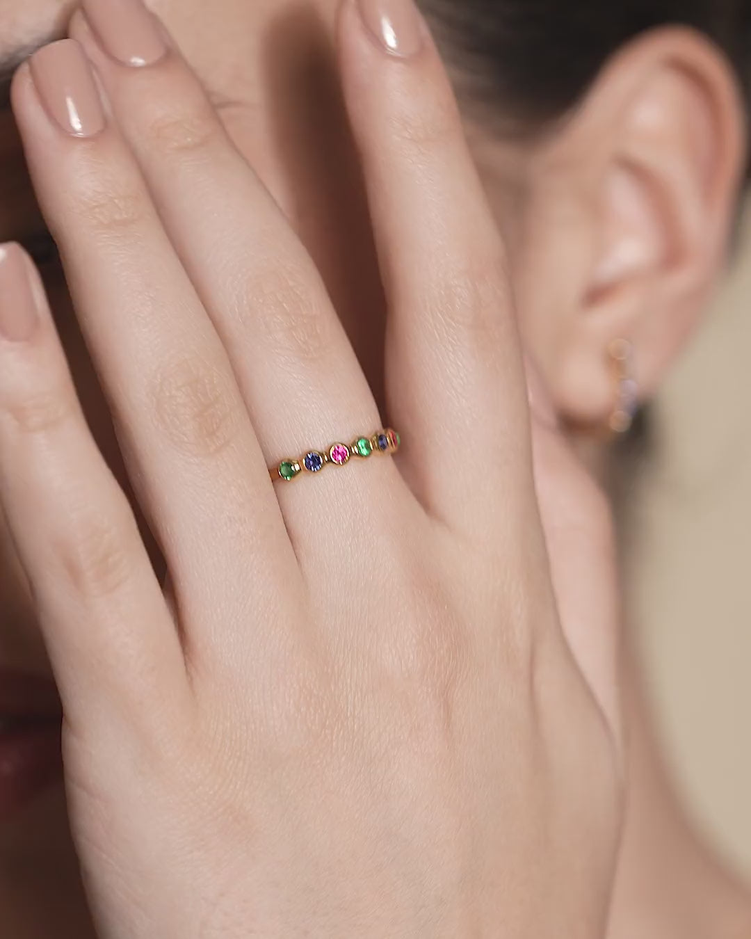 Made with 925 Sterling Silver 18KT Gold Vermeil and finished in gold tone. The multicolored stones add vibrance and personality to your stack.