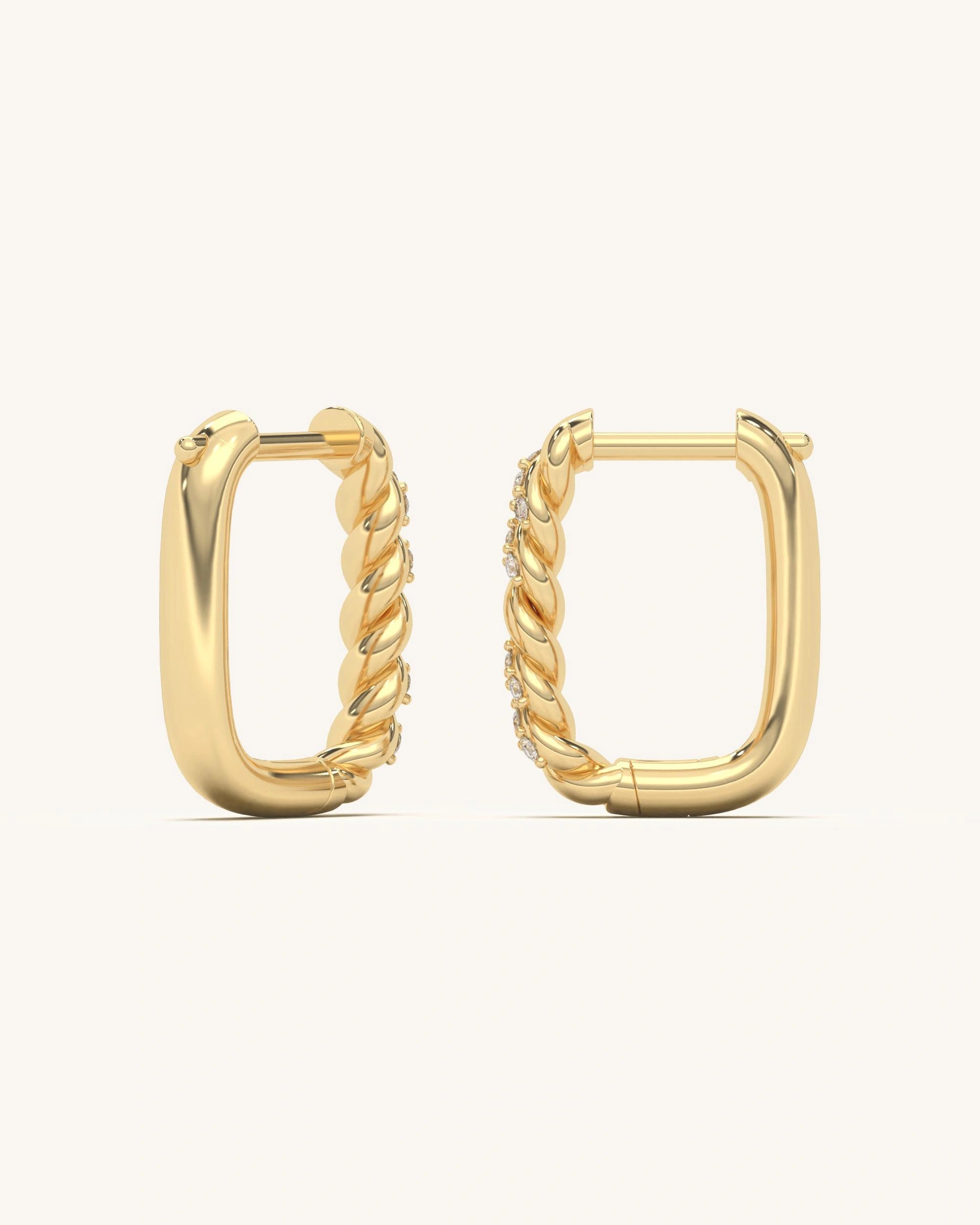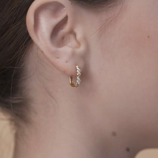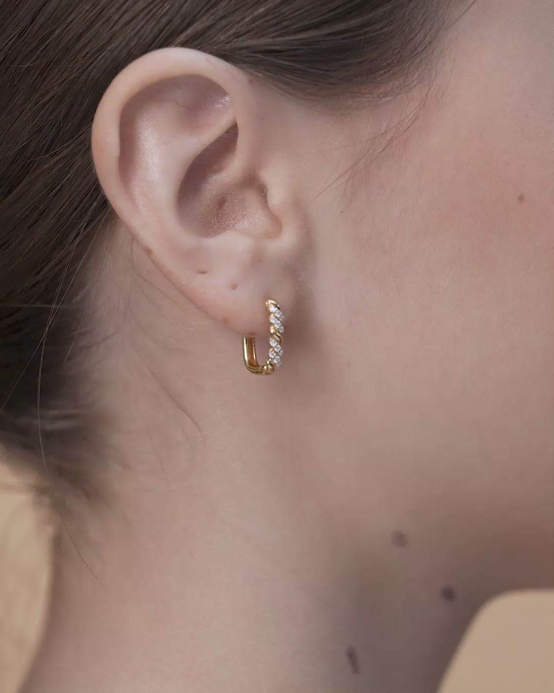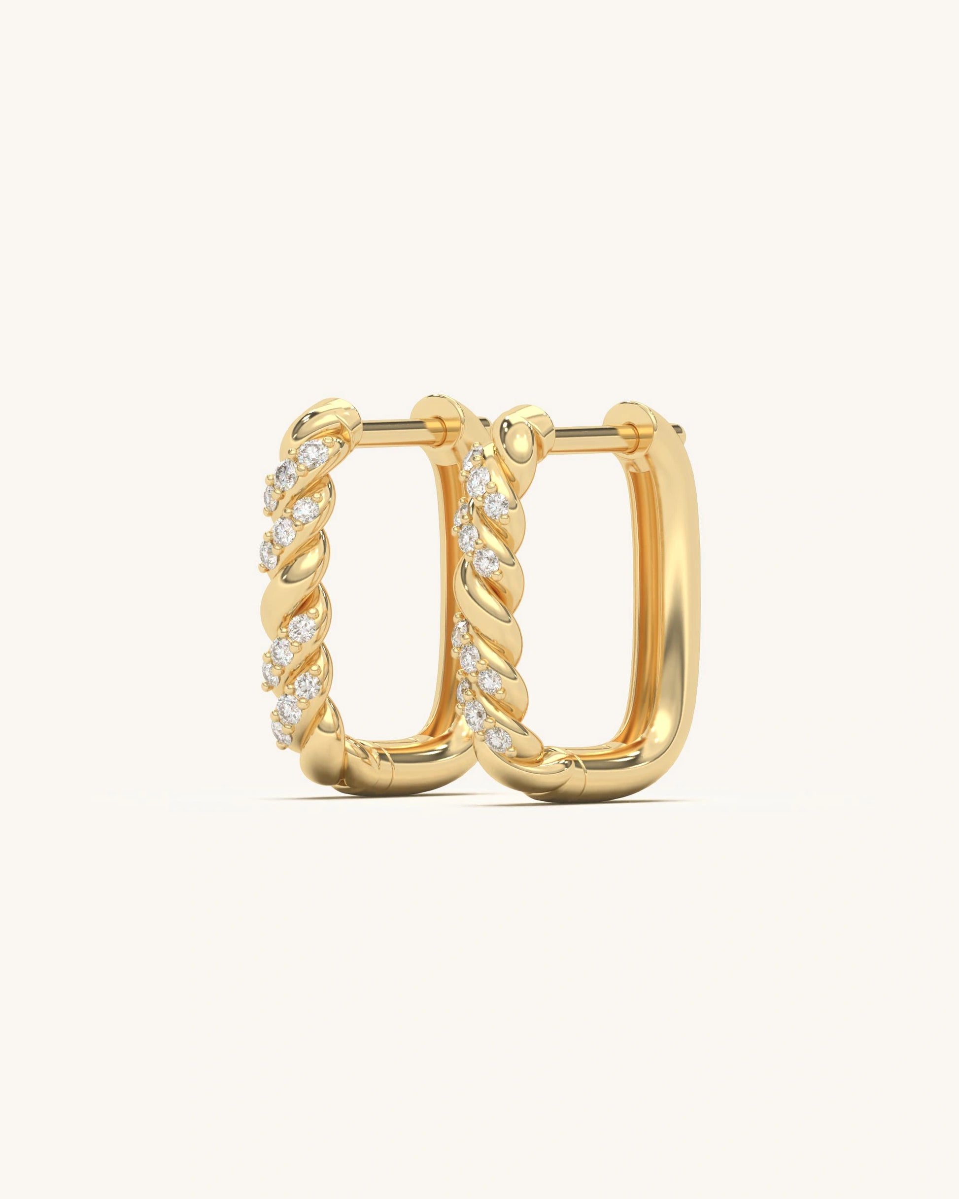 Mini hoop earrings with angled twisted bands inlaid with shimmering stones. Their compact size and soft curves make them ideal for both everyday and occasion wear.