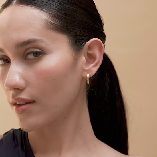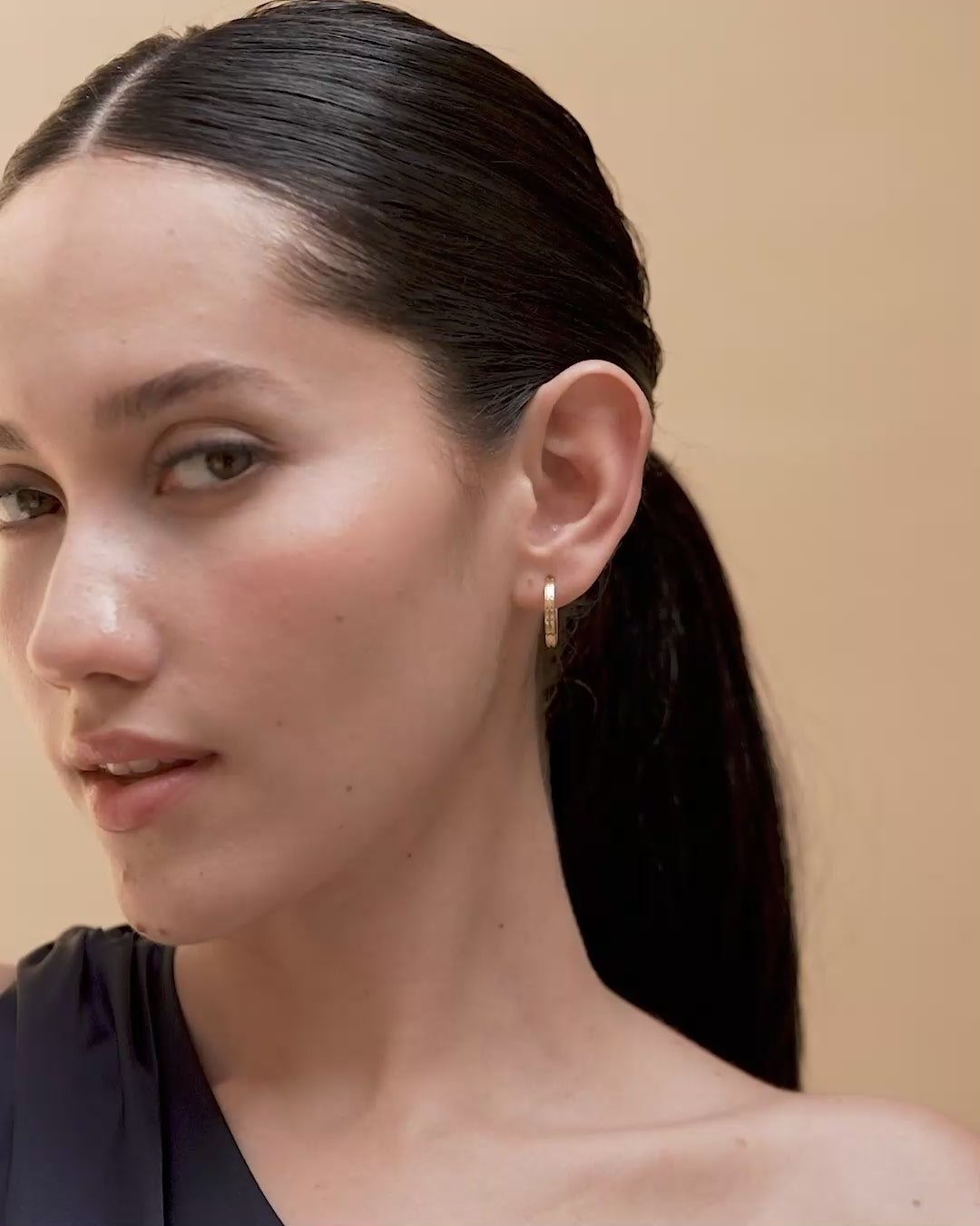 Contemporary gold-tone hoops with cut-out rectangular grooves across the band. Their structured design offers bold architectural styling.