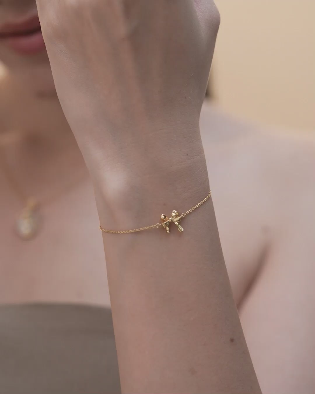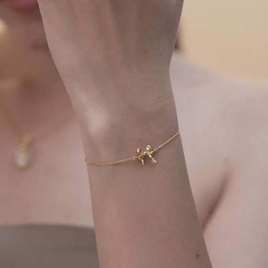 This bracelet features a realistic gold-tone ribbon bow at the center, softly shaped with fluid lines. Simple yet full of character.