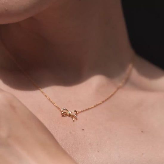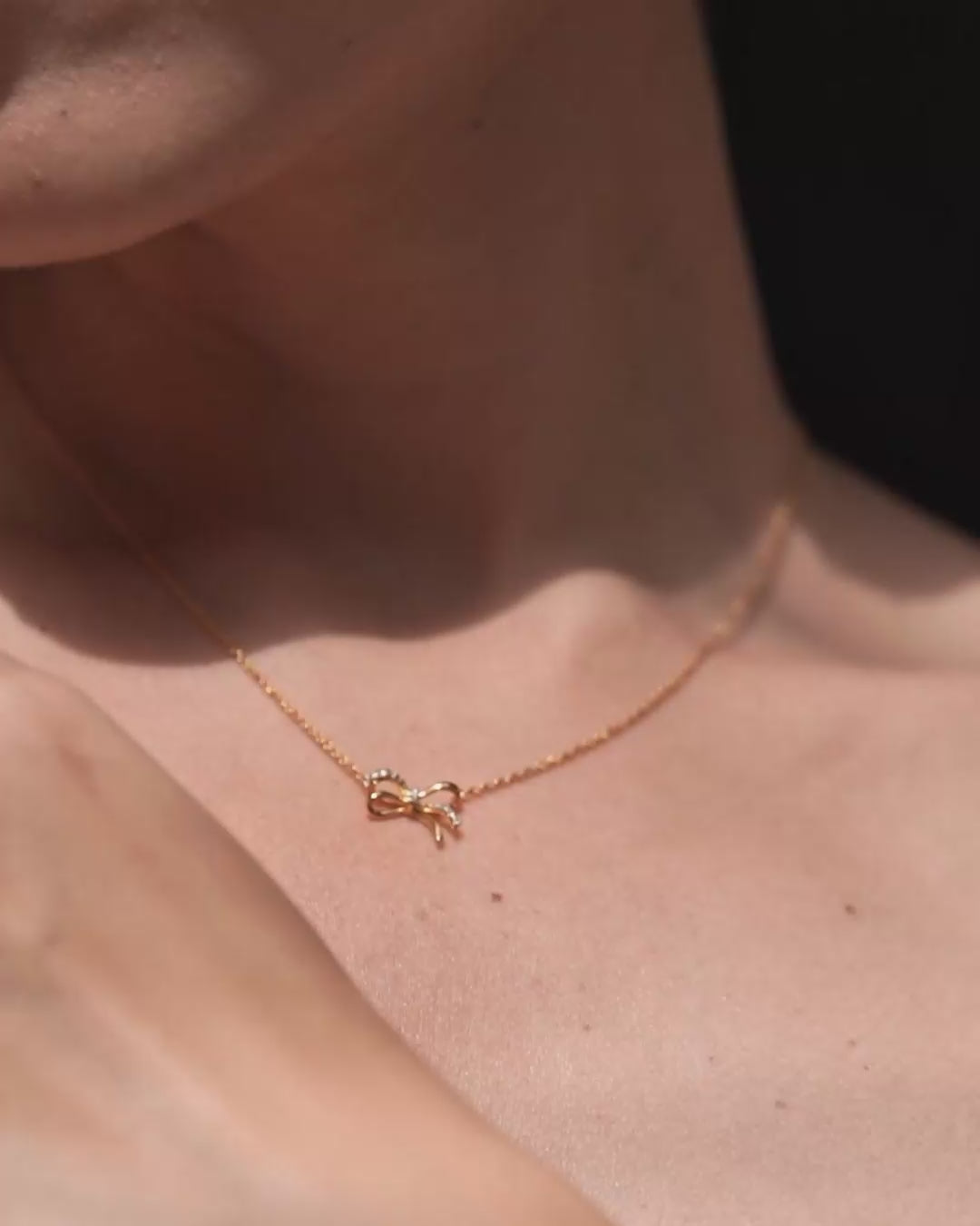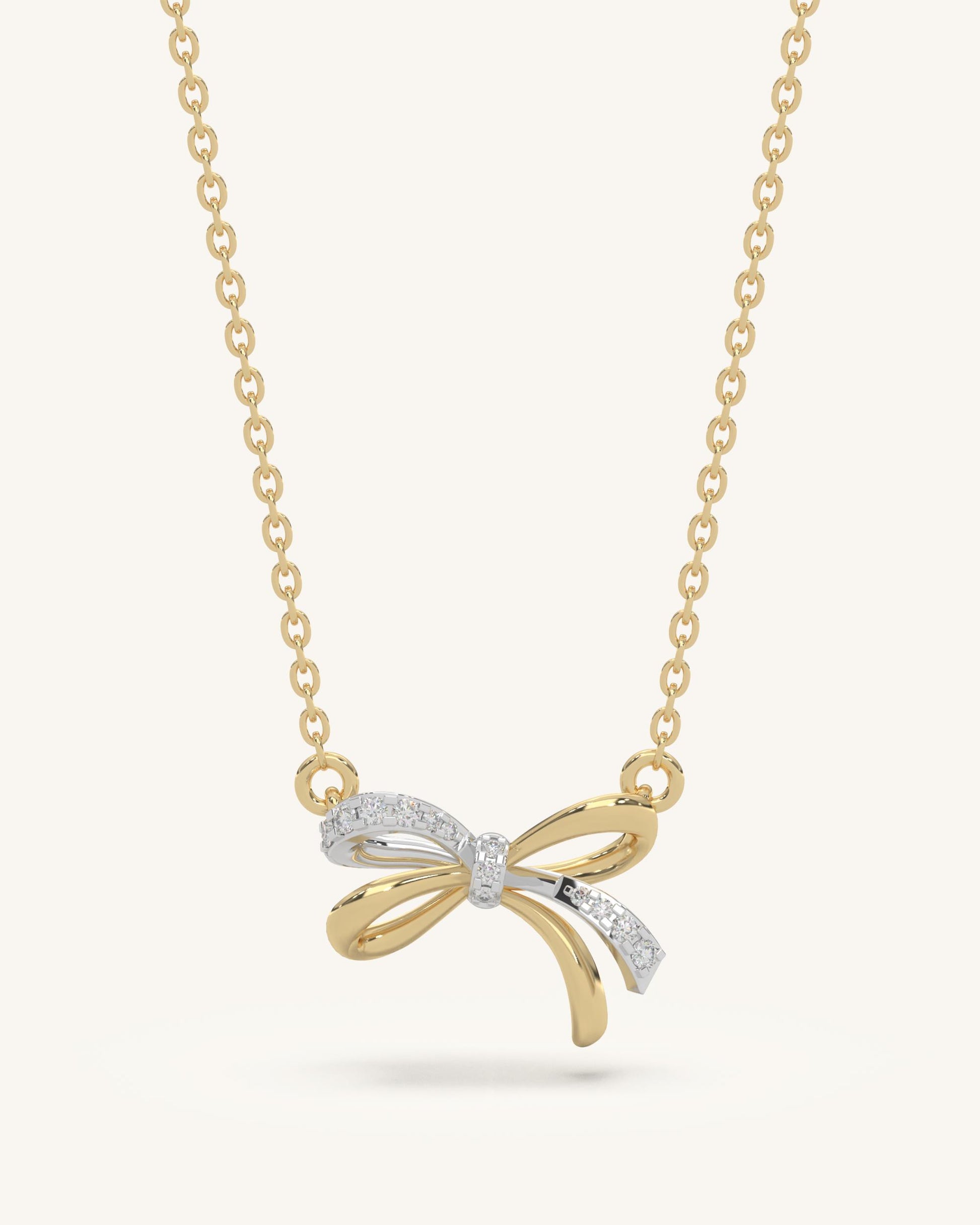 With one loop studded and the other plain, this pendant plays with texture and movement. A sophisticated twist on the classic bow.