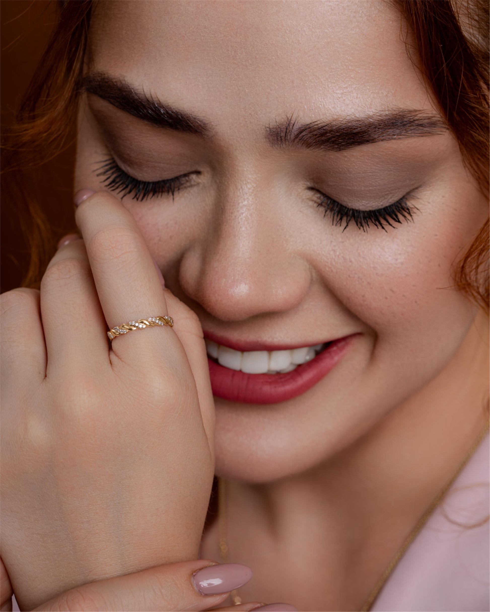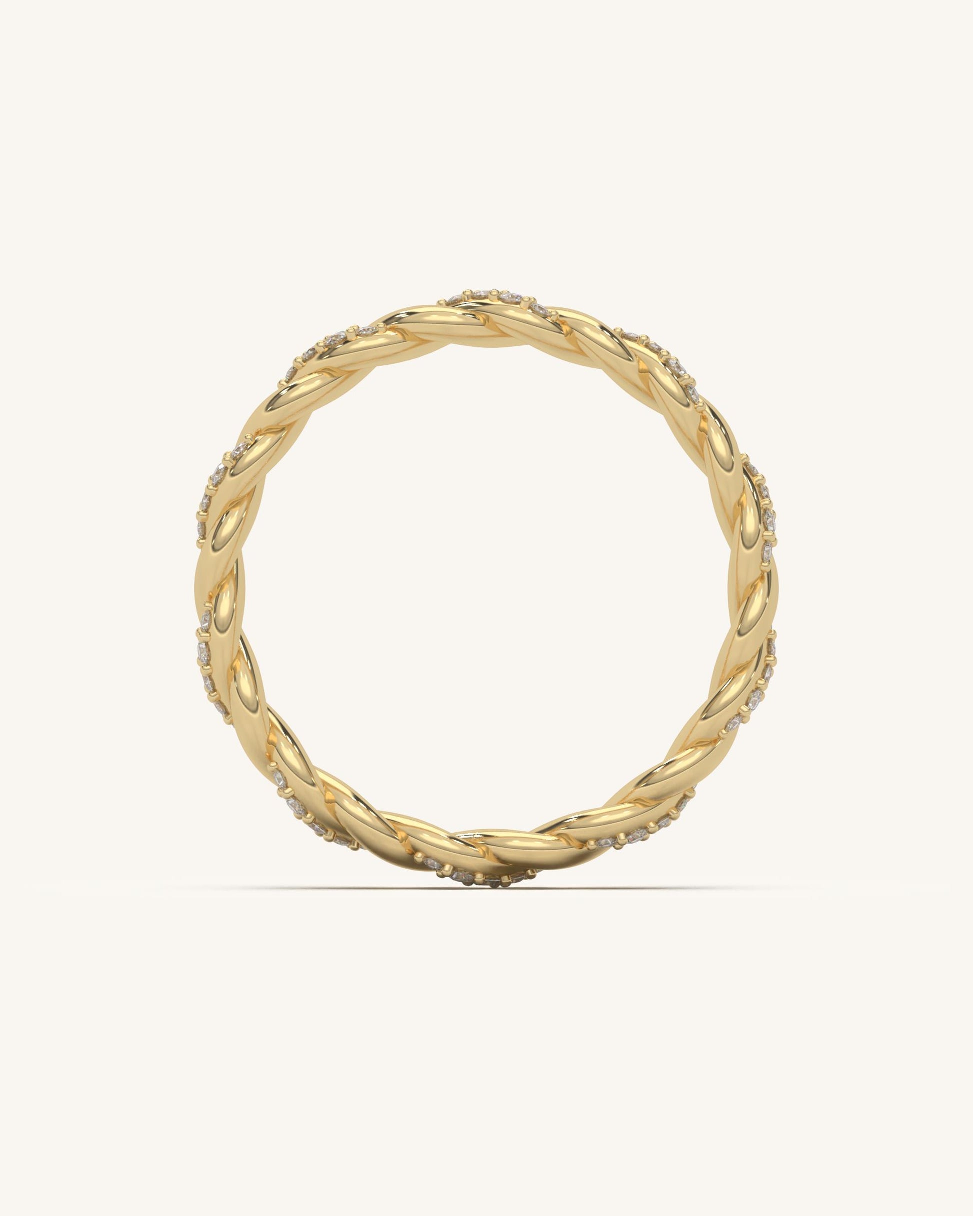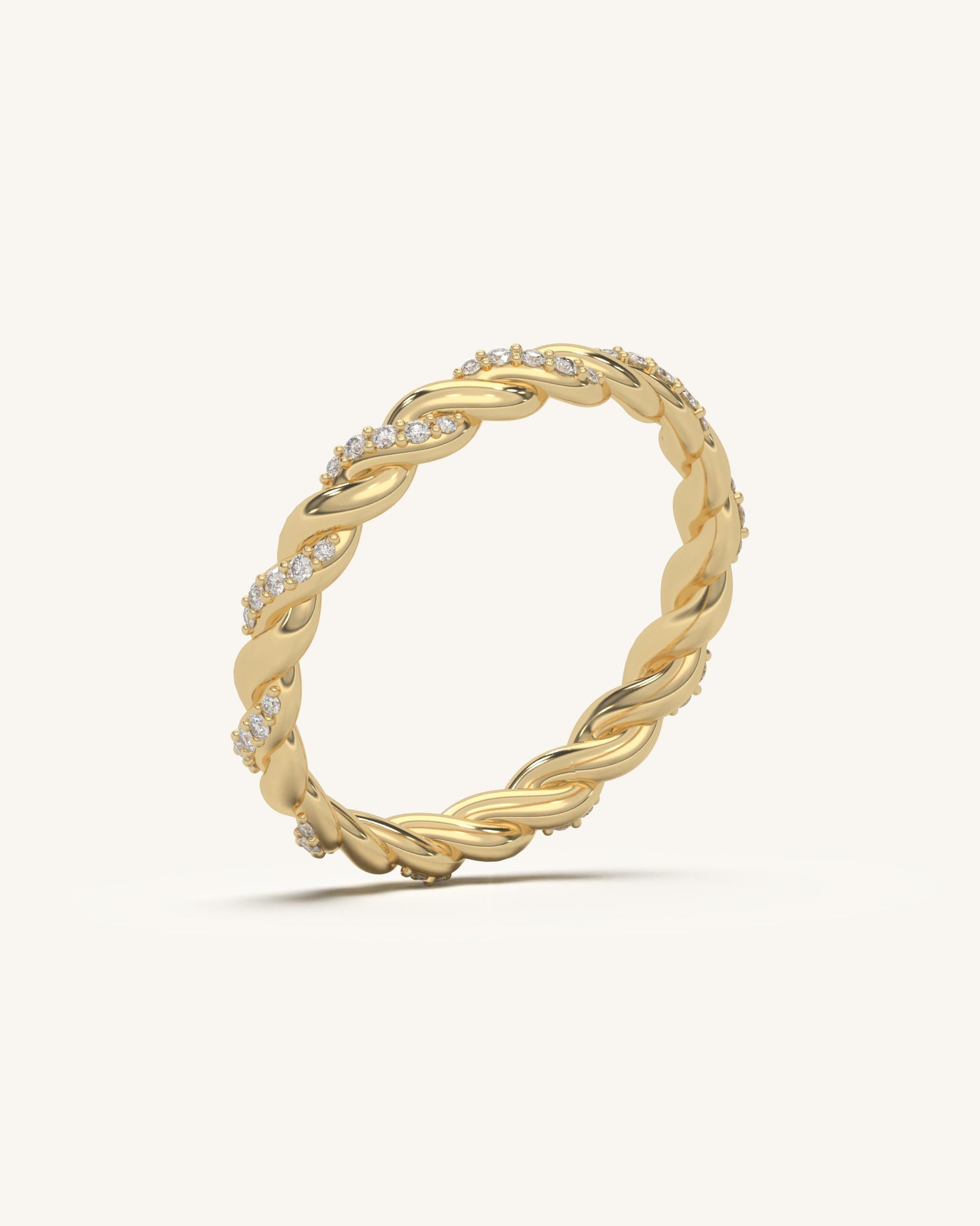 Twist-patterned band ring with high polish gold links and inset stones alternating in a seamless design. A statement piece that is both Timeless and wearable for daily elegance.