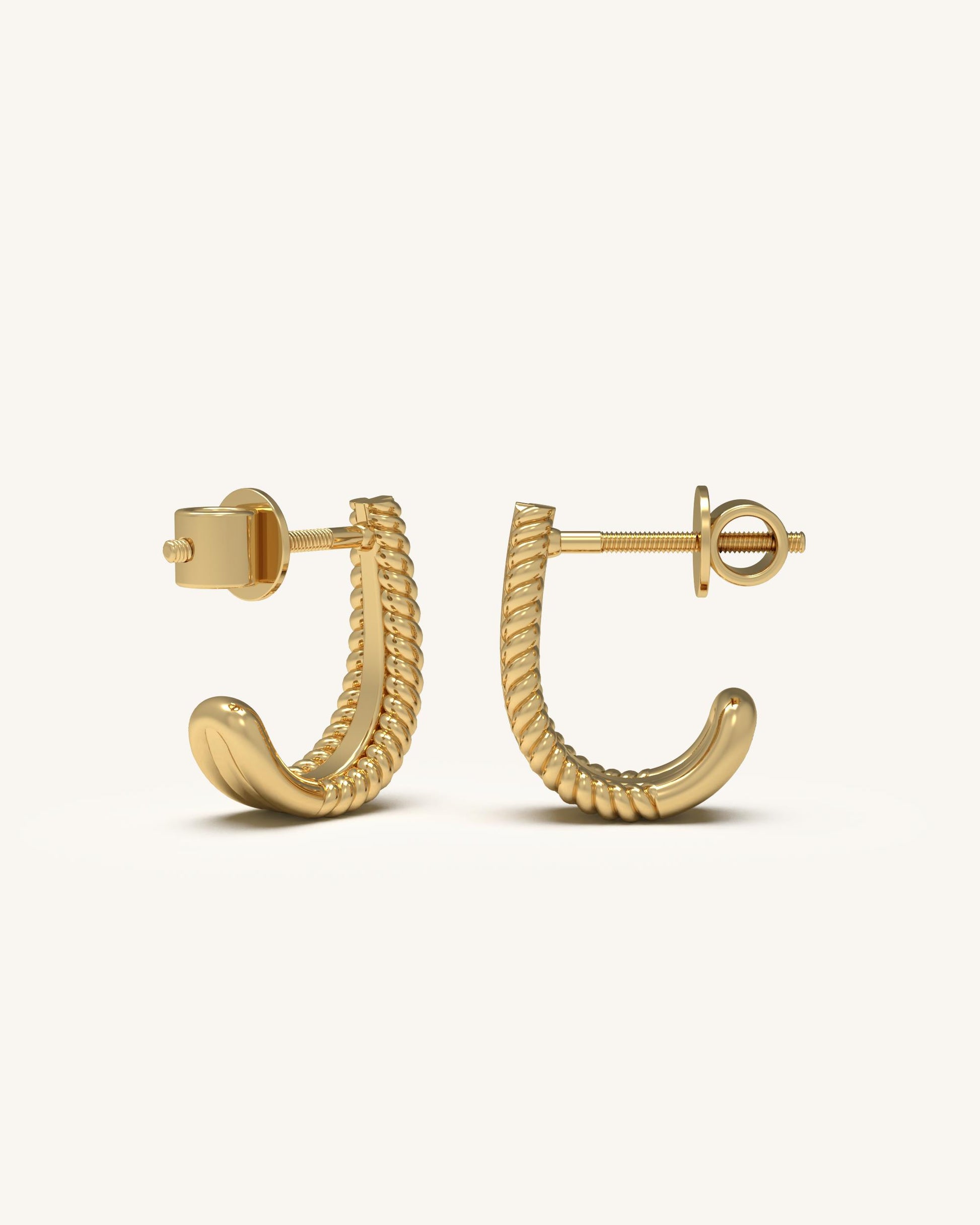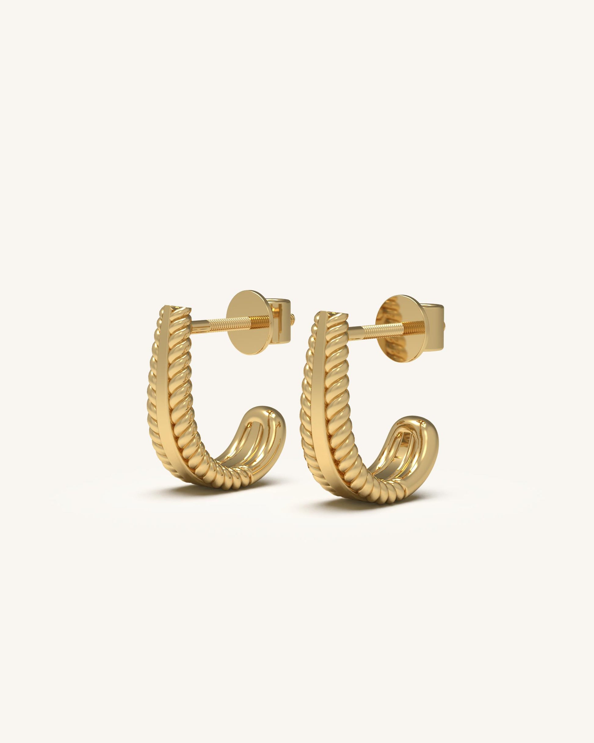 These hoop earrings feature bold twisted rope textures in a semi oval shape offering a balance of structure and fluidity. Their warm yellow gold finish enhances the dimensional design making them a chic addition to both casual and evening wear.