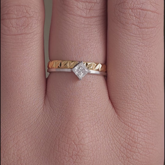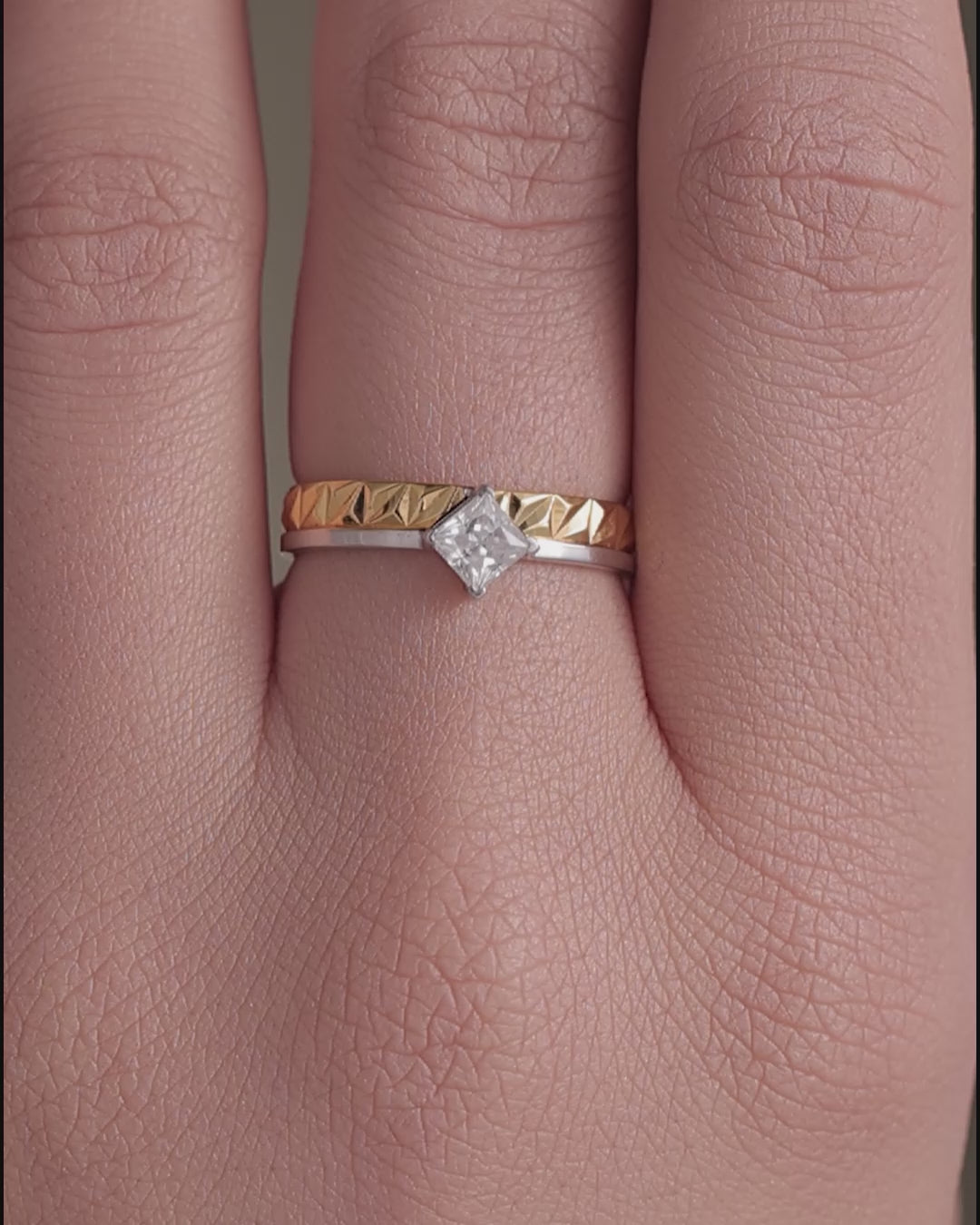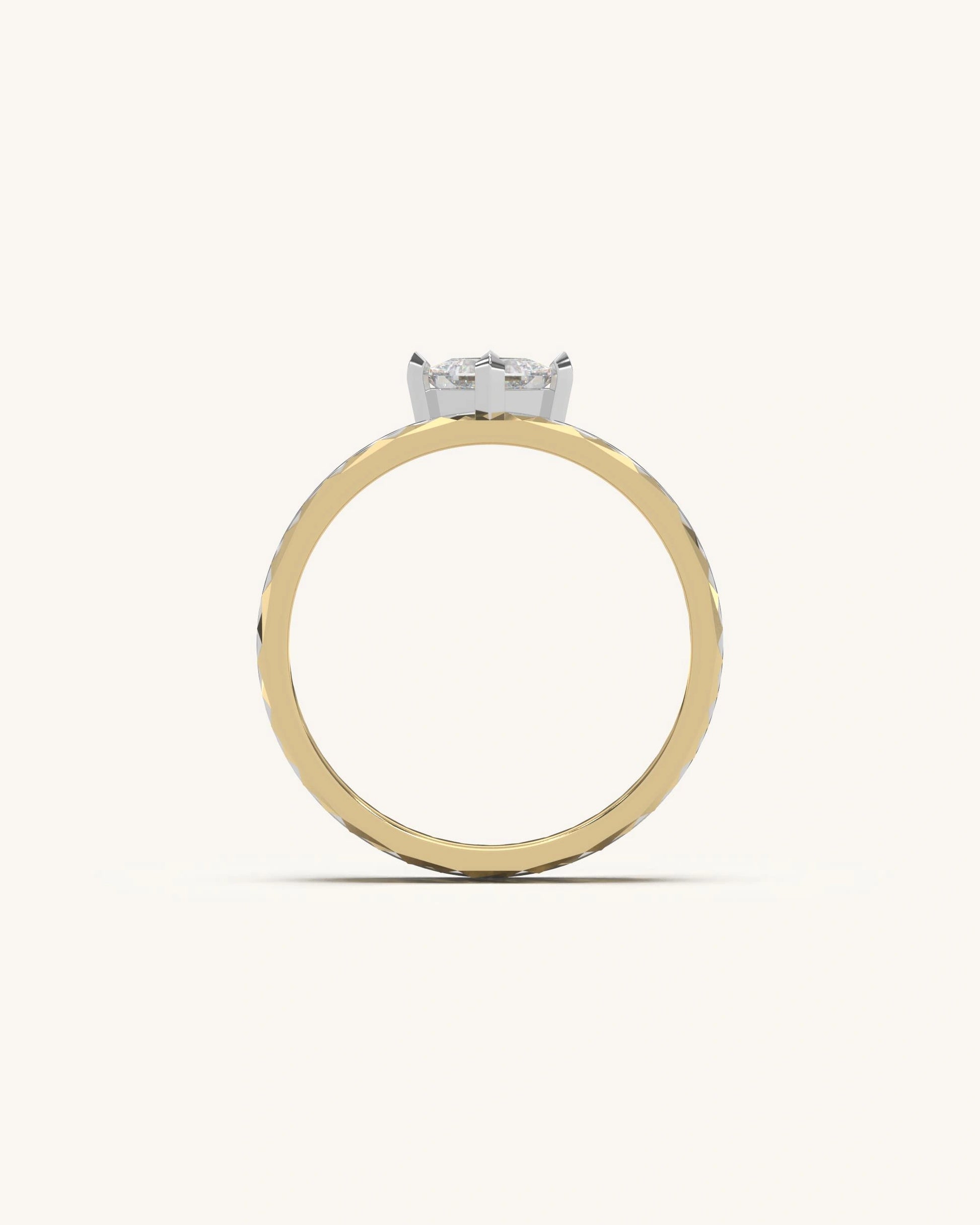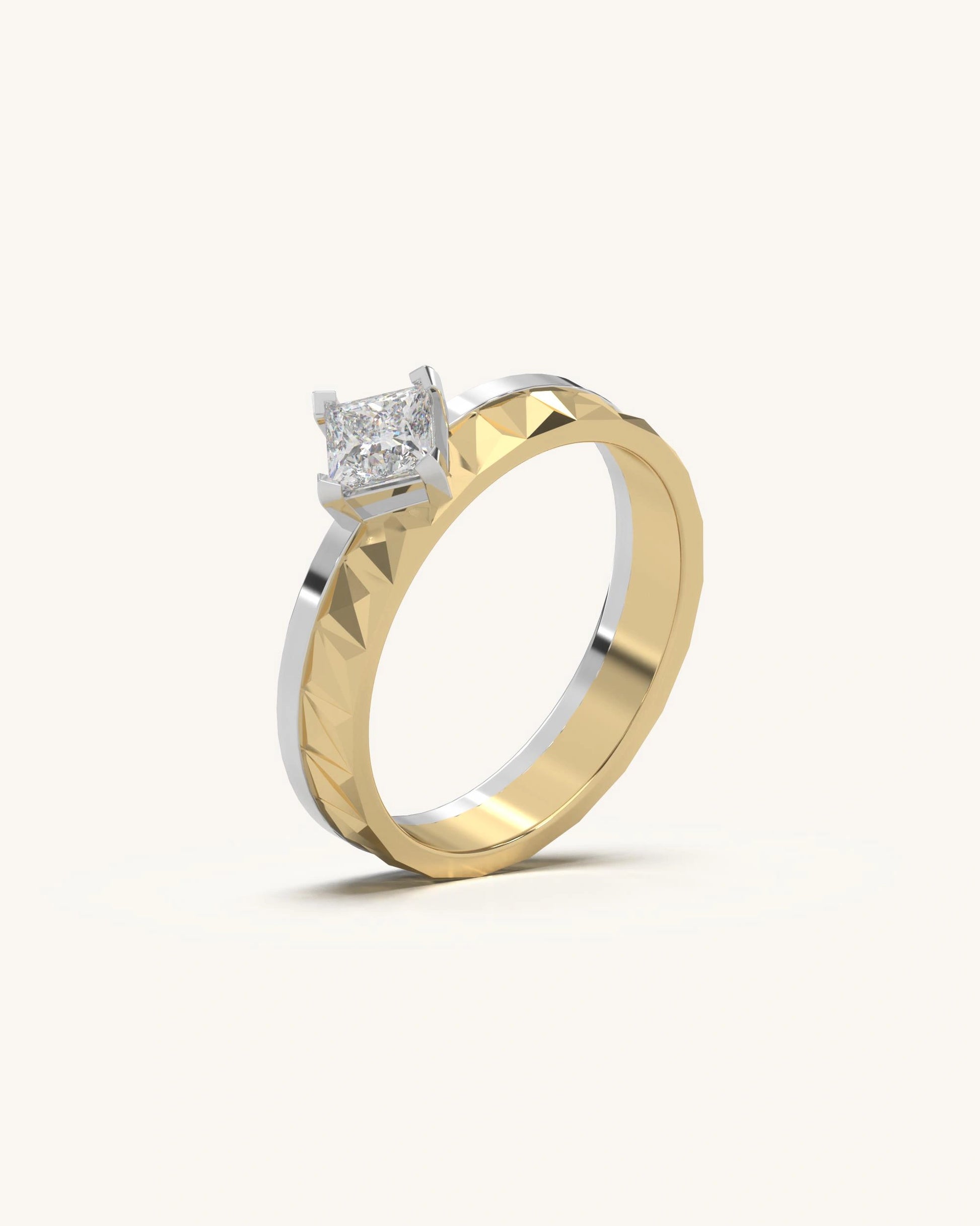 A classic round-cut solitaire paired with a textured gold band and minimal silver contrast for everyday luxury.