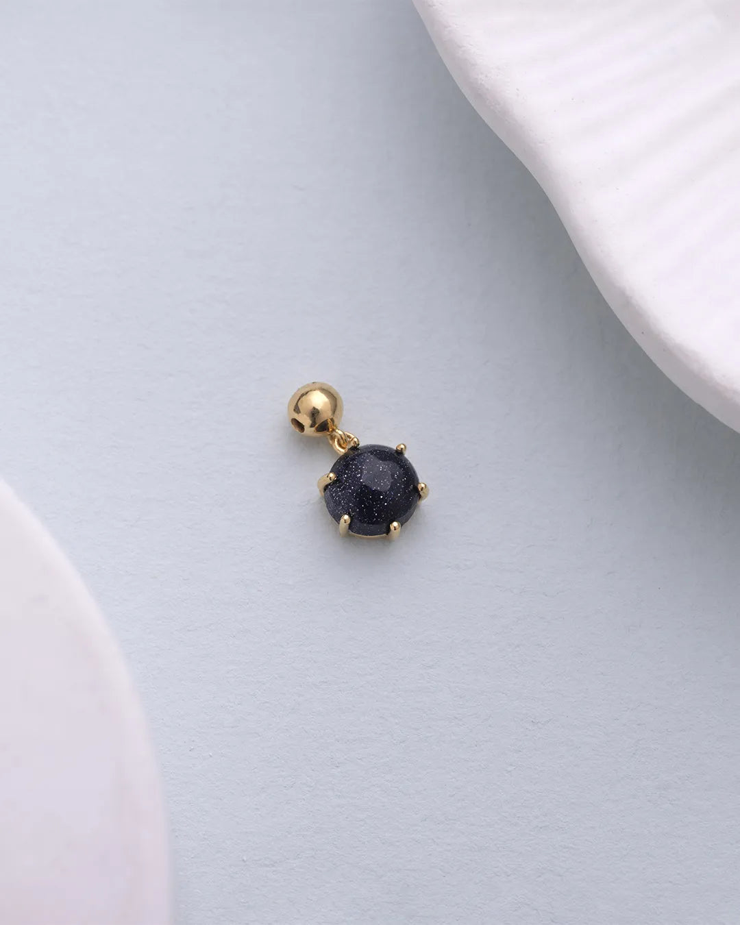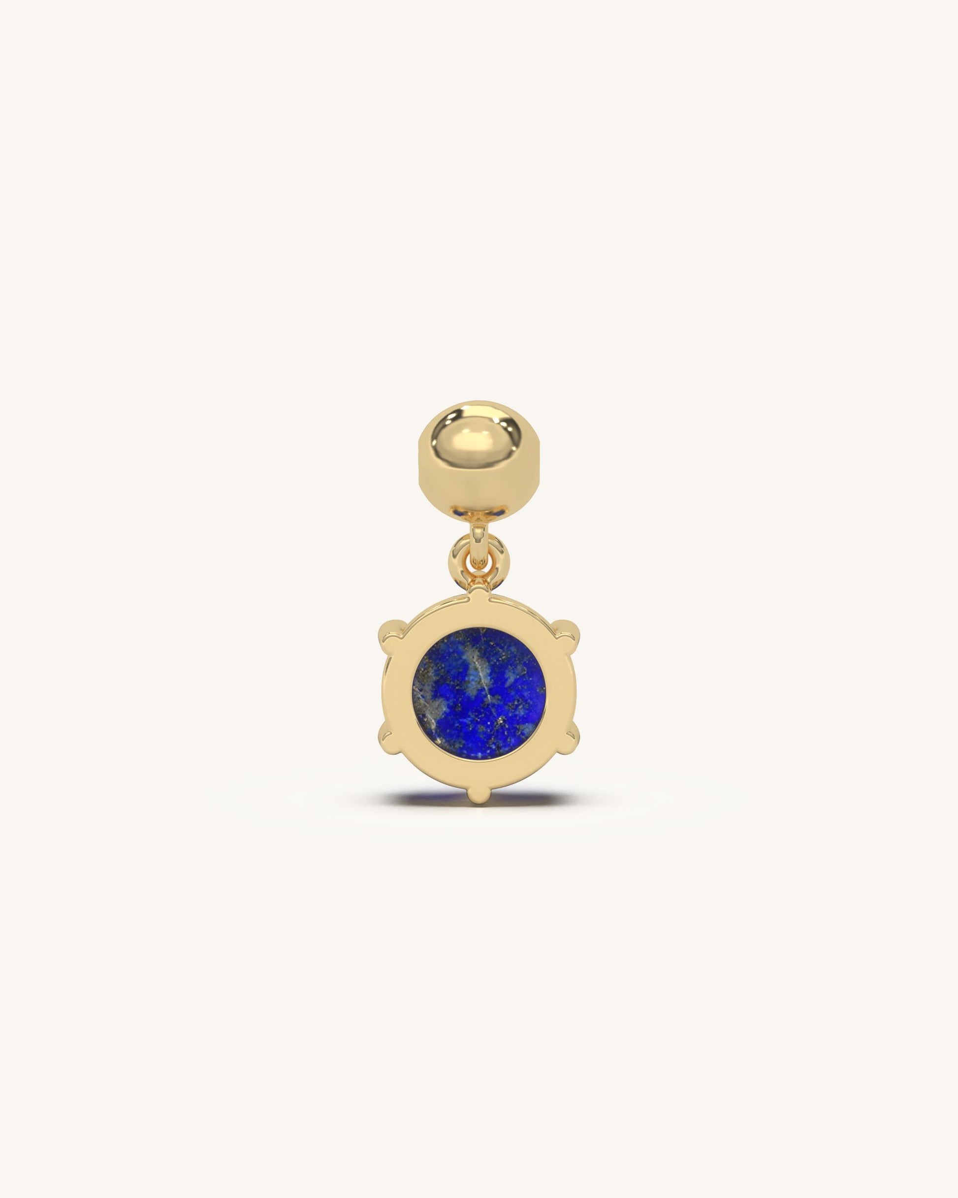 Round deep blue lapis charm with natural speckles, secured in a warm rose gold prong setting.