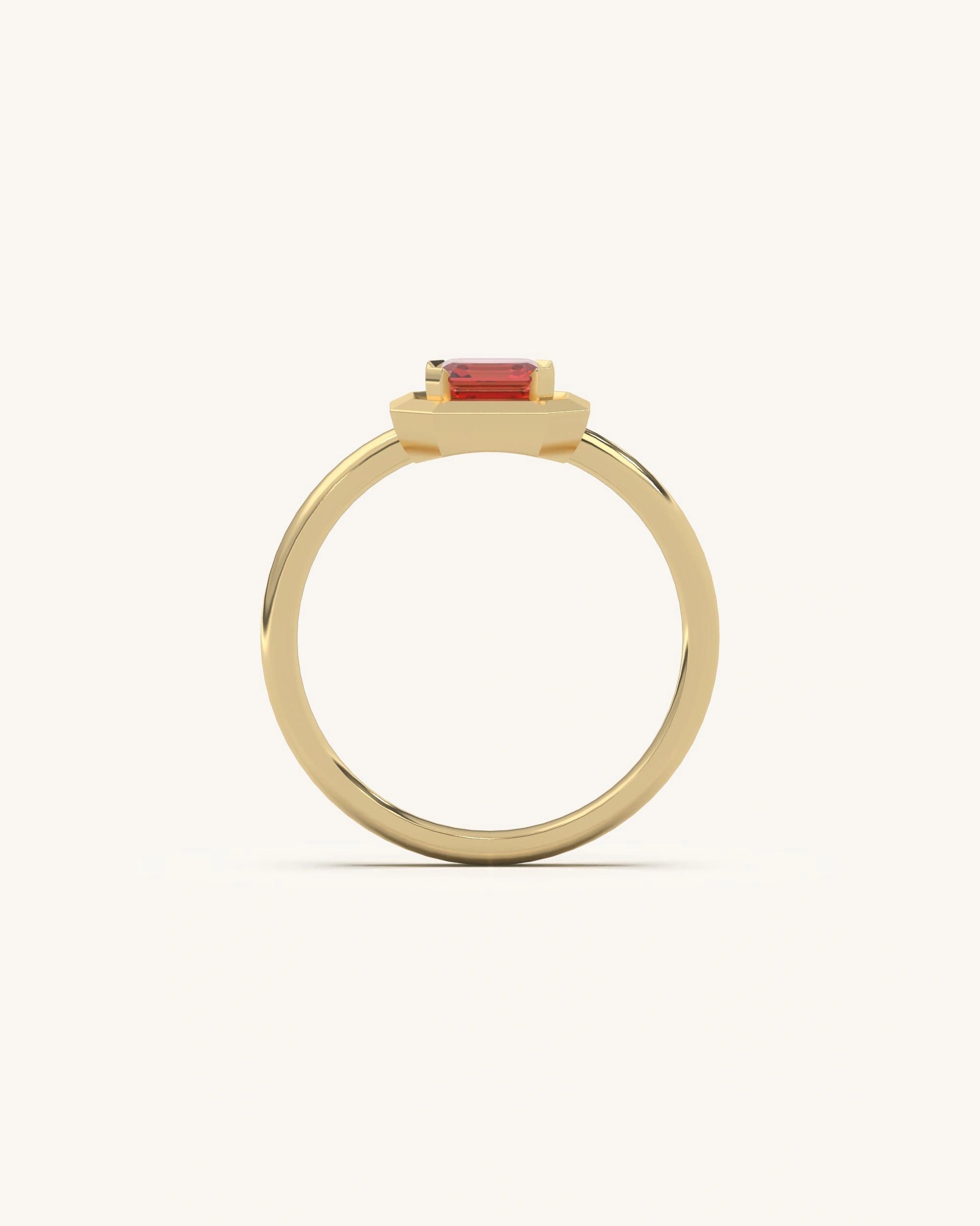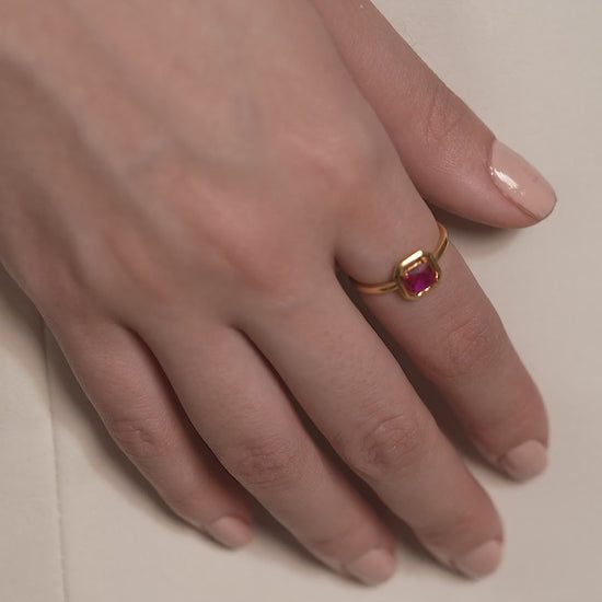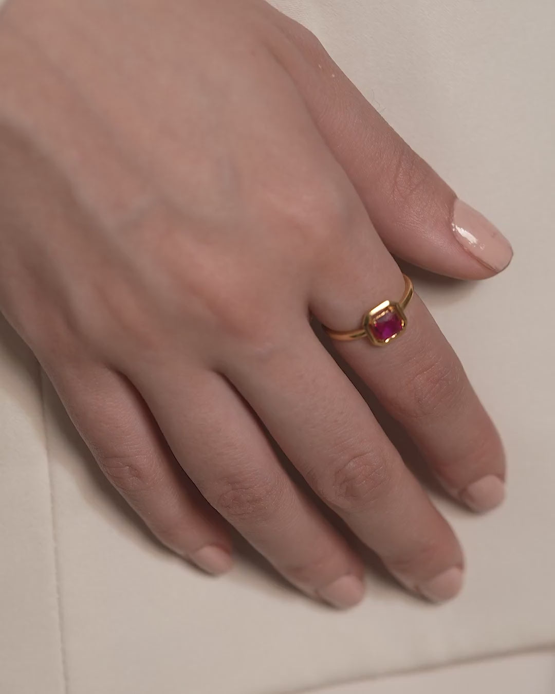 A Timeless square ruby stone is set in a structured prong frame. The clean lines and minimal silhouette make this a versatile piece for every day.
