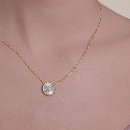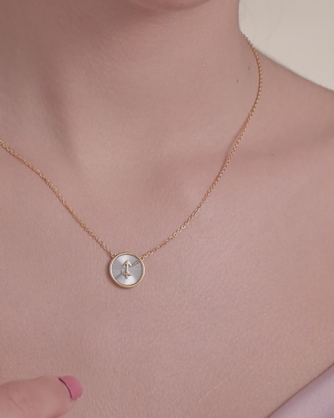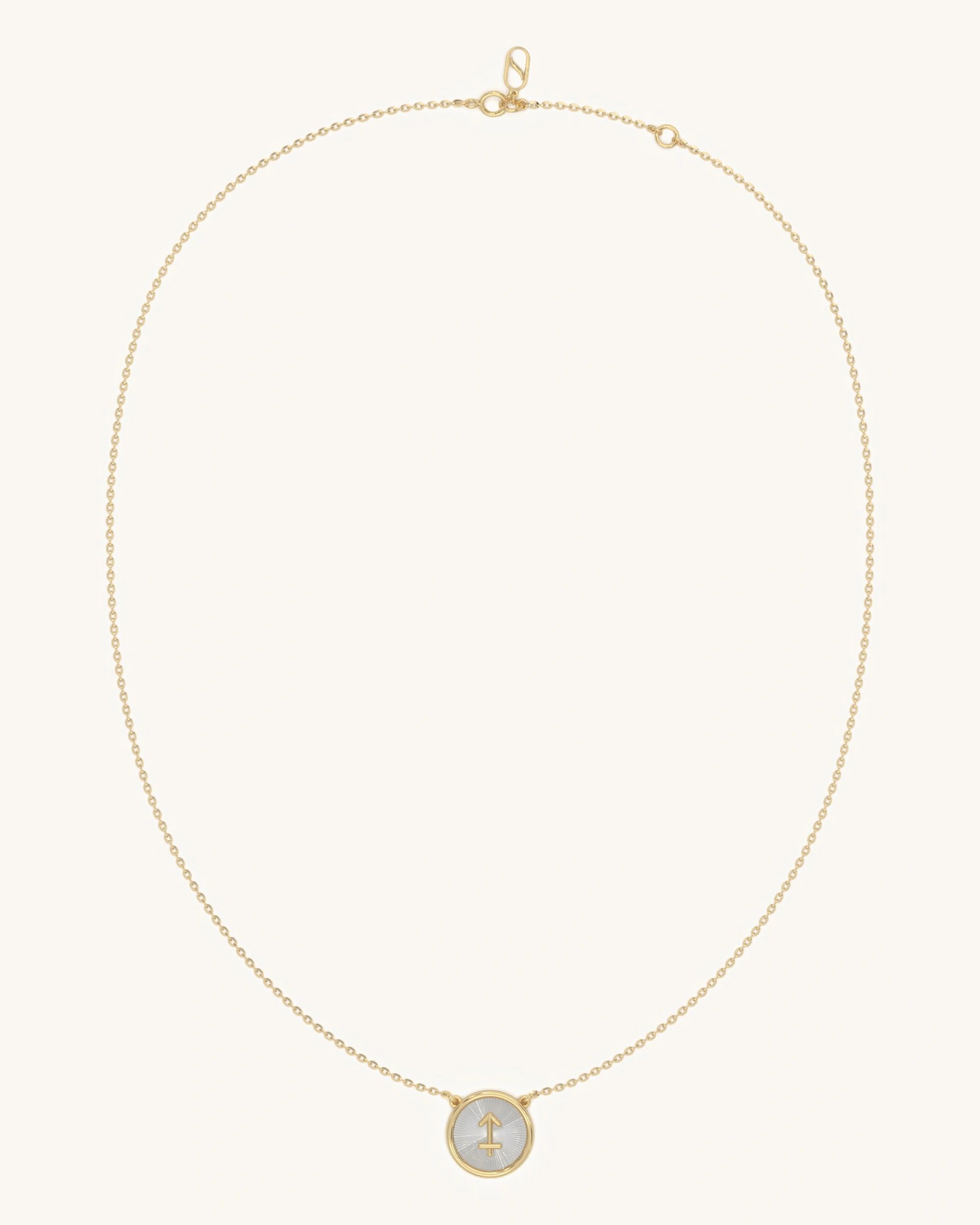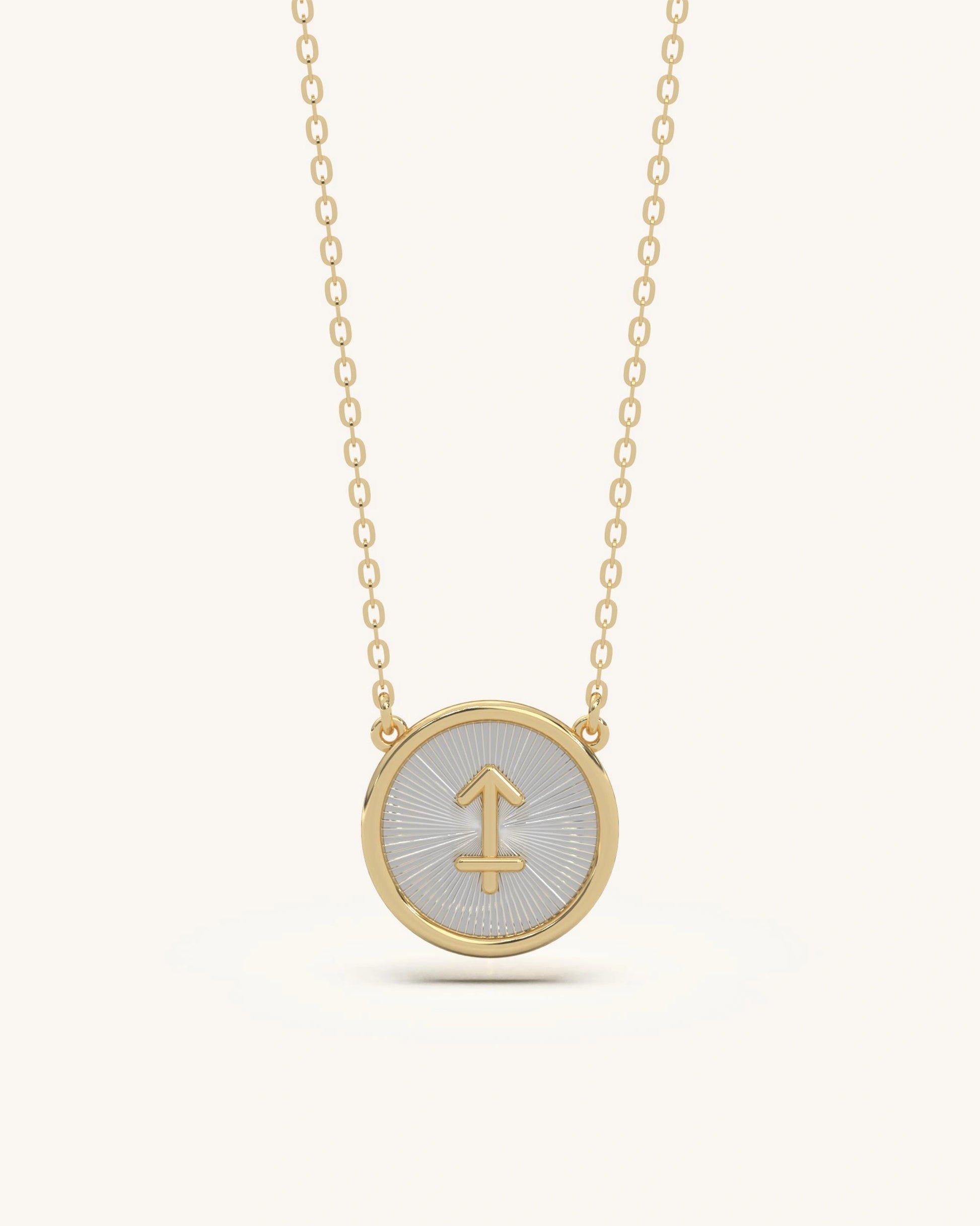 A round medallion pendant designed with the Sagittarius symbol engraved at its center. The background is finely textured to highlight the sign, and the polished edge gives a refined, classic finish.