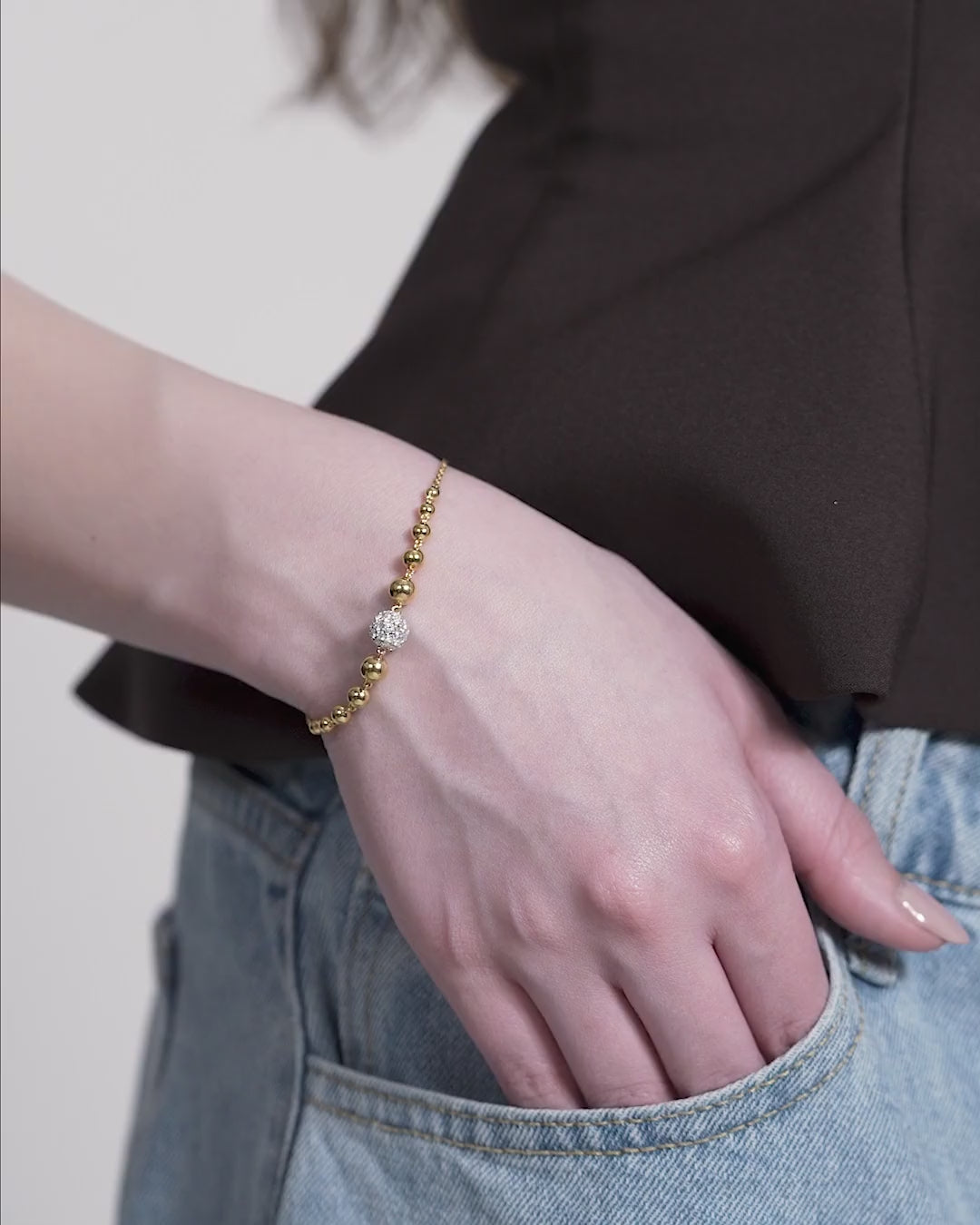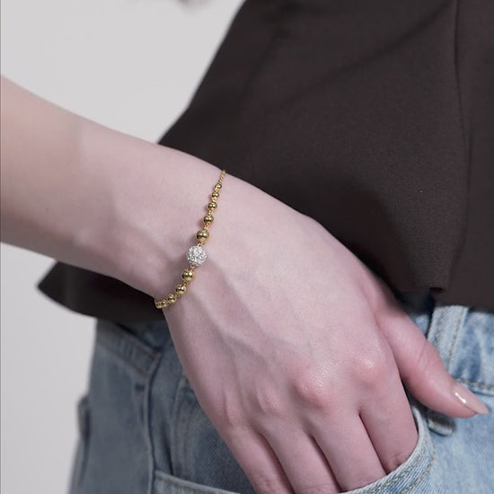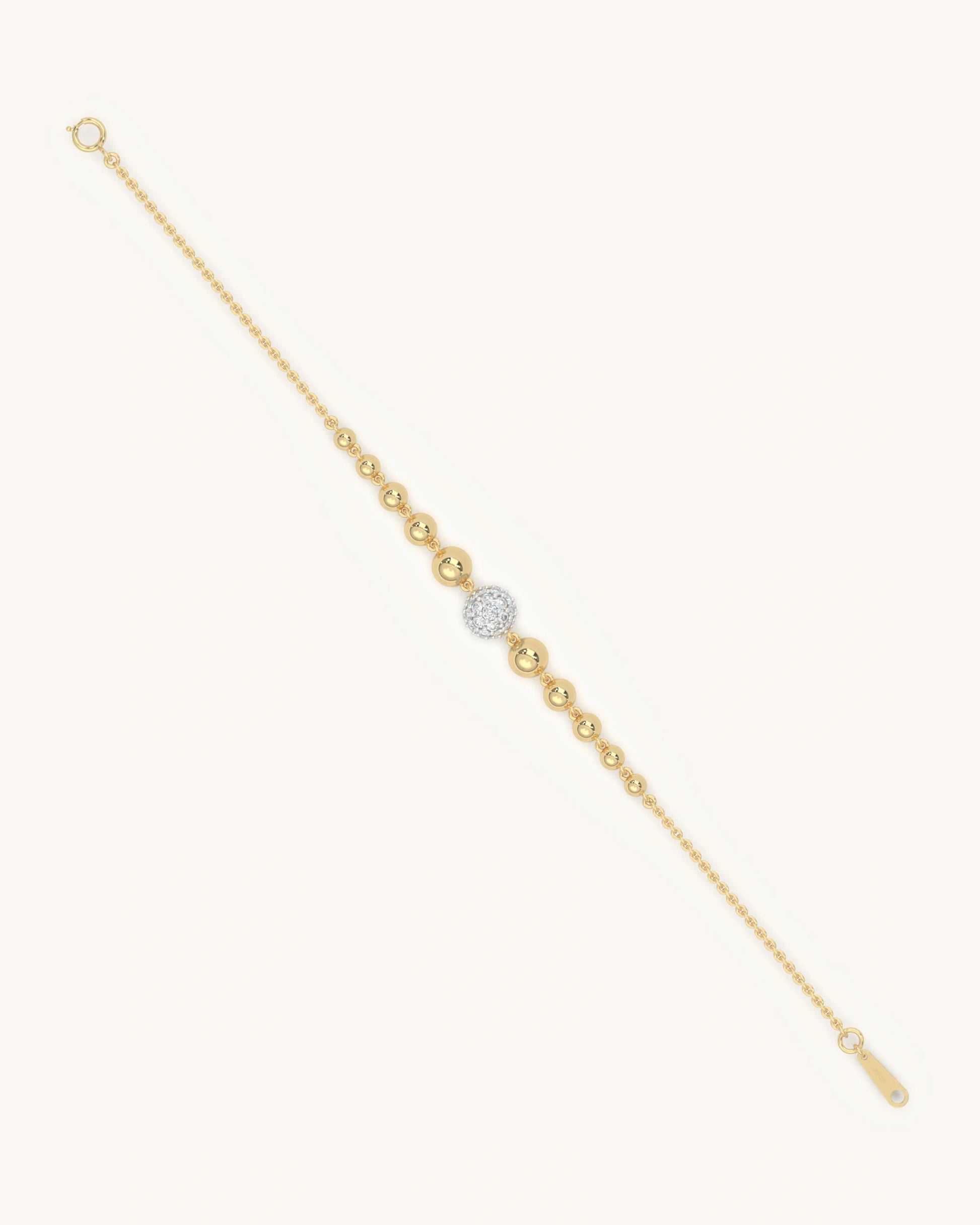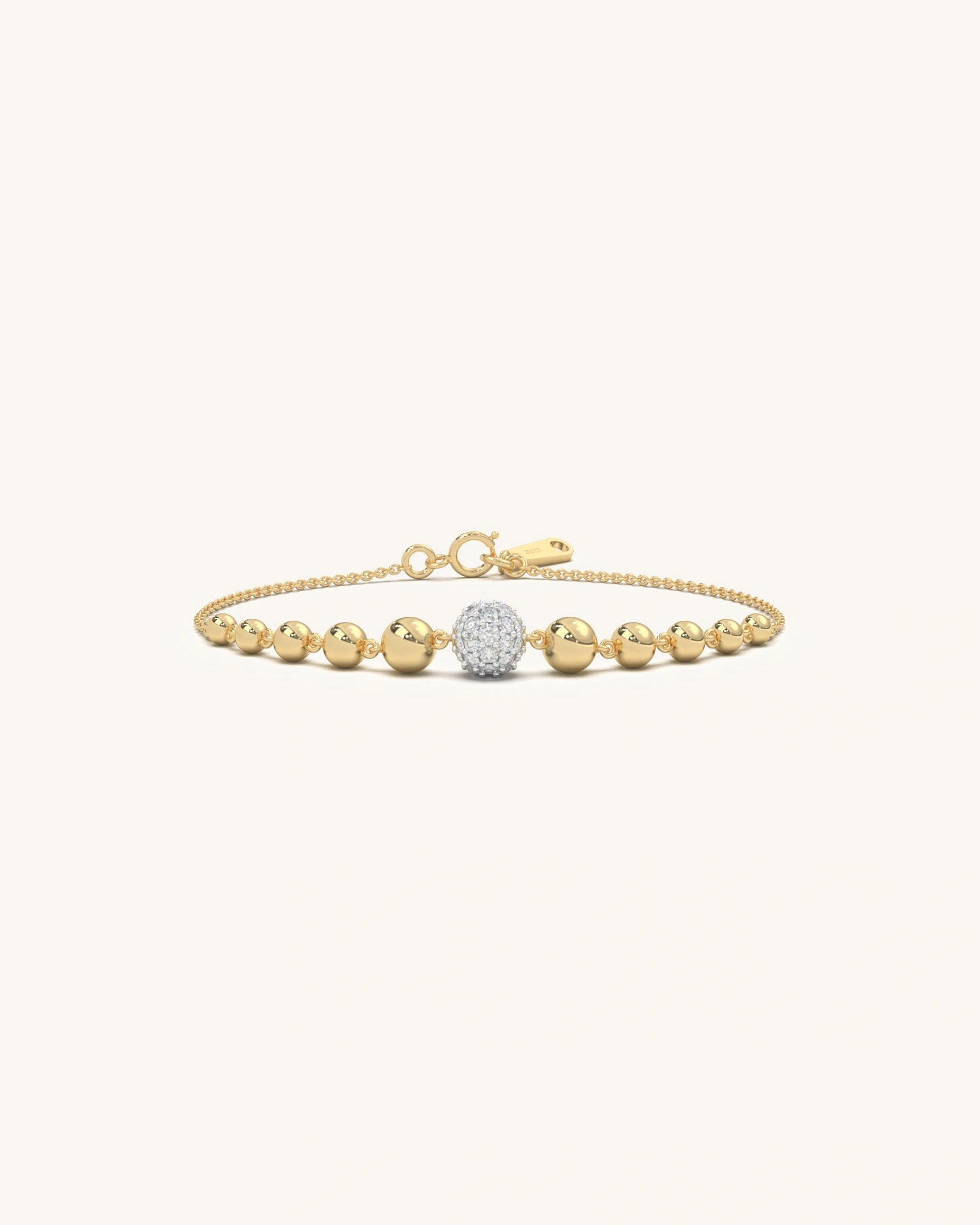 A beaded bracelet with a central Moissanite cluster framed by polished round beads that gradually decrease in size. The bracelet is symmetrical and has a fine chain closure for a secure yet elegant fit.