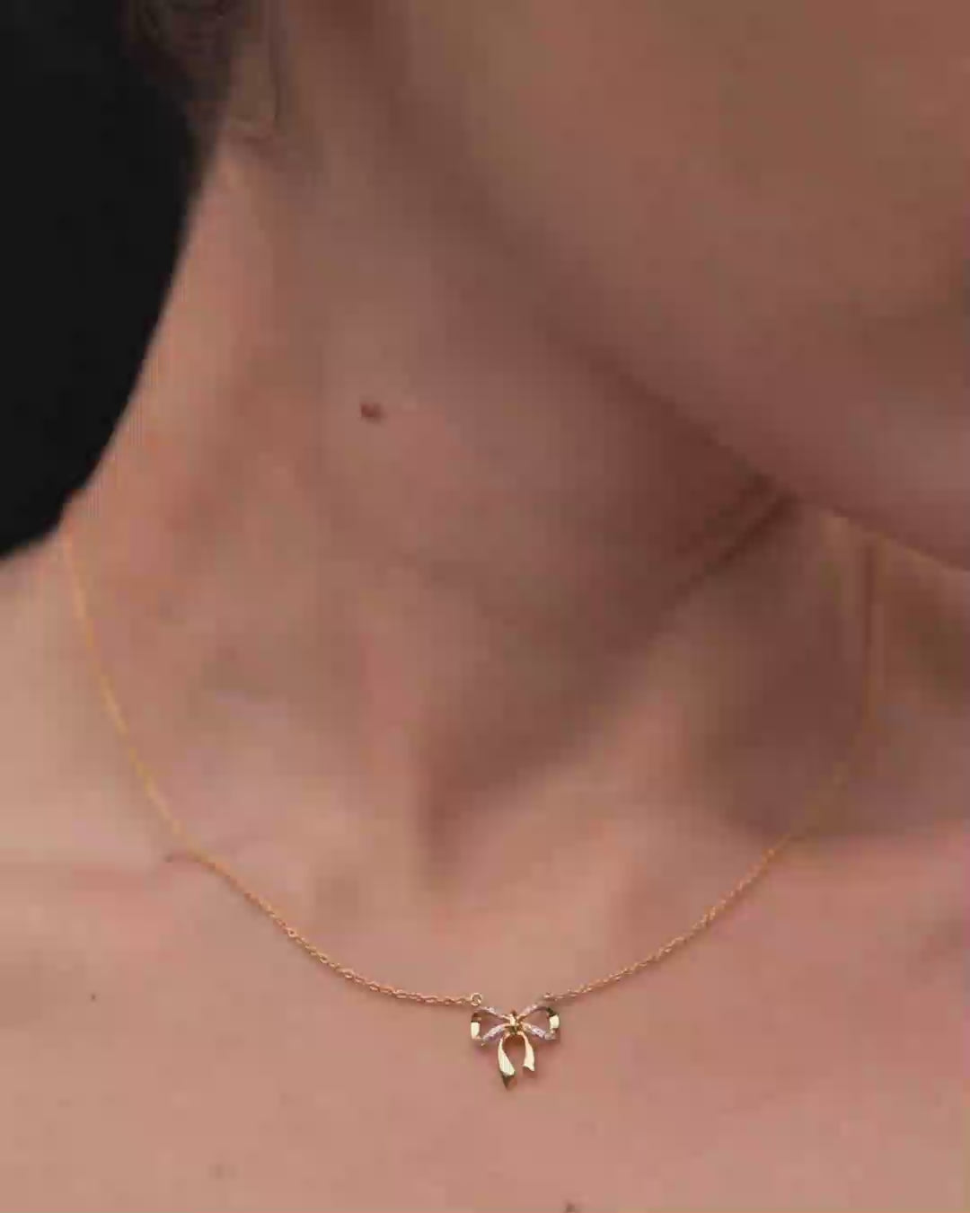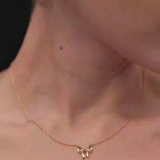 This necklace features a gold and moissanite bow pendant symbolizing feminine grace. Paired with a delicate chain, it makes an ideal gift.