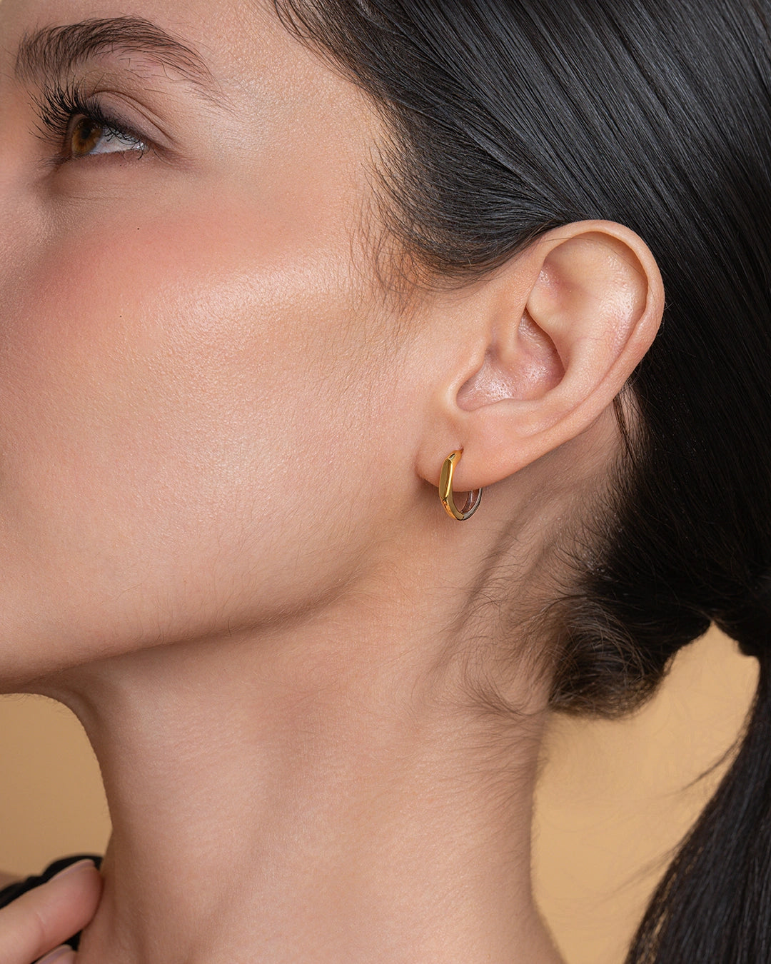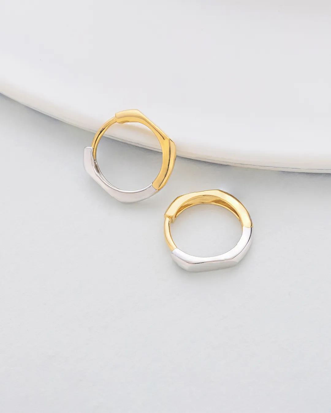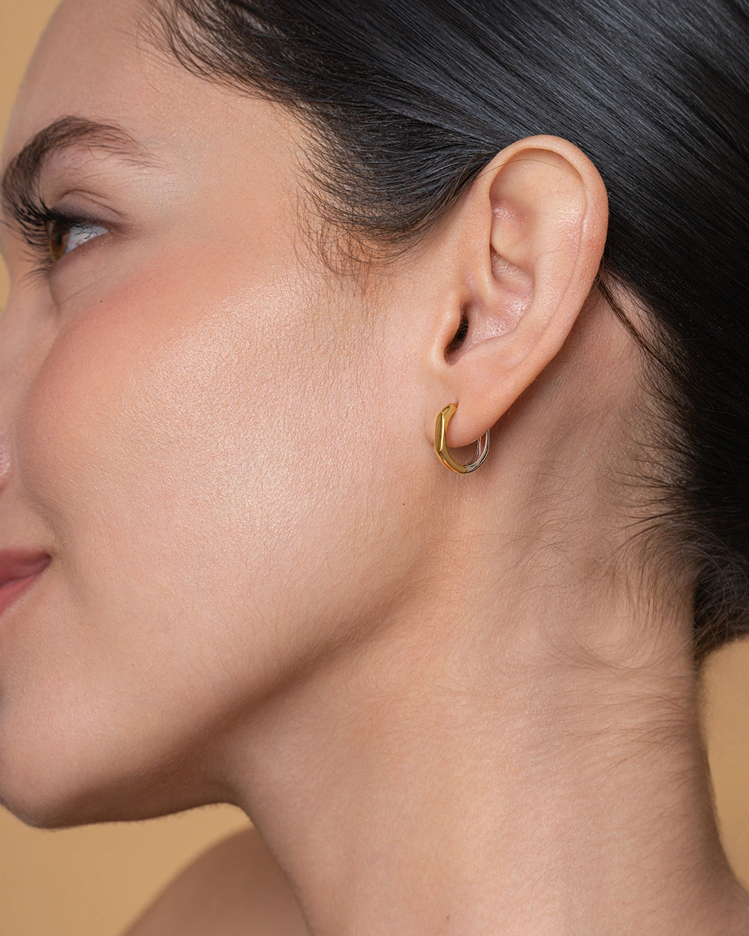 These hoops embrace a clean oval profile with a polished finish and a subtle bi-metal detail, designed for timeless simplicity.