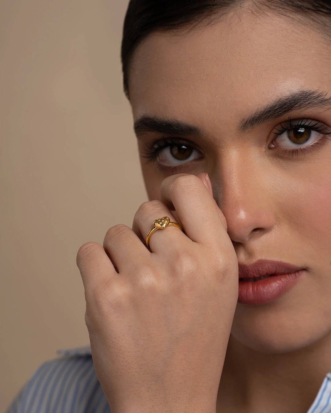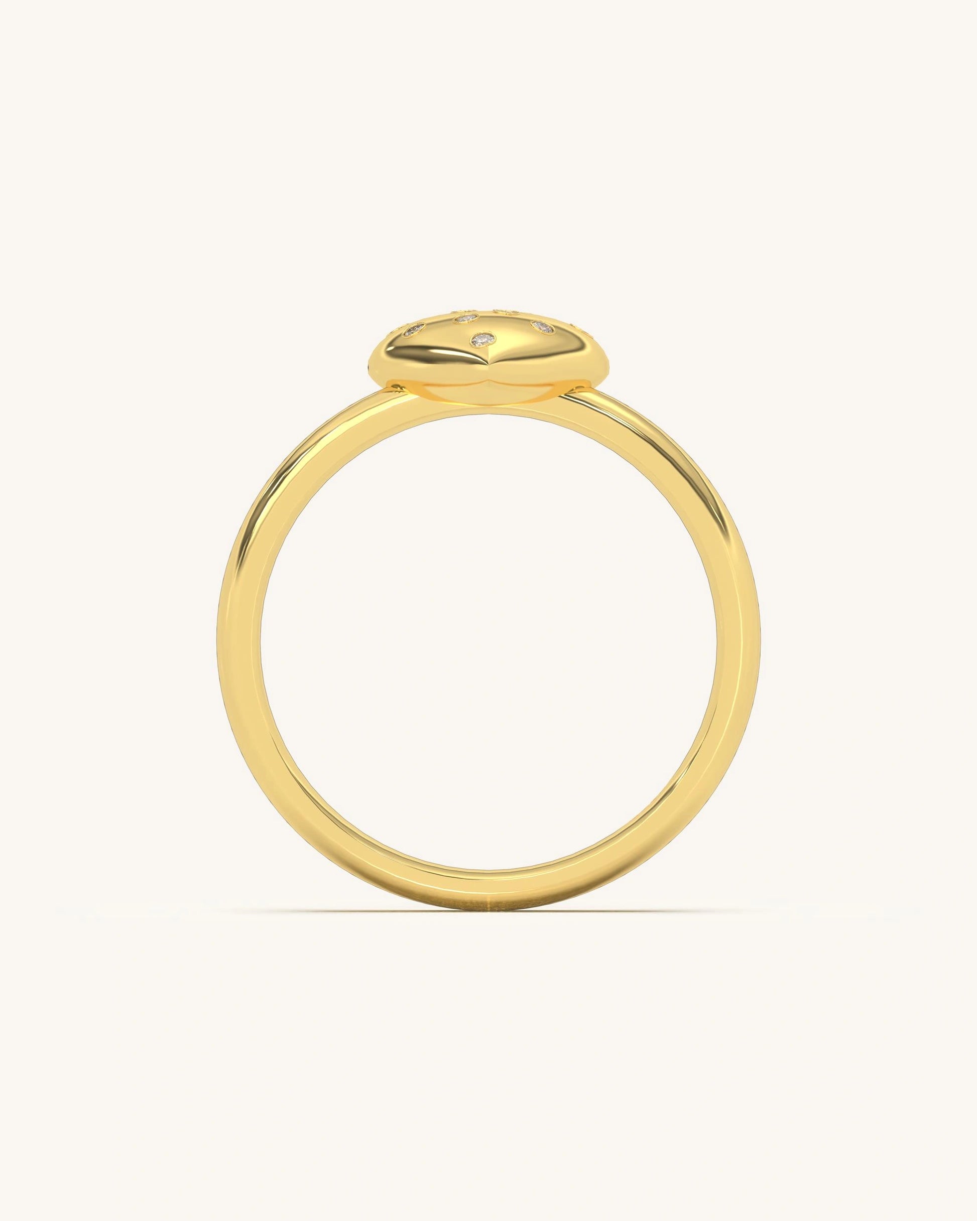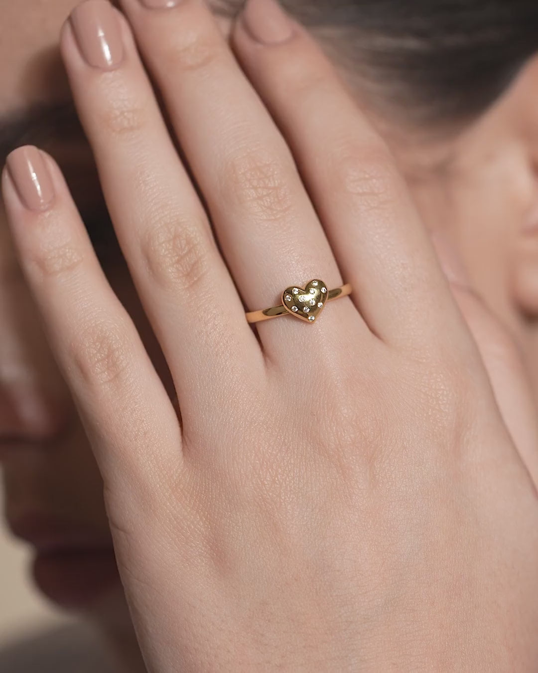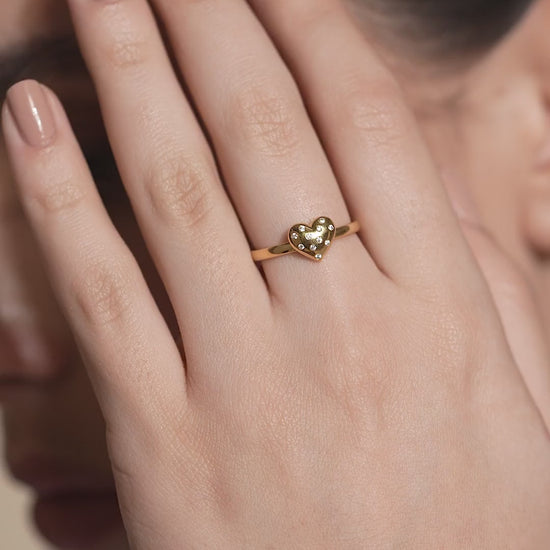 A cute puffed heart ring in glossy yellow tone, studded with tiny sparkling stones across the surface.