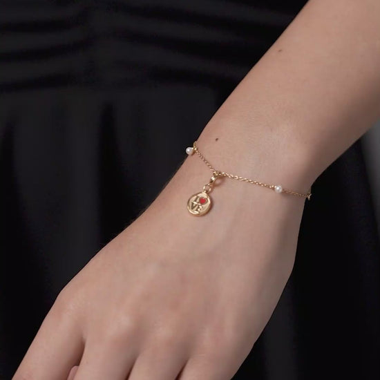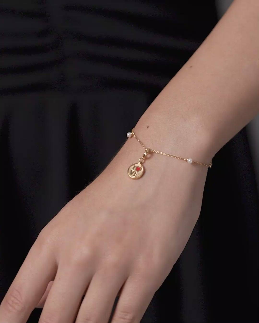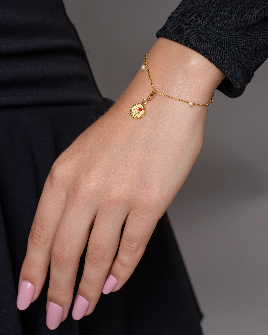 Circular gold-tone pendant with the word LOVE embossed, highlighted by a red heart replacing the 'O'.