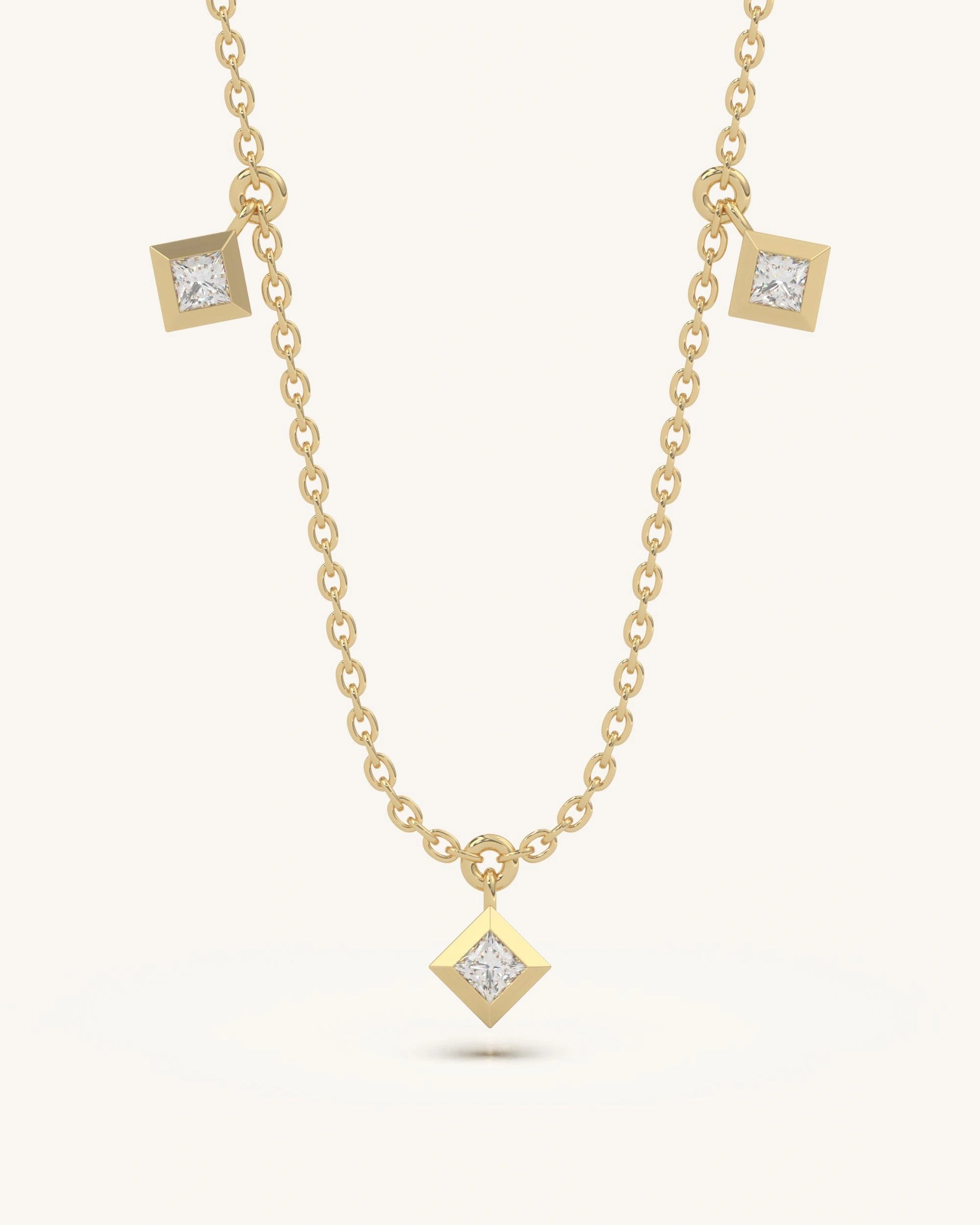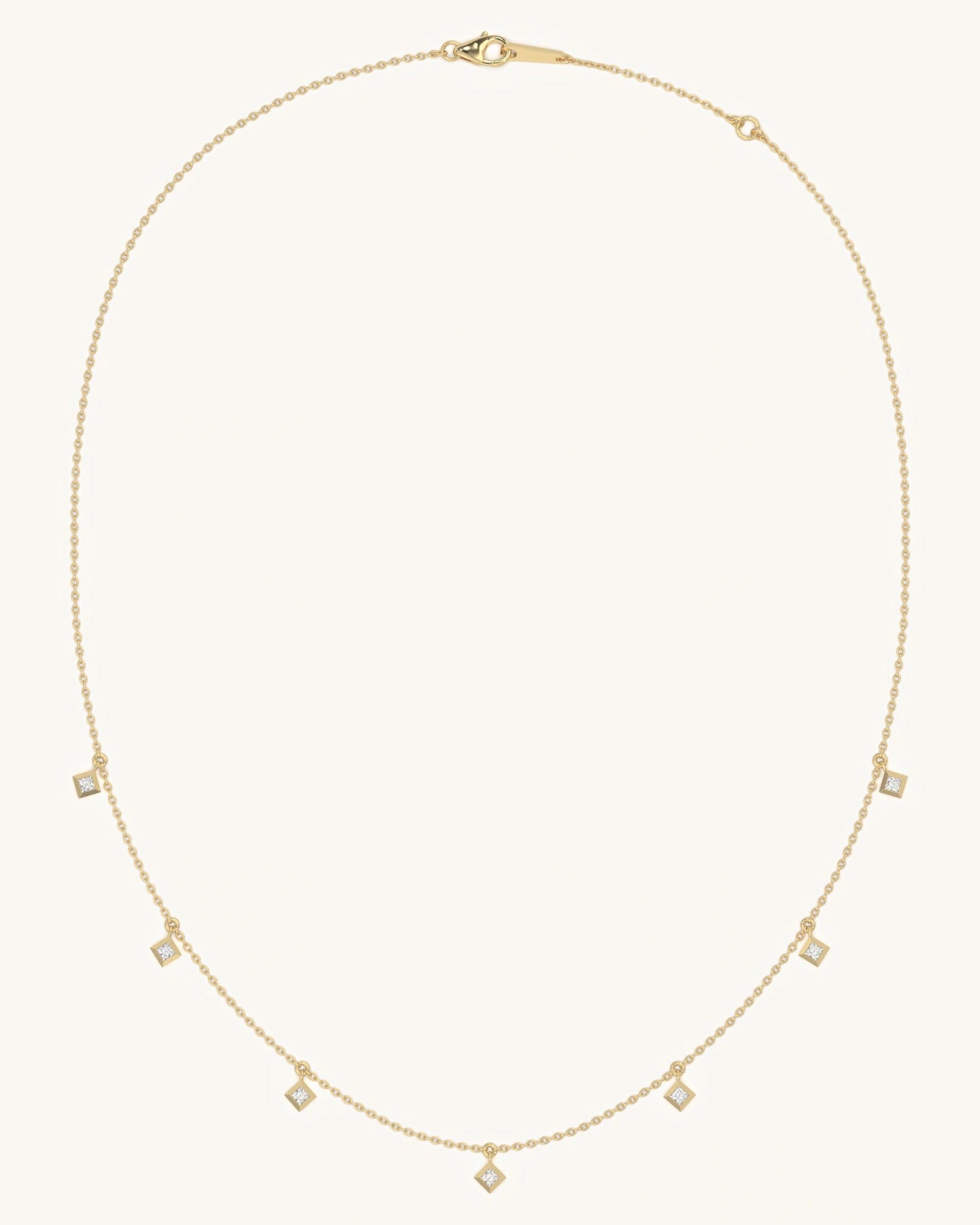Composed of solid 925 sterling silver with gold plating, each charm is set with high-quality moissanite diamonds. The necklace is lightweight and easy to wear while adding sparkle to any ensemble.