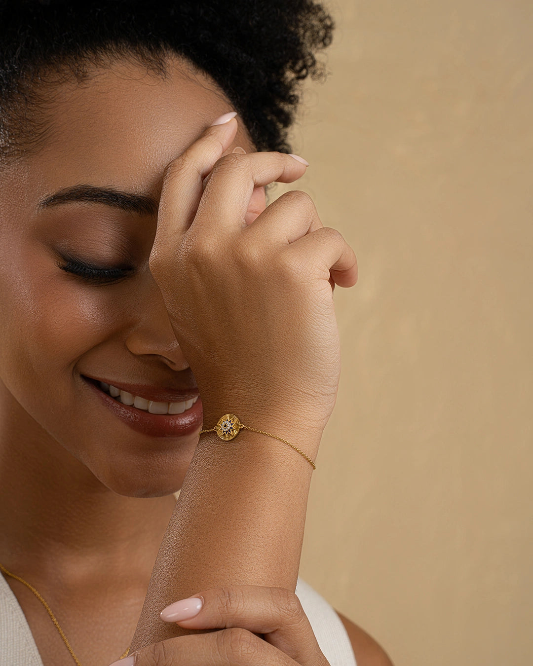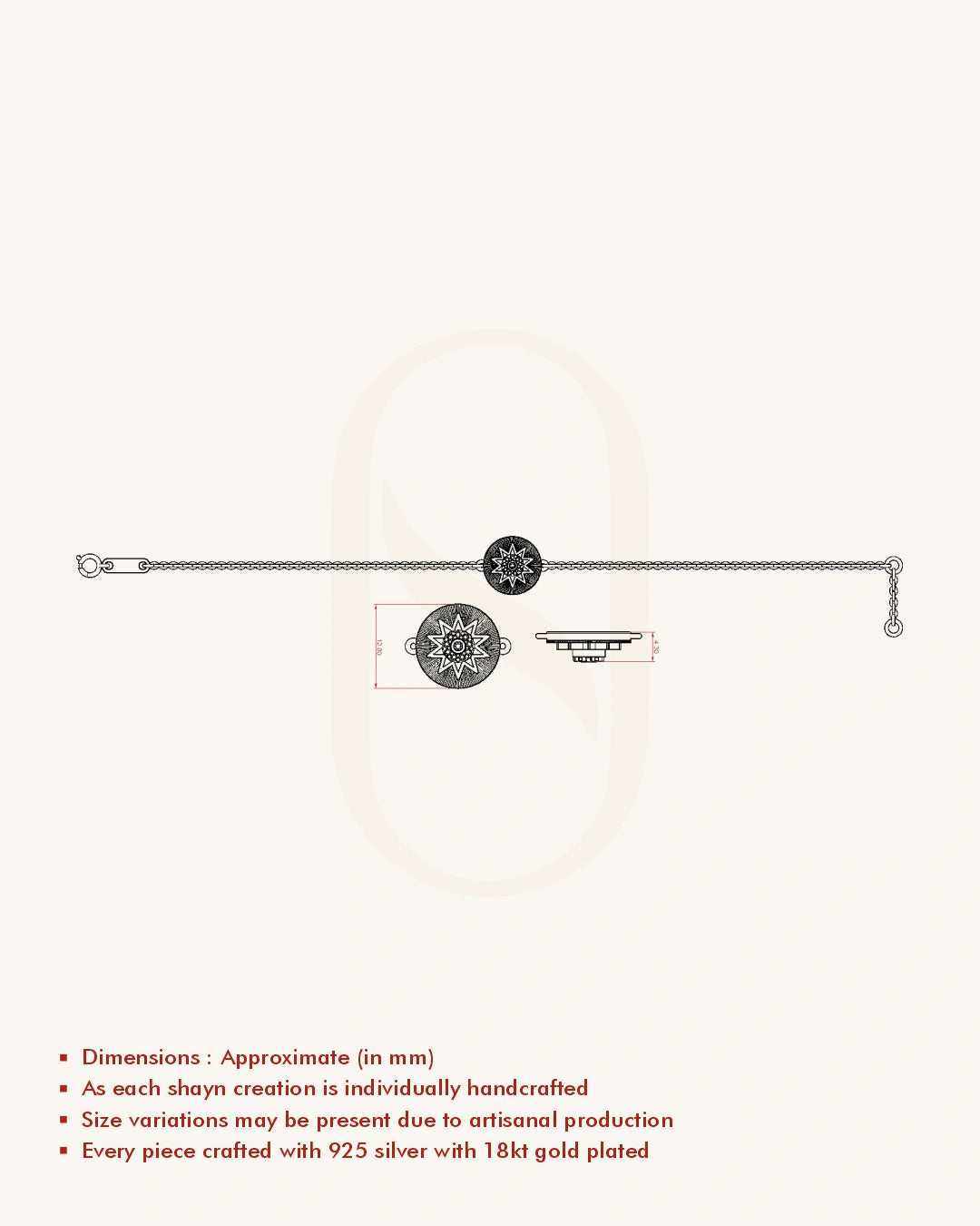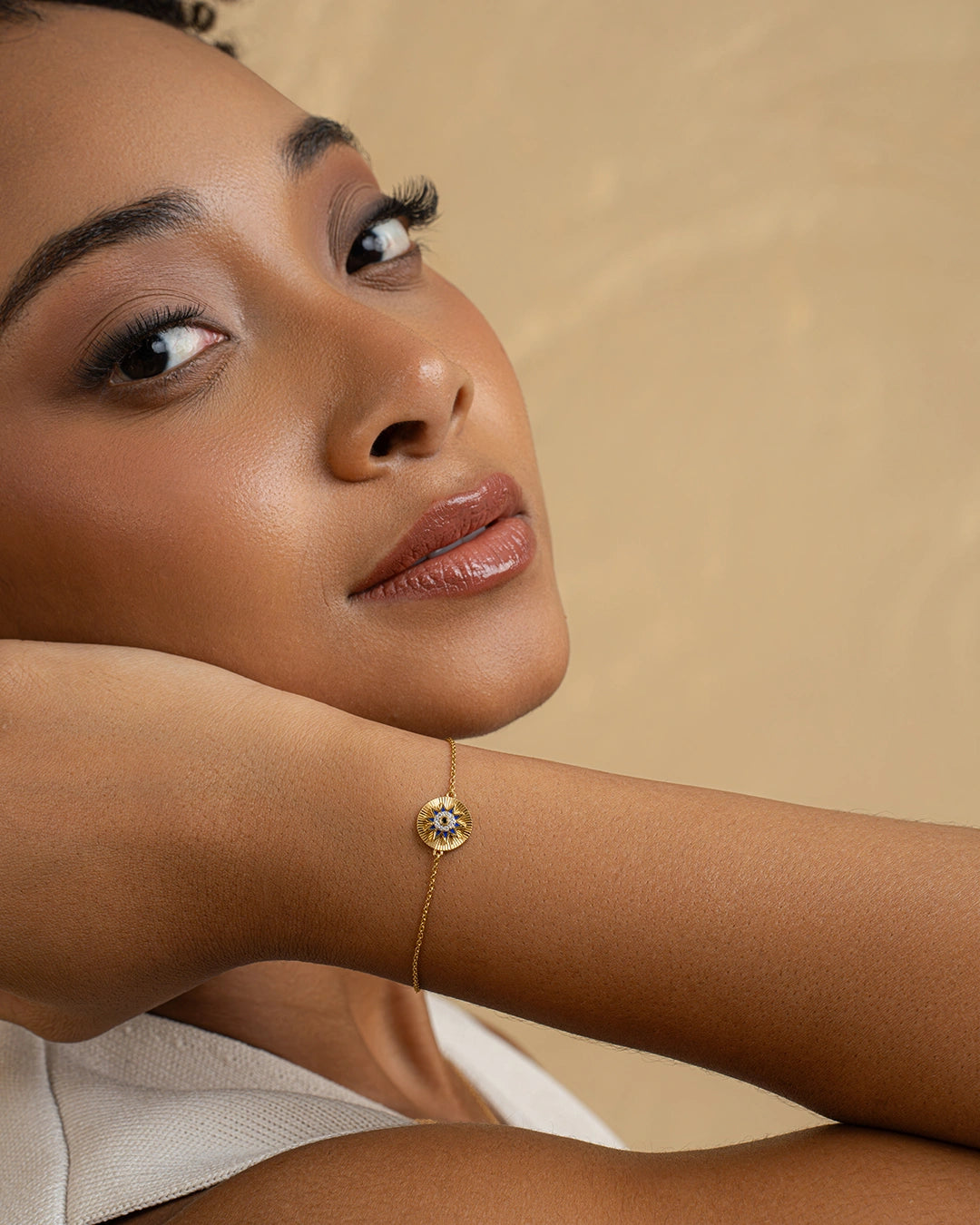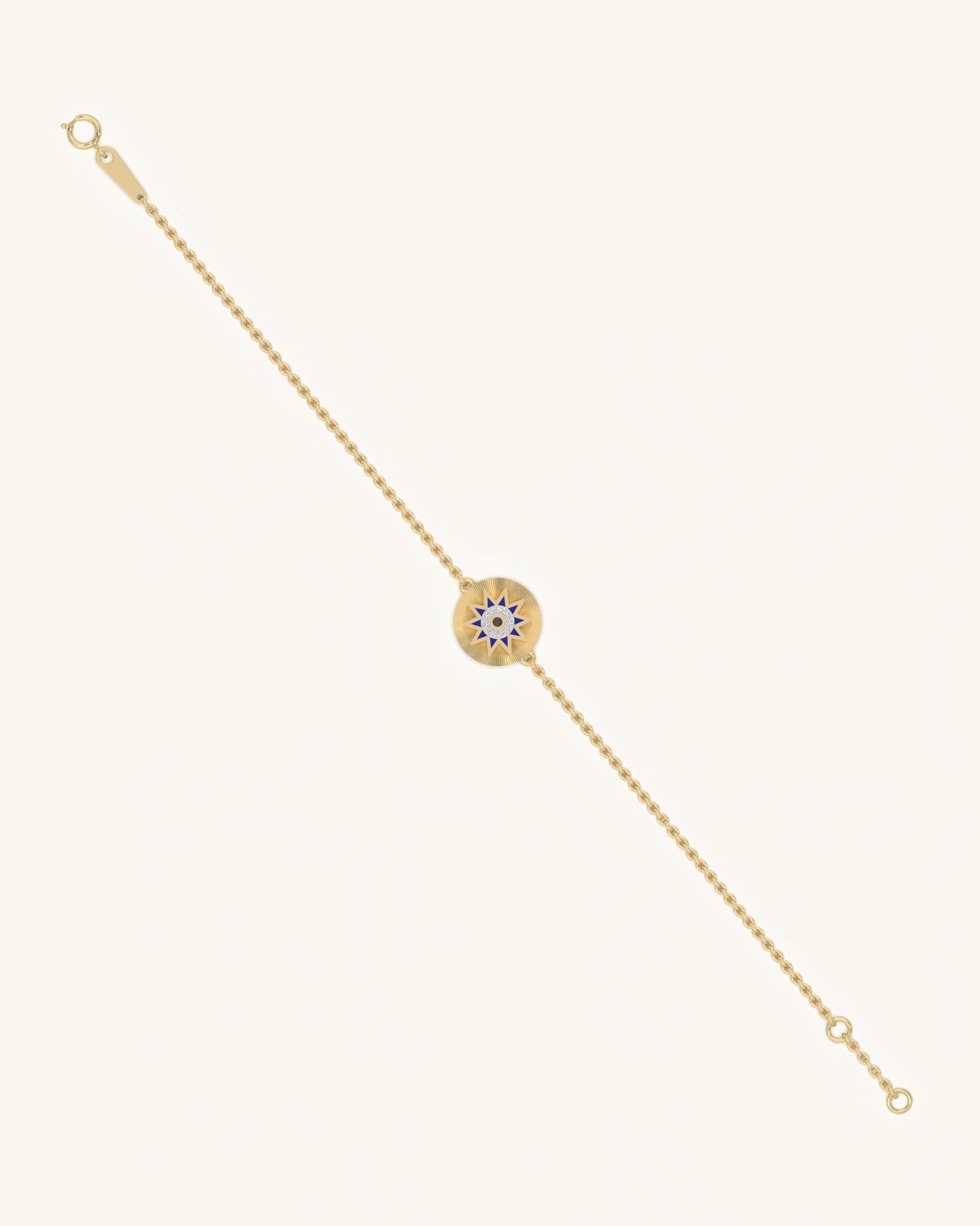 Created from polished yellow gold with enamel detailing, this bracelet reflects a blend of ancient symbolism and modern geometry for a sleek spiritual talisman.