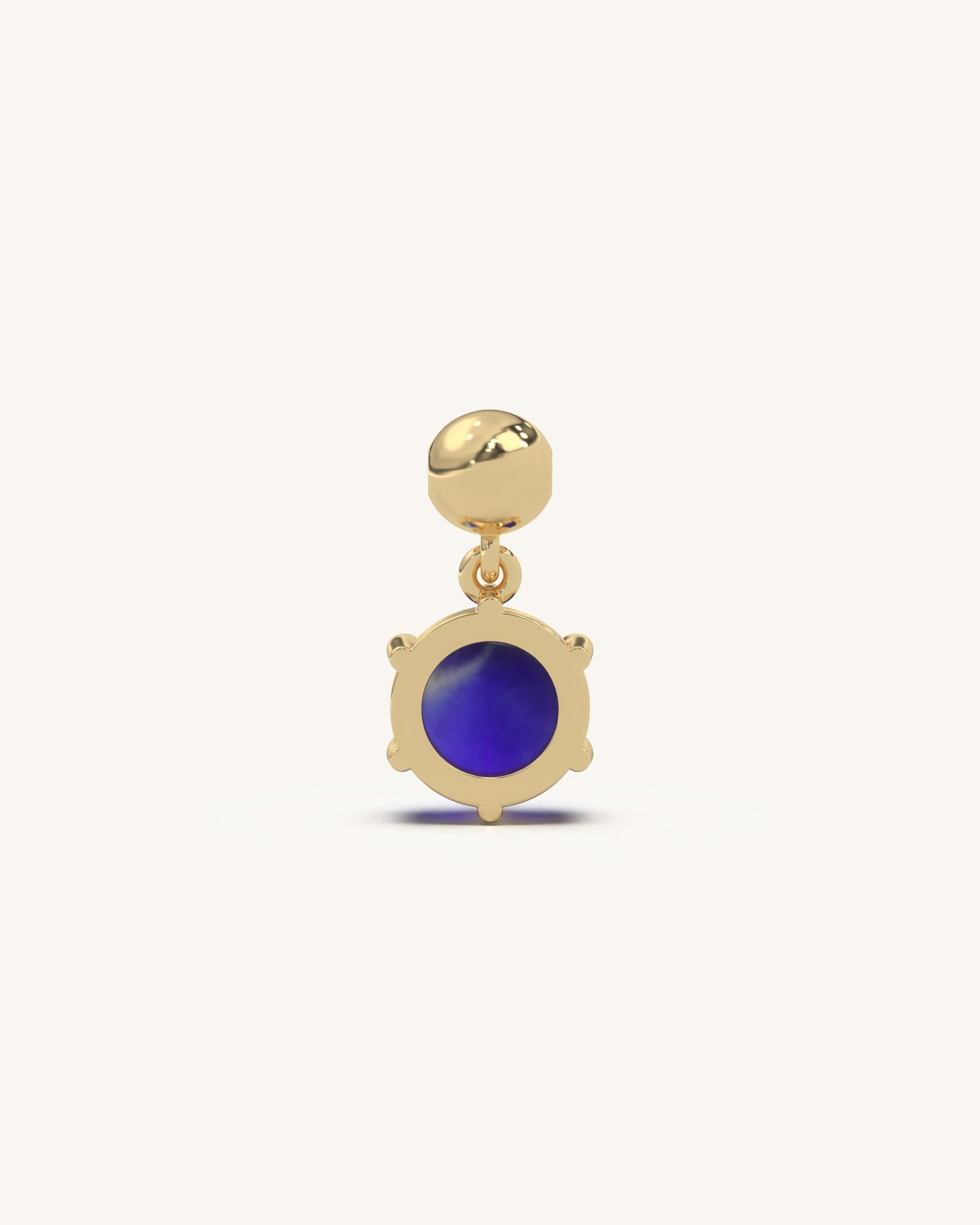 Glossy round blue stone charm in a radiant 925 Sterling Silver With 18KT Gold Vermeil frame with elegant prong detailing.