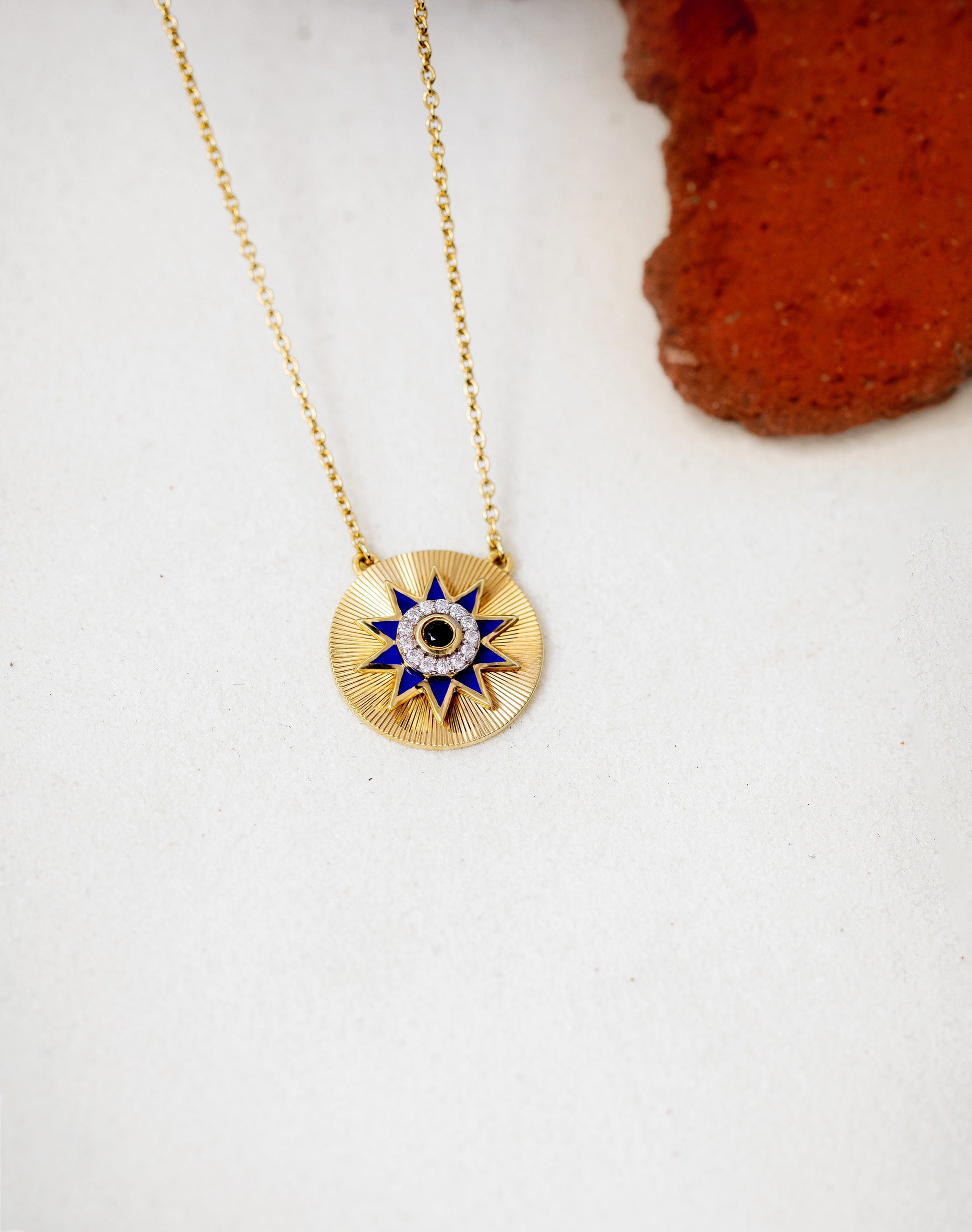 Designed in fine yellow gold with vibrant enamel, this piece combines the symbolism of the evil eye with star-like geometry and subtle stone embellishments for added elegance.