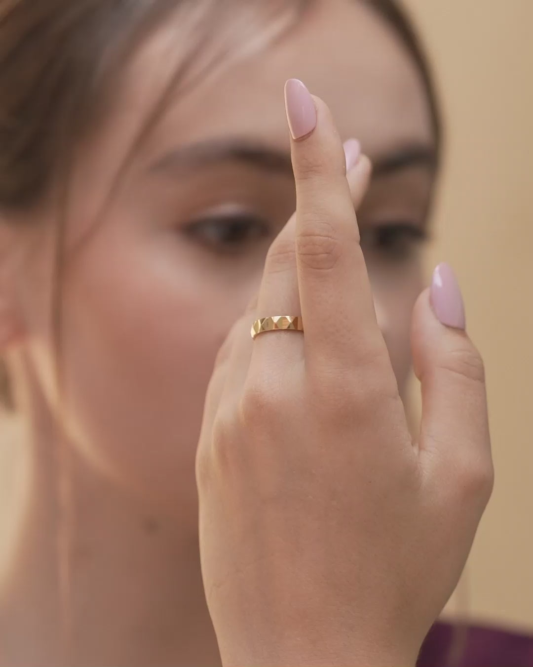 A clean and polished gold band designed with an angled diamond surface. Its subtle symmetry adds a hint of edge while maintaining a Timeless silhouette.