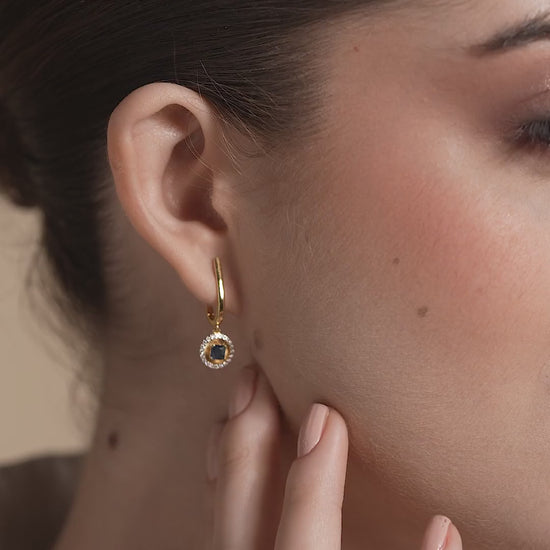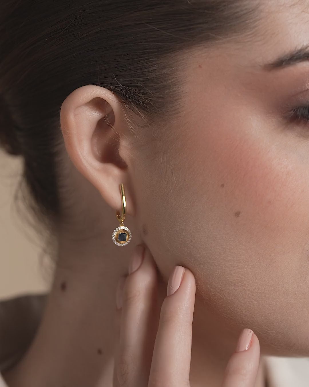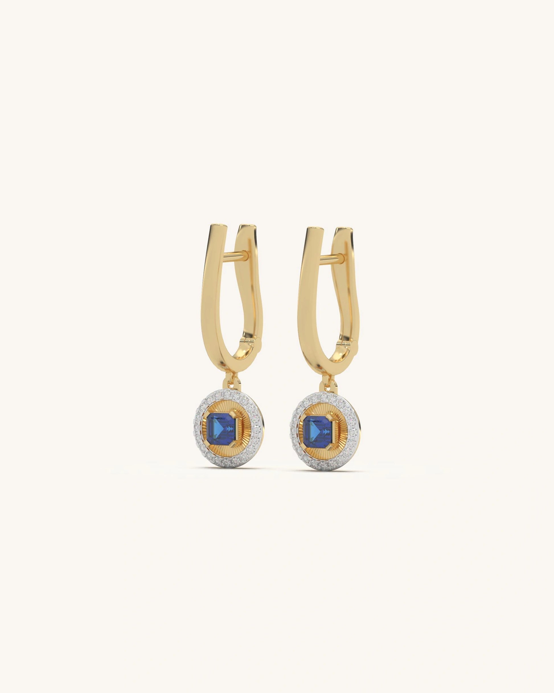 These drop earrings feature sunburst-inspired designs with radiant blue centers and moissanite halos. The design adds structured brilliance to any look.