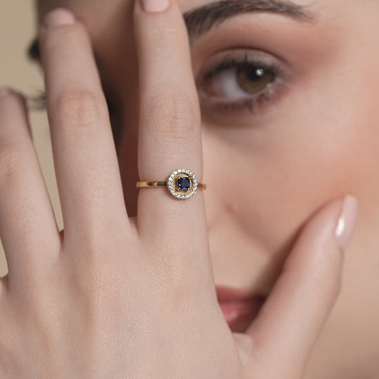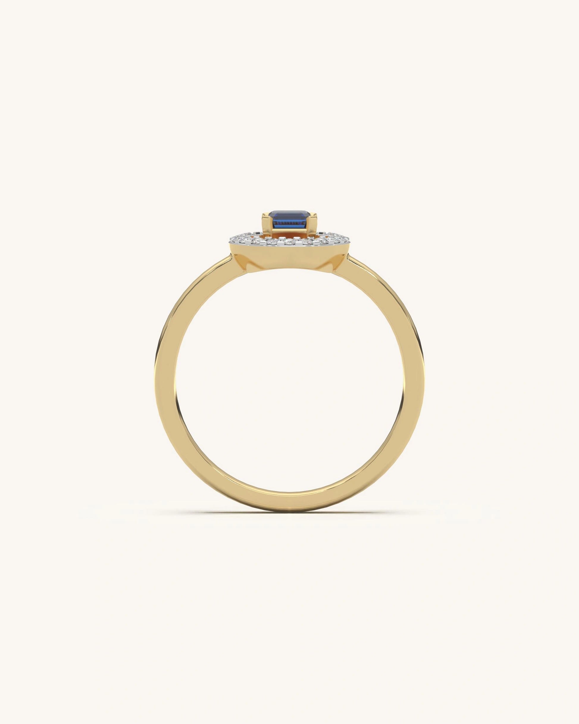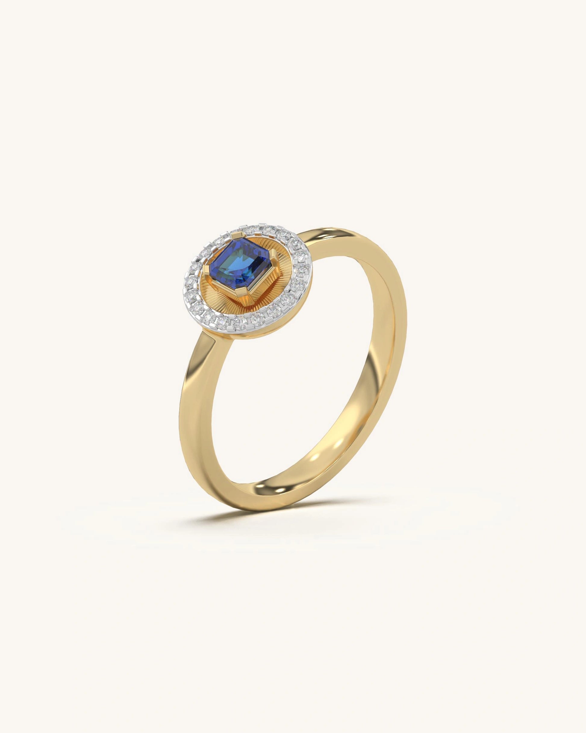 Inspired by sunburst rays, this round halo ring features a radiant cut center with moissanite accents. The open starburst design gives it a bold modern twist.
