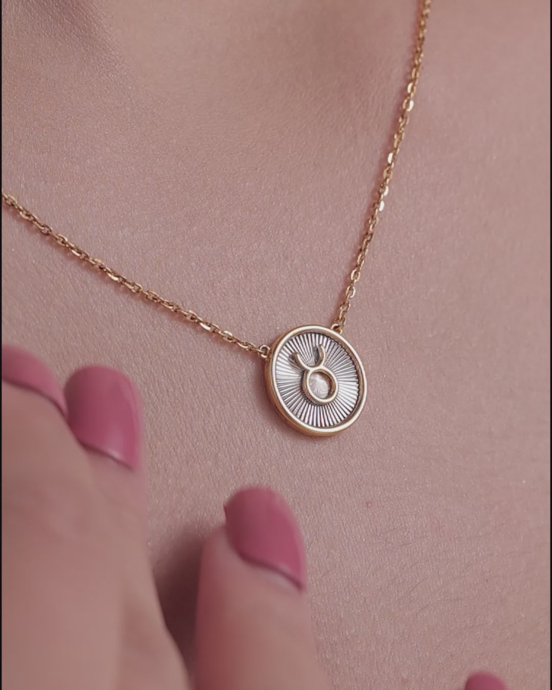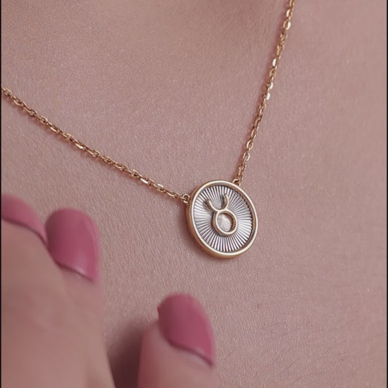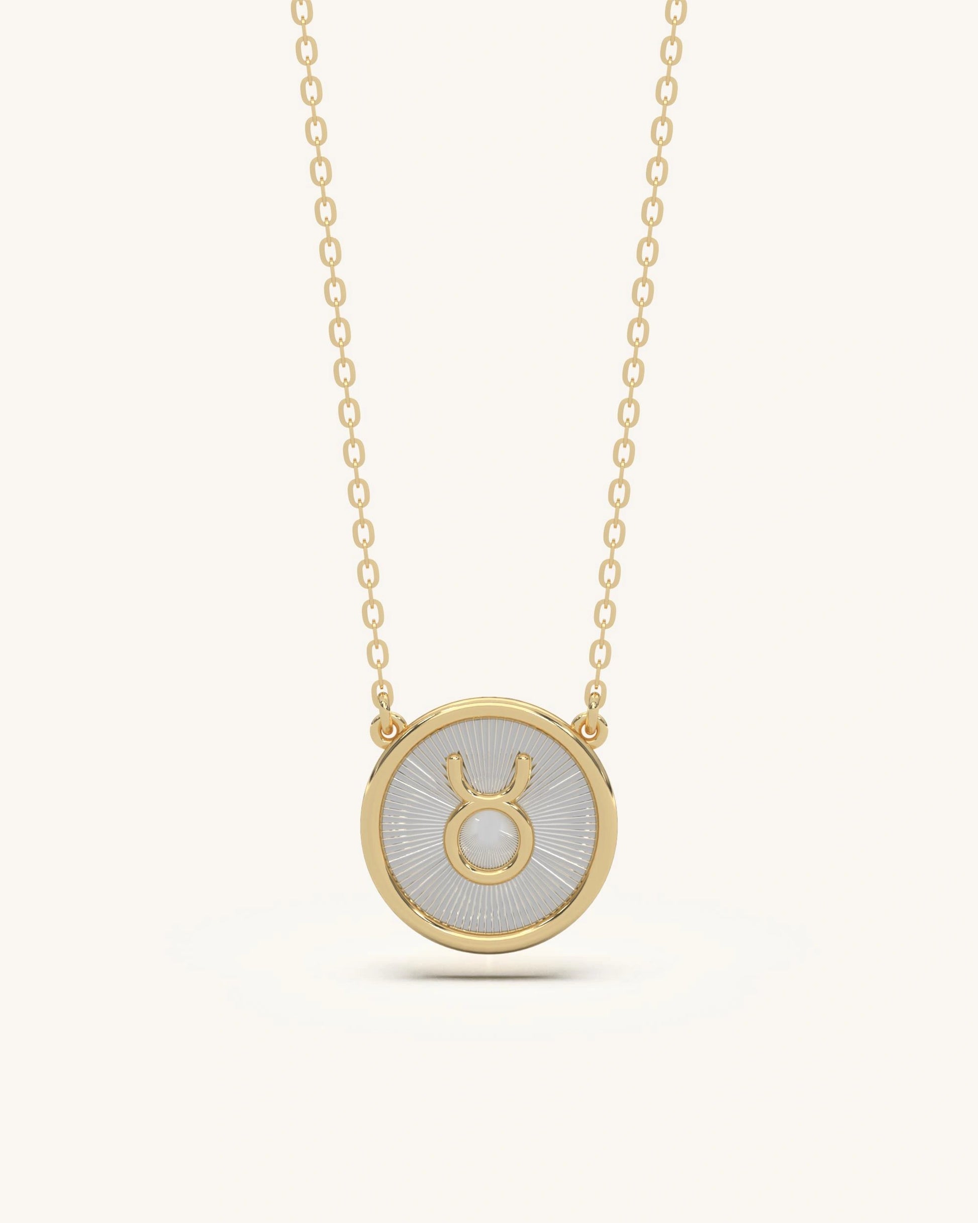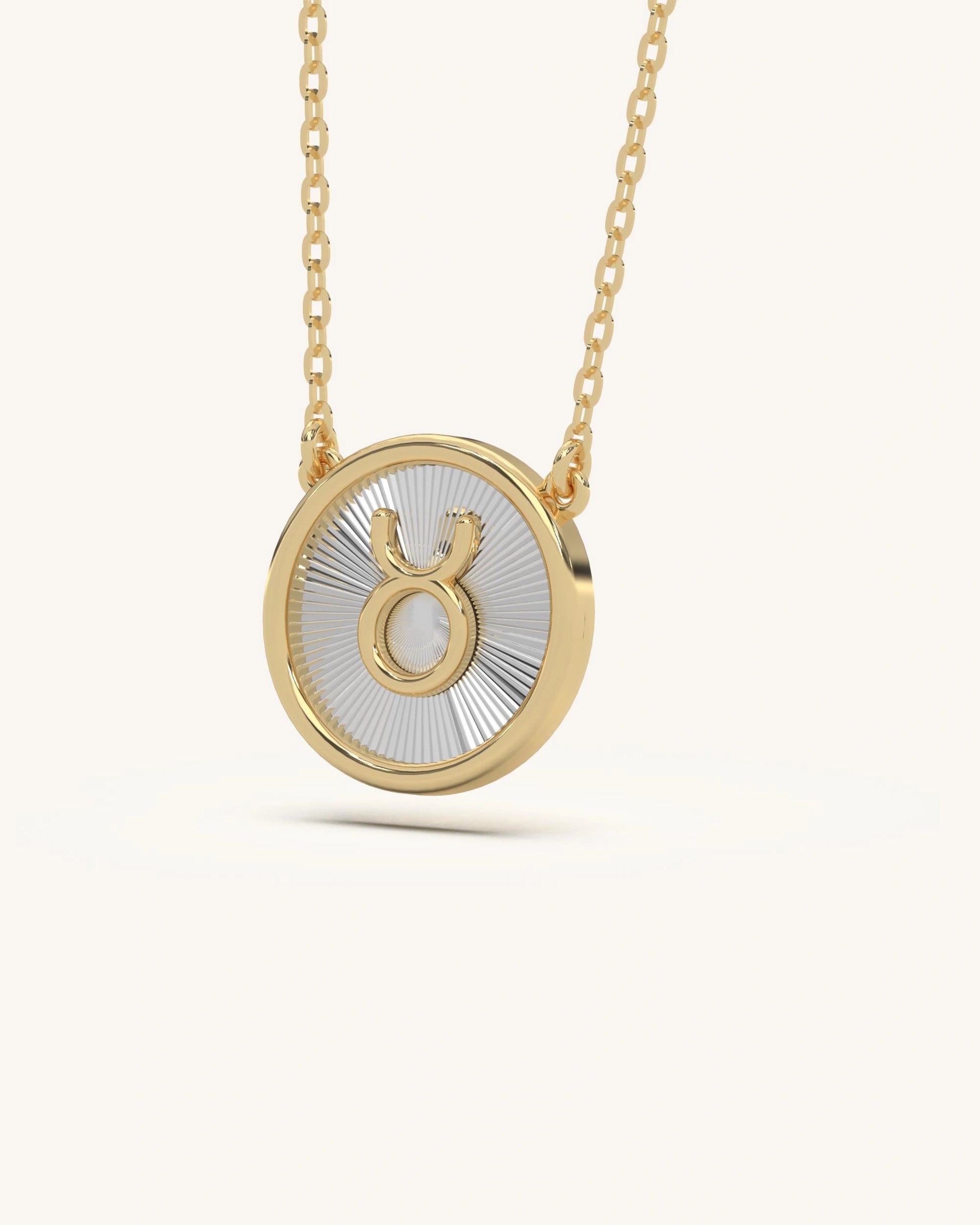 A striking round pendant featuring the iconic Taurus horn symbol at the center. Set against a radiant textured base, this necklace blends simplicity with symbolism.