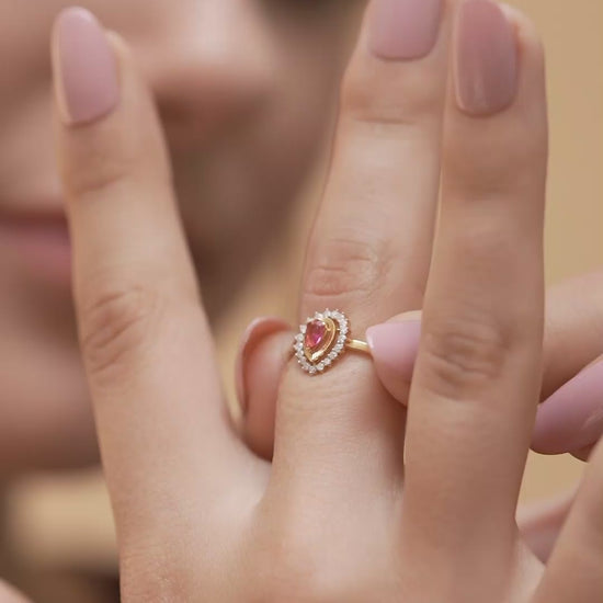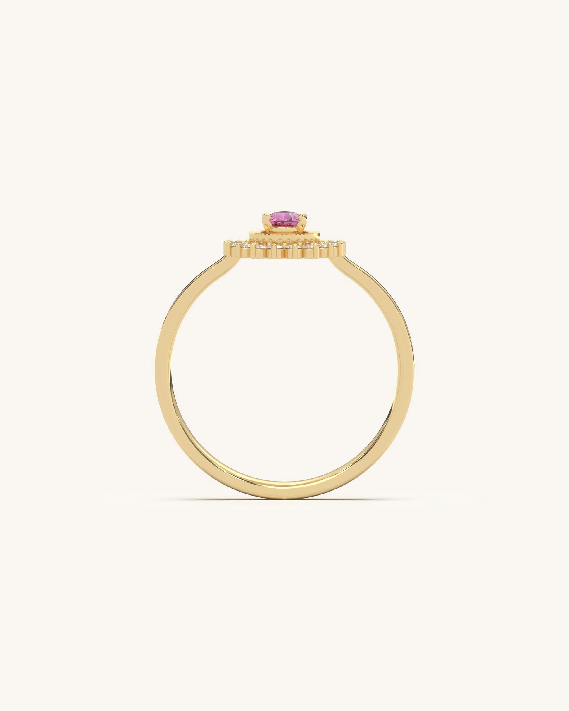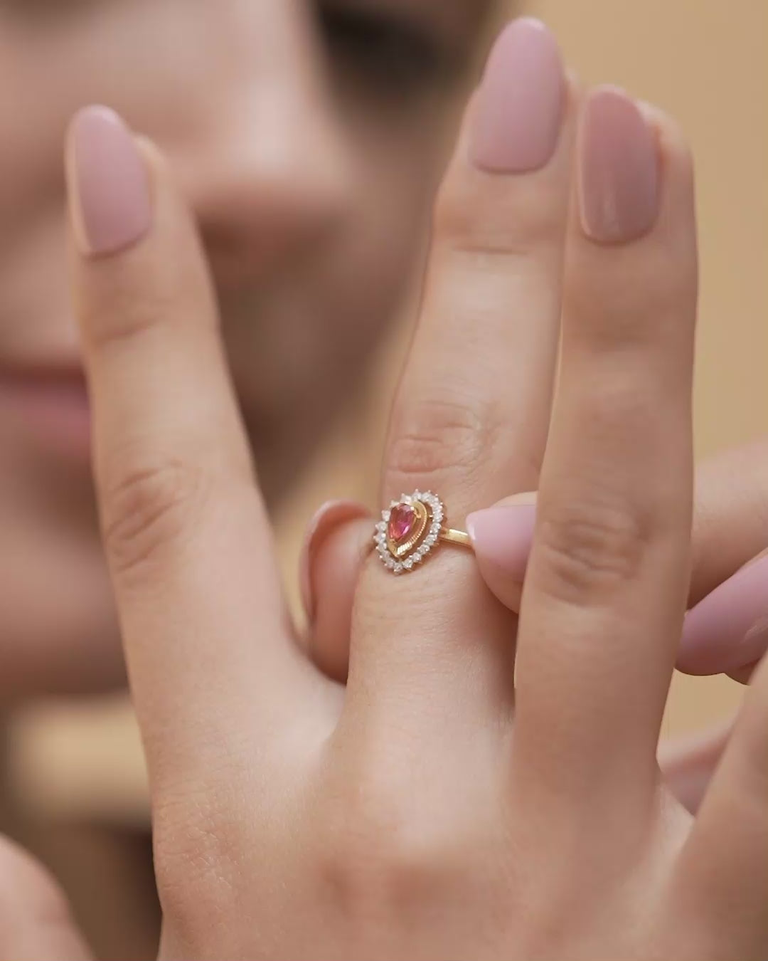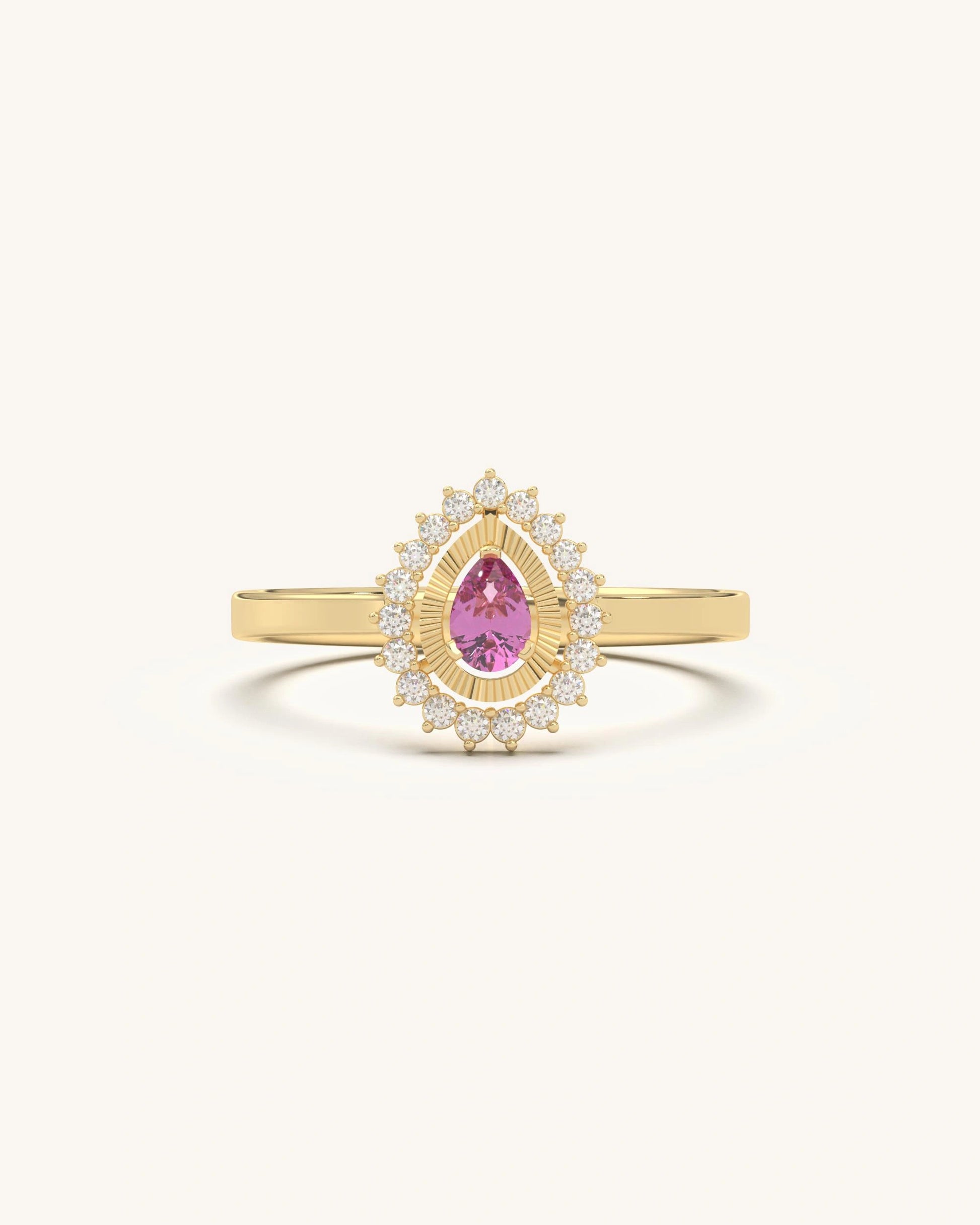A pink pear-shaped gem shines at the center, surrounded by a starburst of white stones that radiate charm and elegance.