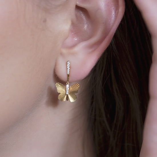 These statement butterfly earrings feature wide textured golden wings with a diamond-studded center bar, blending bold design with radiant sparkle.
