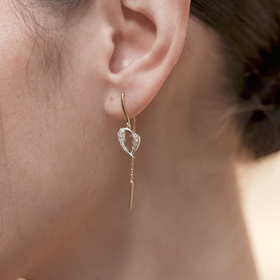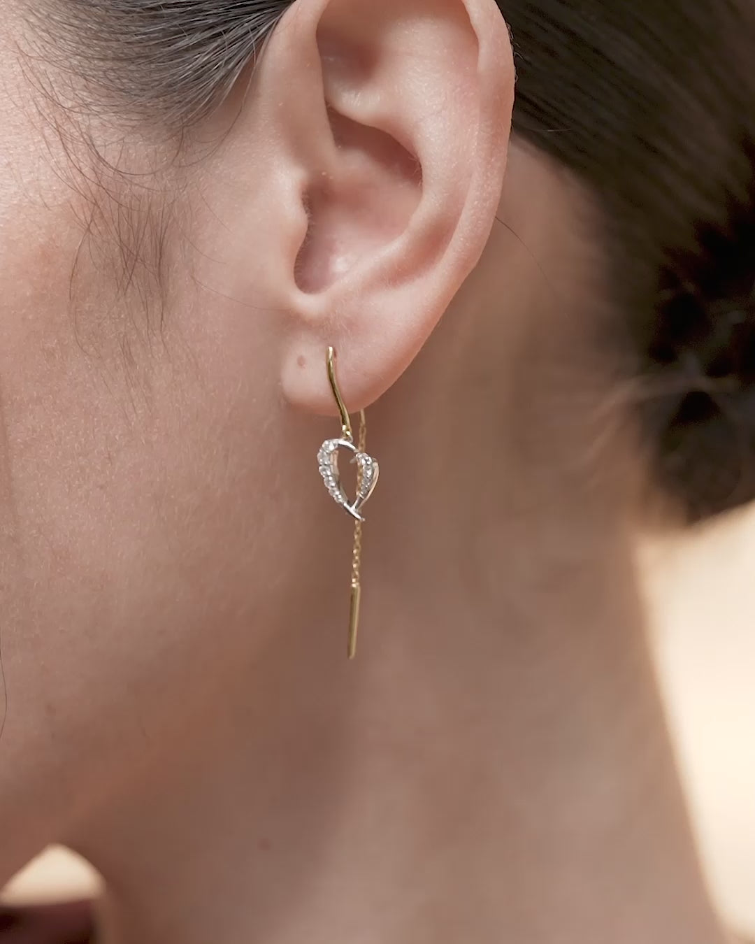 These earrings feature a heart charm lined with moissanite stones and suspended from a delicate threader chain. The soft gold spike and fine link details bring modern movement.