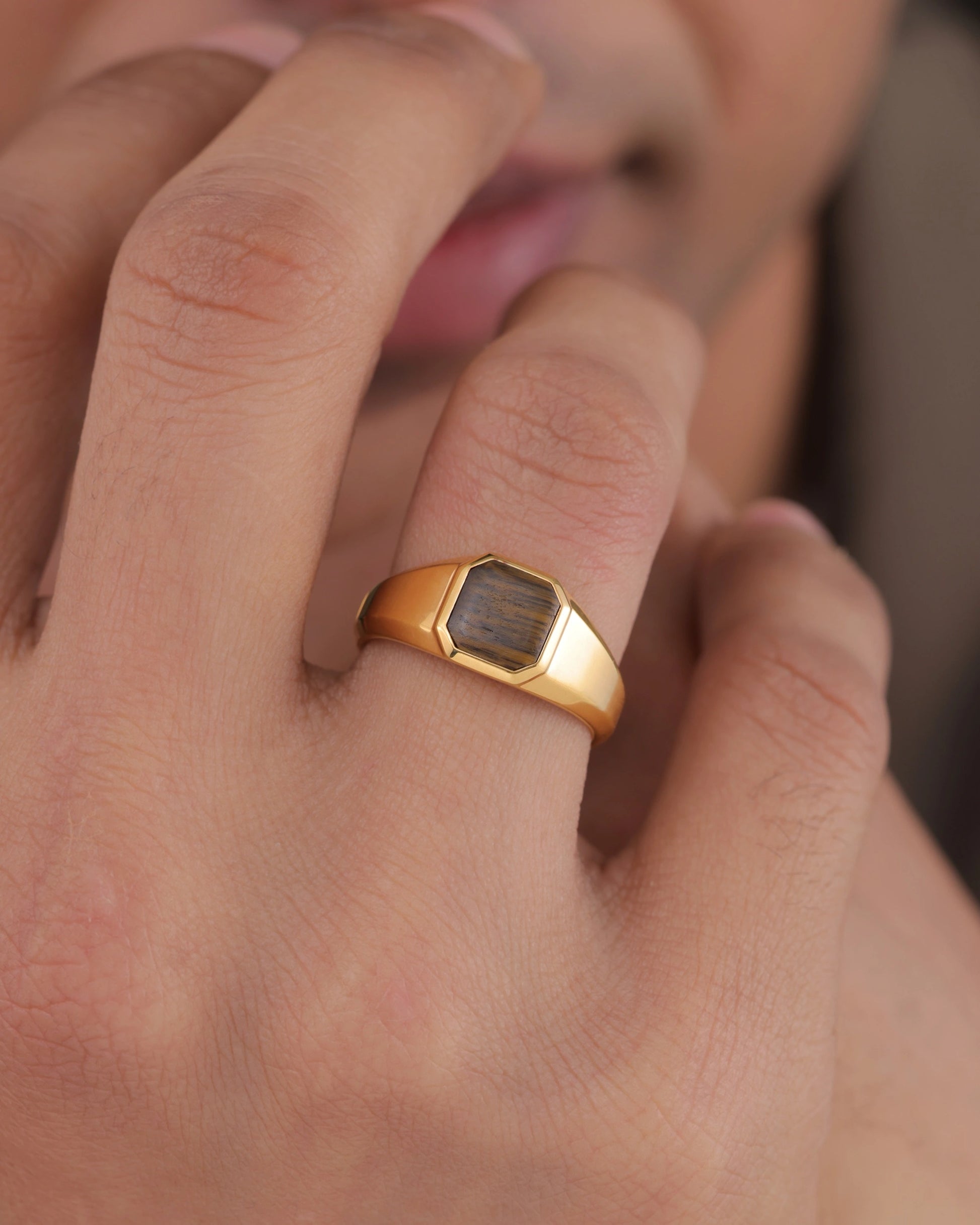 The stone is hand-oriented during the inlay process to ensure the chatoyancy runs horizontally across the face. This thoughtful alignment enhances the ring's visual movement.