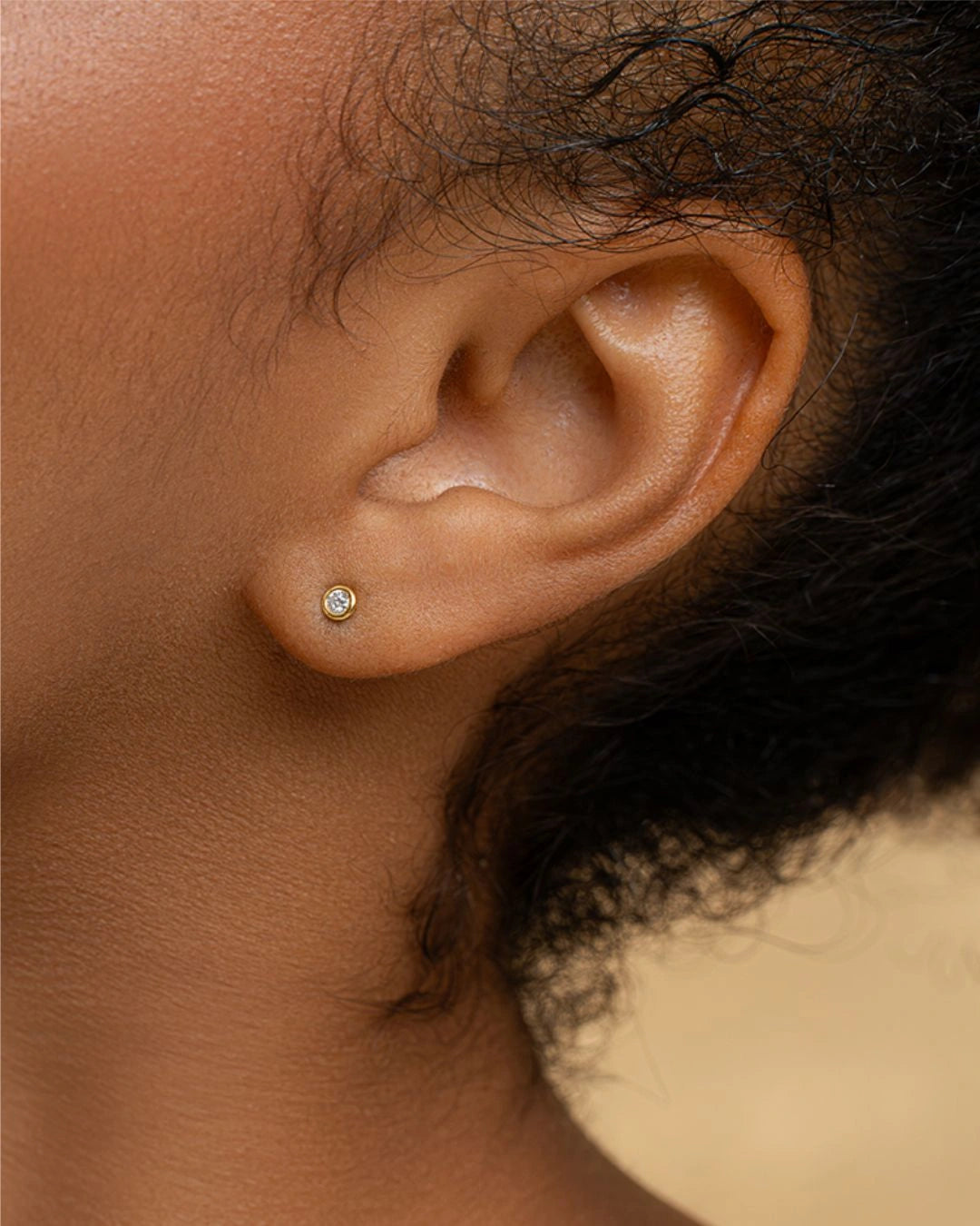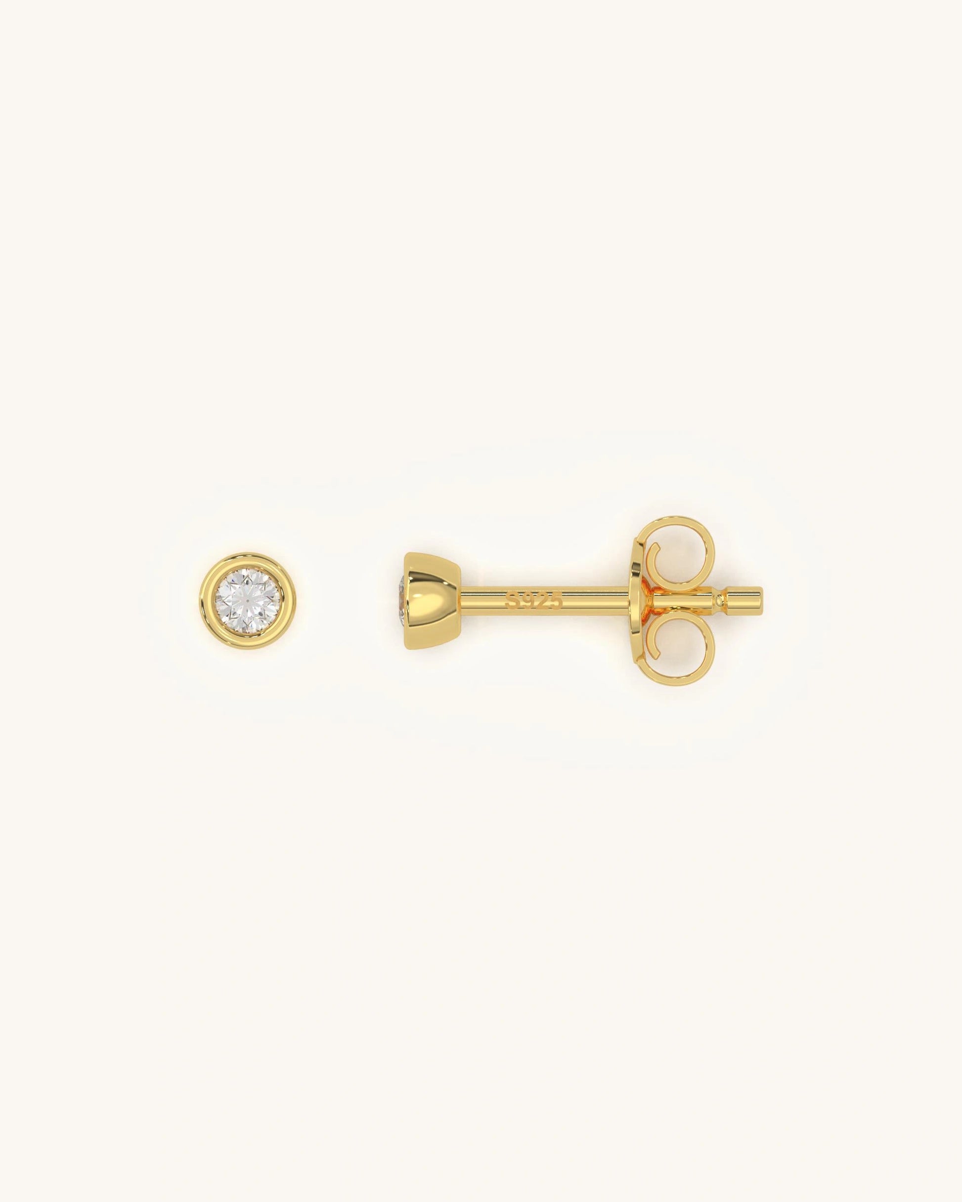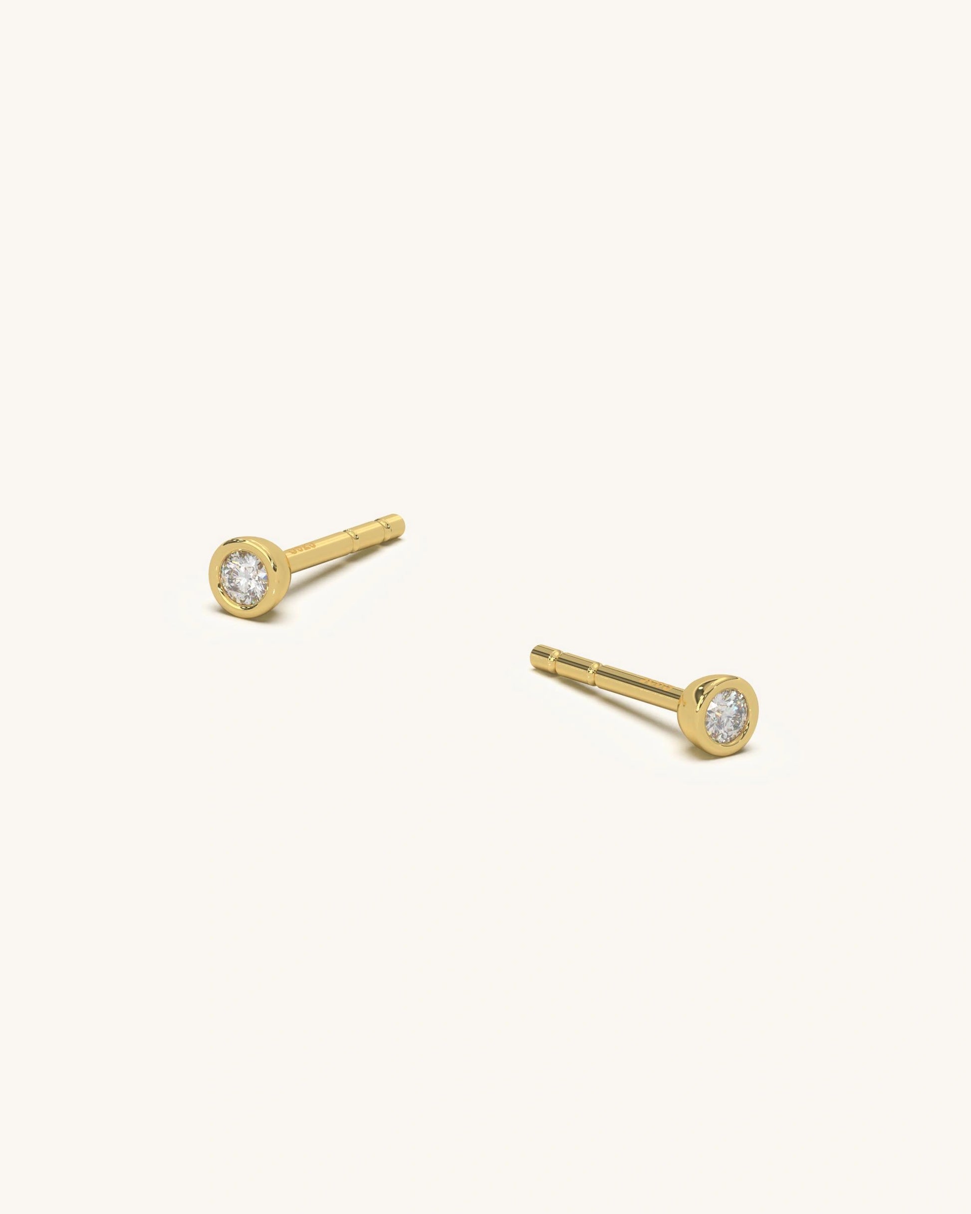 Small round stud earrings with a single moissanite set in a smooth bezel frame. The size is delicate and minimalist, perfect for everyday wear.