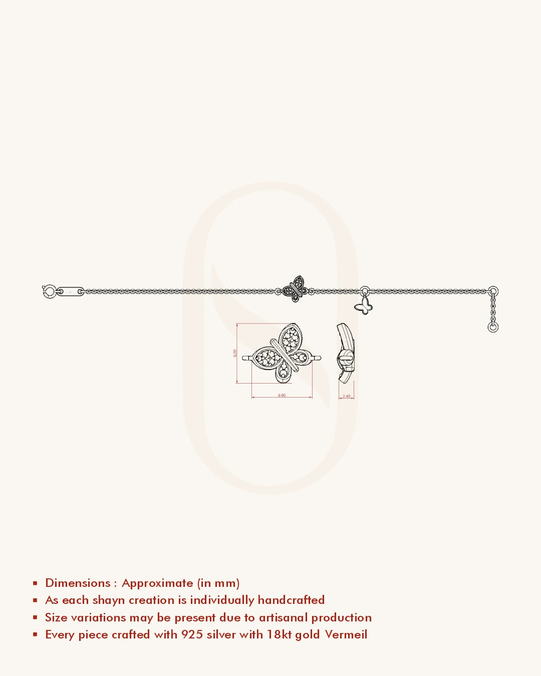 Featuring a dainty butterfly with four moissanite-paved wings and a playful side charm, this bracelet exudes youthfulness and lightness in its design.