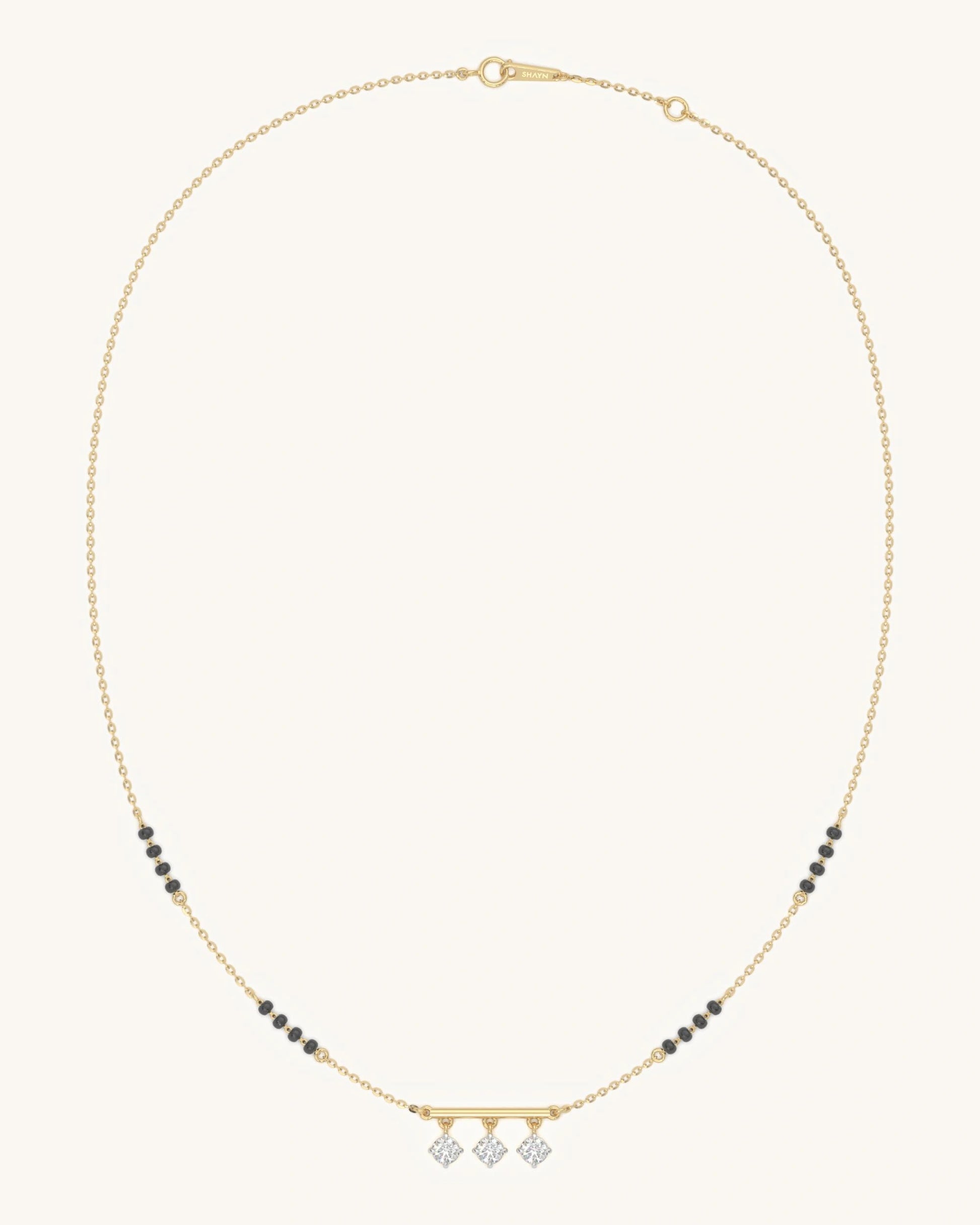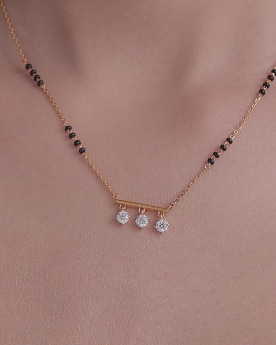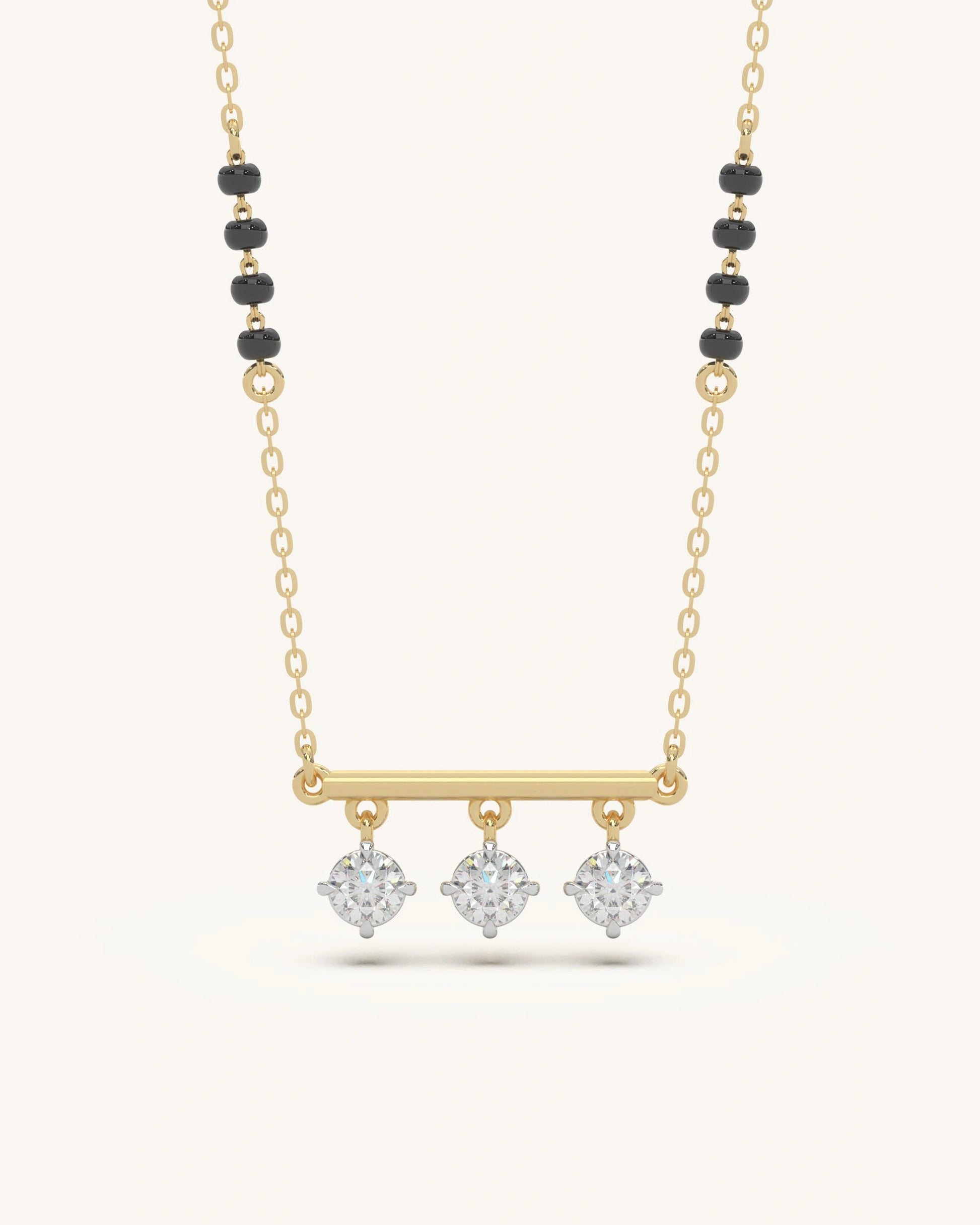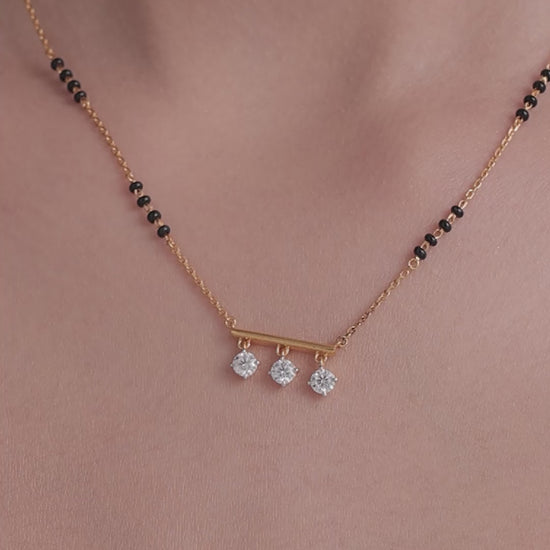 A playful and trendy interpretation of the Mangalsutra. A sleek horizontal gold bar supports three dangling round Moissanites. The movement of the charms adds a dynamic sparkle, making this piece perfect.