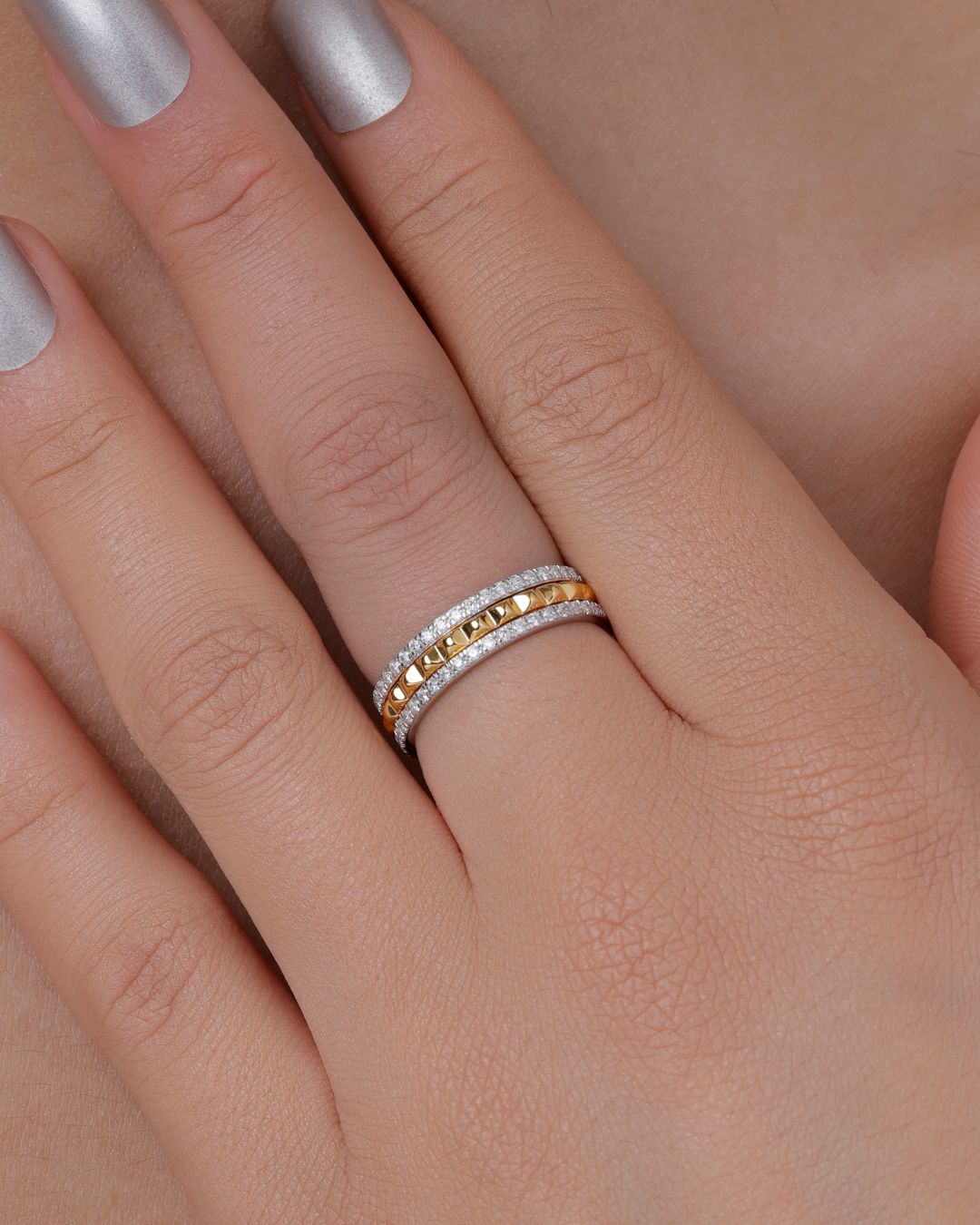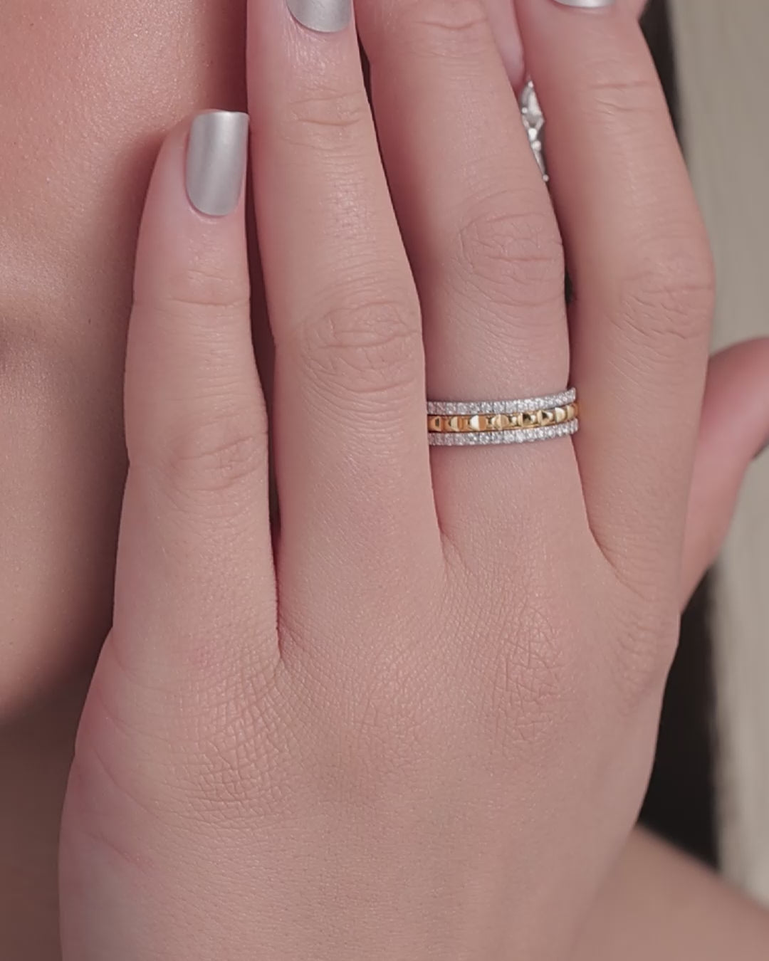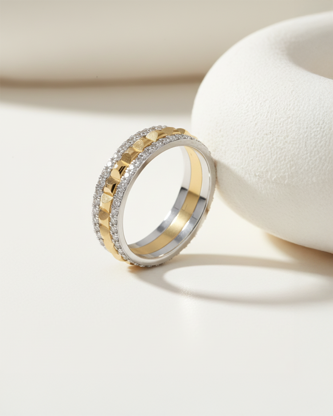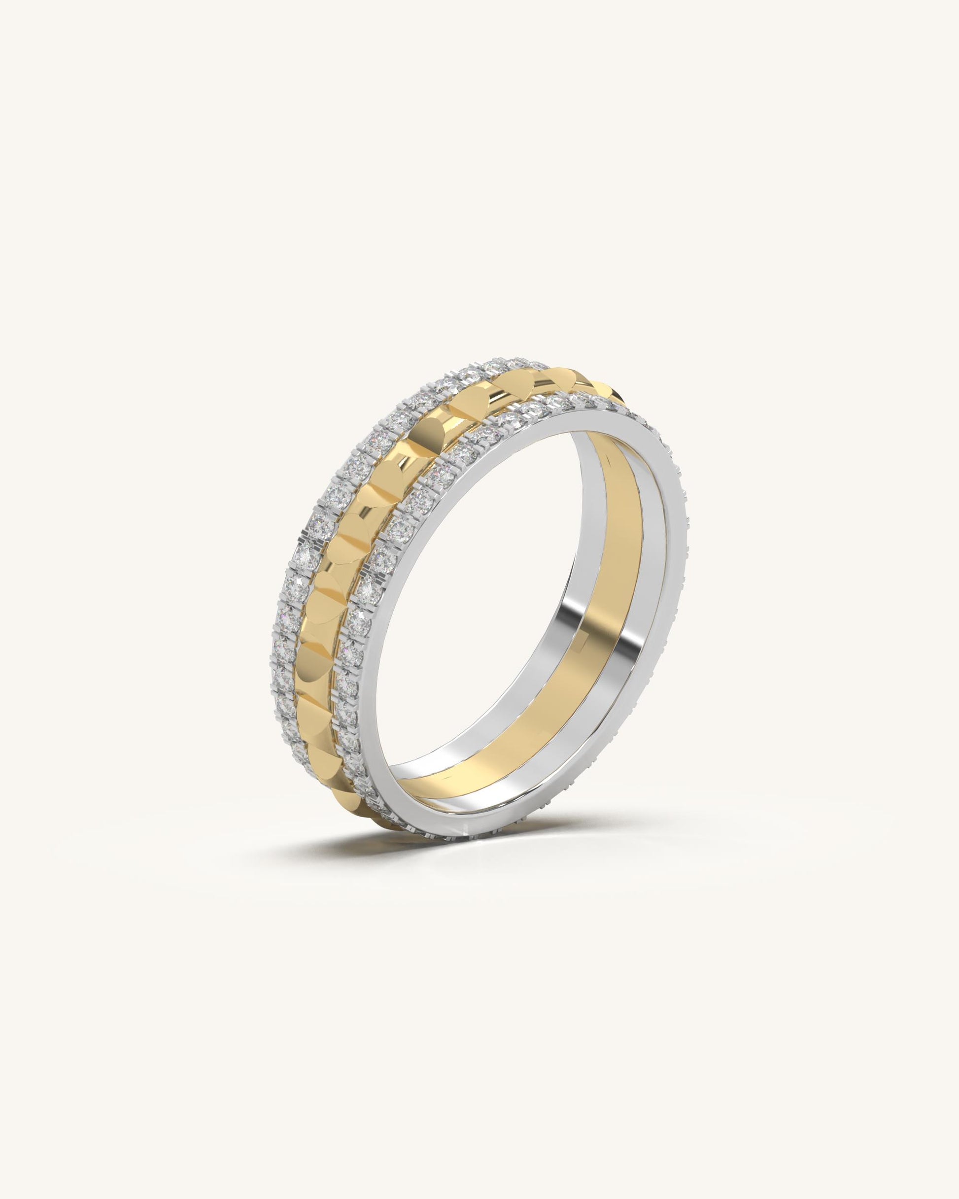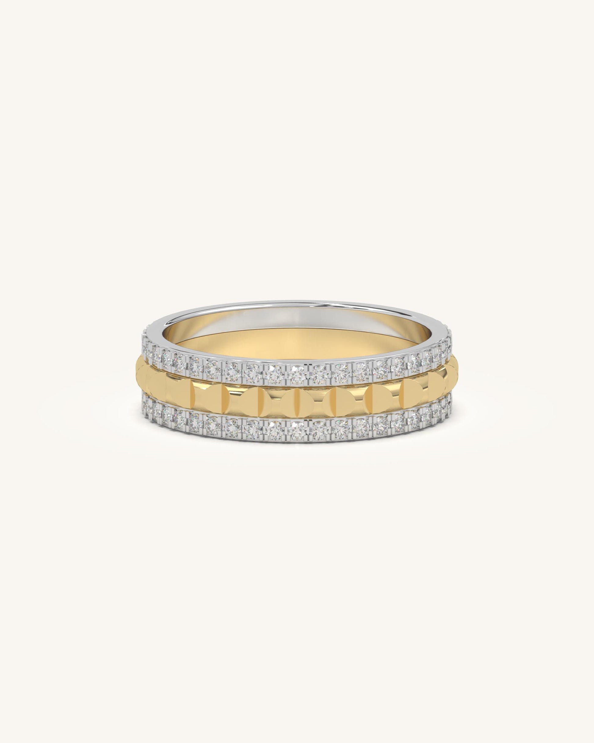 A layered band design combining polished gold and dual diamond rows for elevated sparkle. Perfect as a statement or stack Band.
