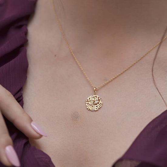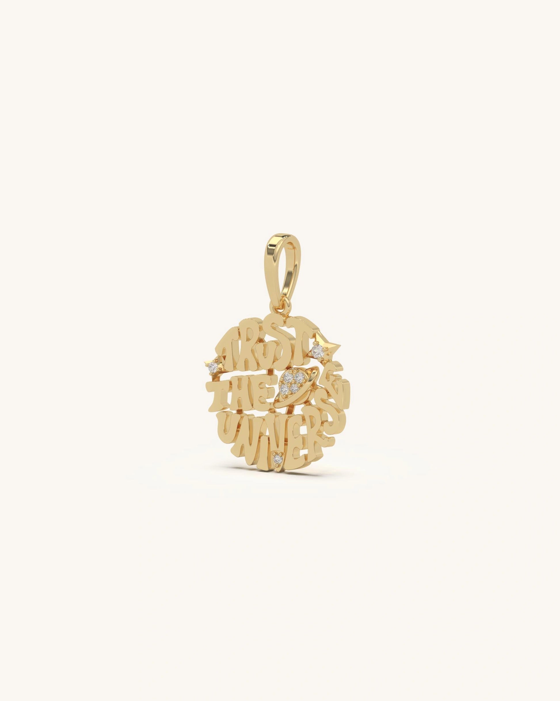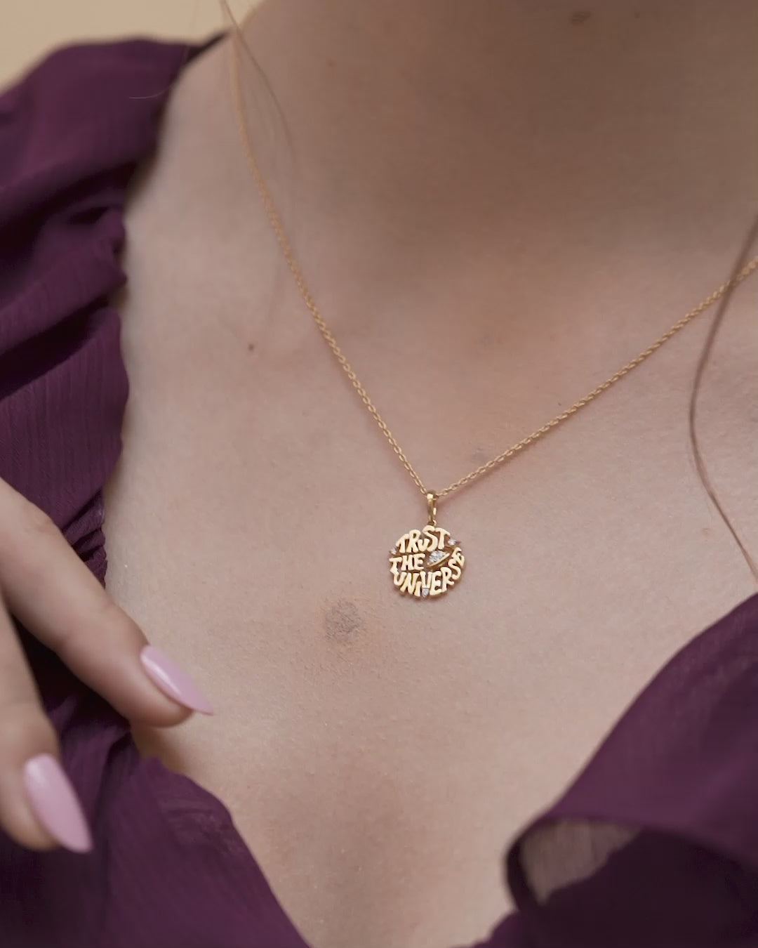 Playful round pendant with 'Trust the Universe' text design accented with a planet and star motifs in sparkle.