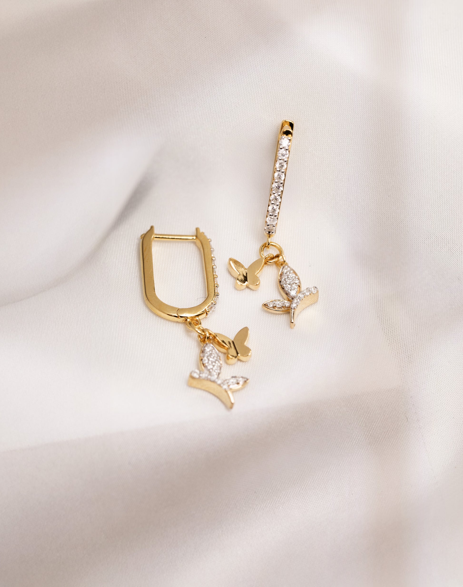 Created using 925 silver and finished in high-polish gold, these dual-butterfly drop earrings are detailed with moissanite diamonds for a balanced yet eye-catching look.