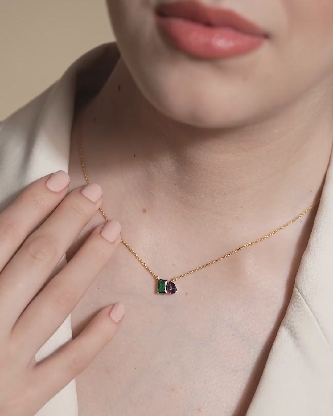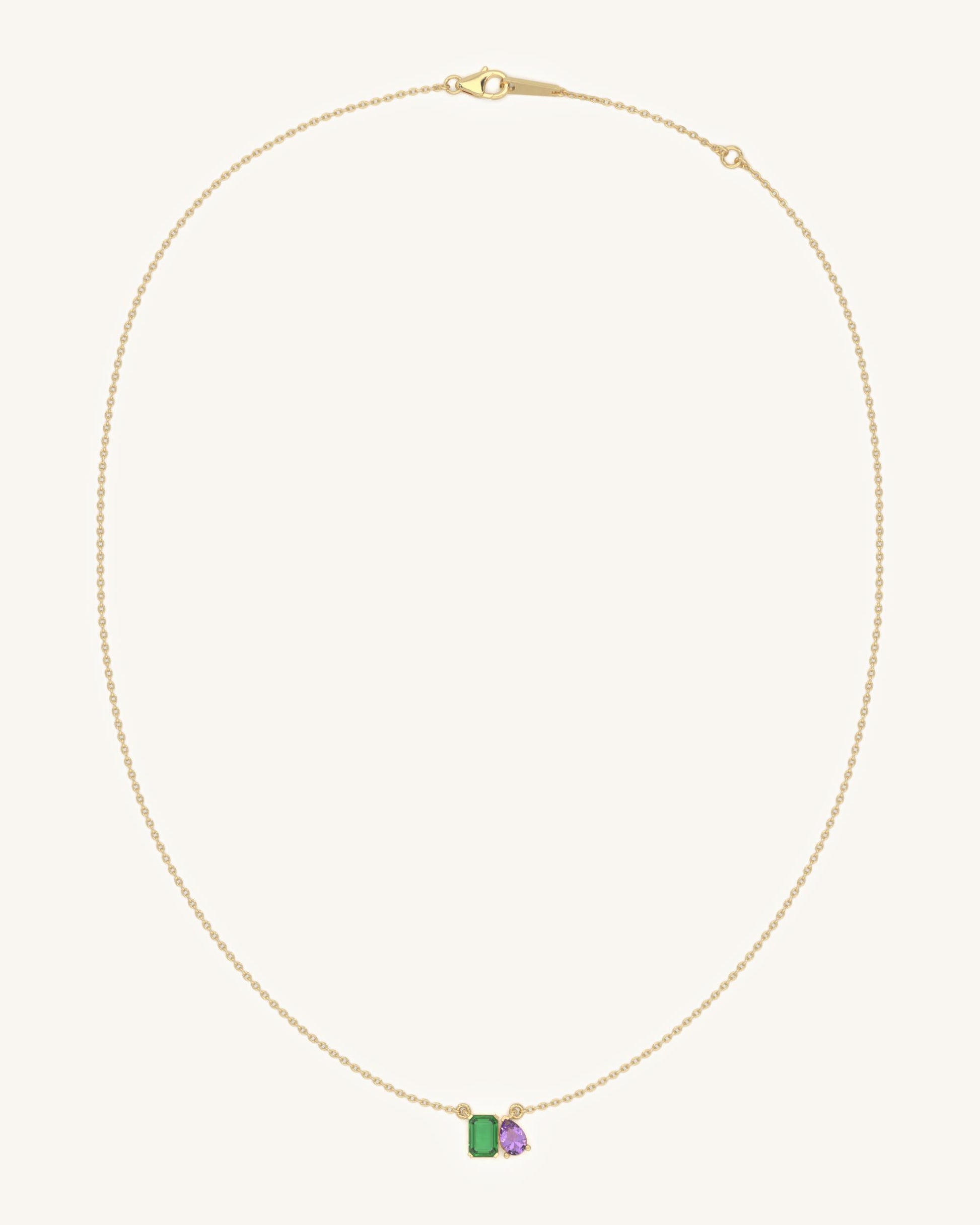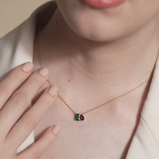 This elegant necklace features a dual charm with green and sapphire colorstones. The clean and balanced design makes it ideal for day to night wear with a soft pop of color.
